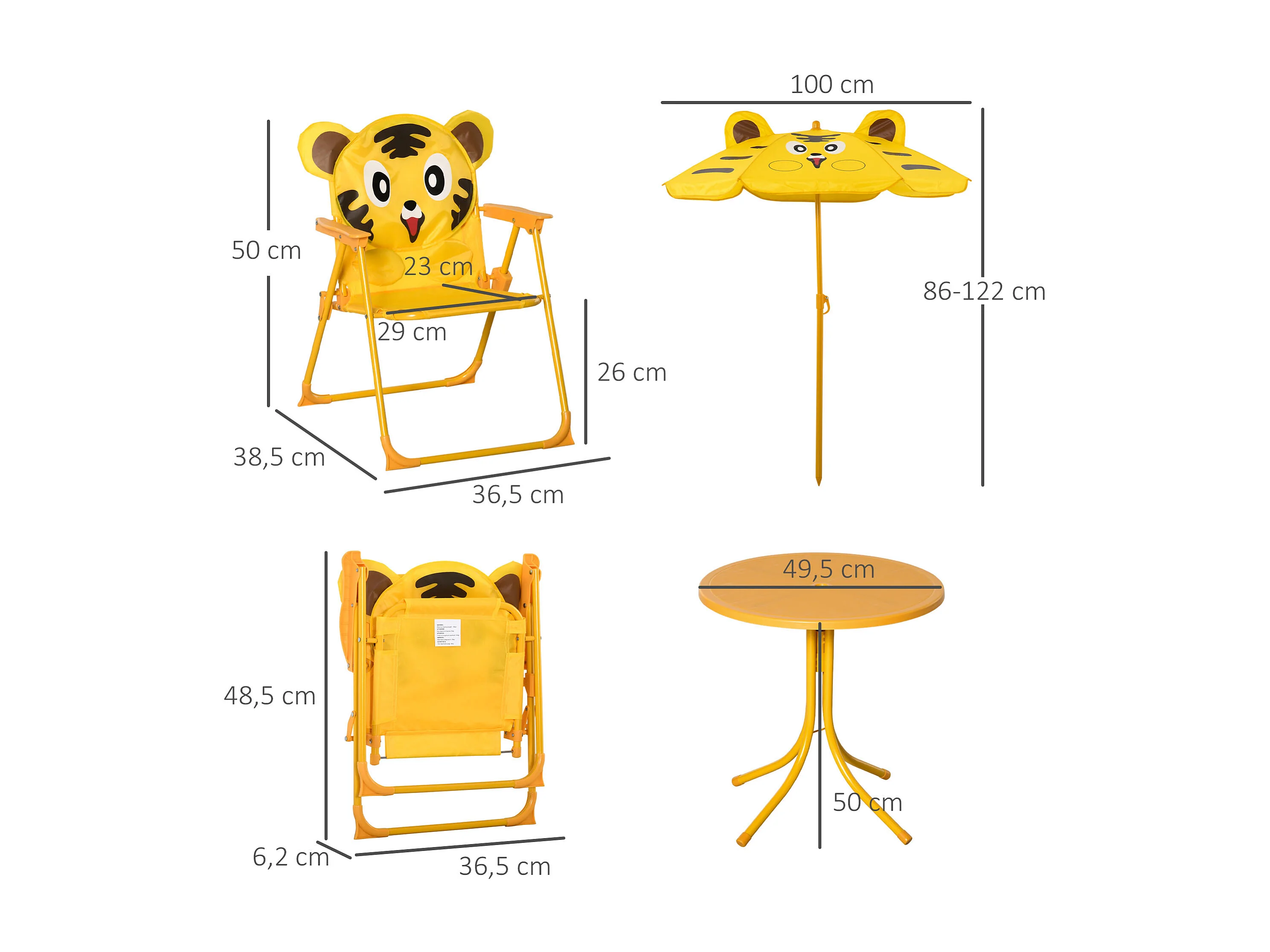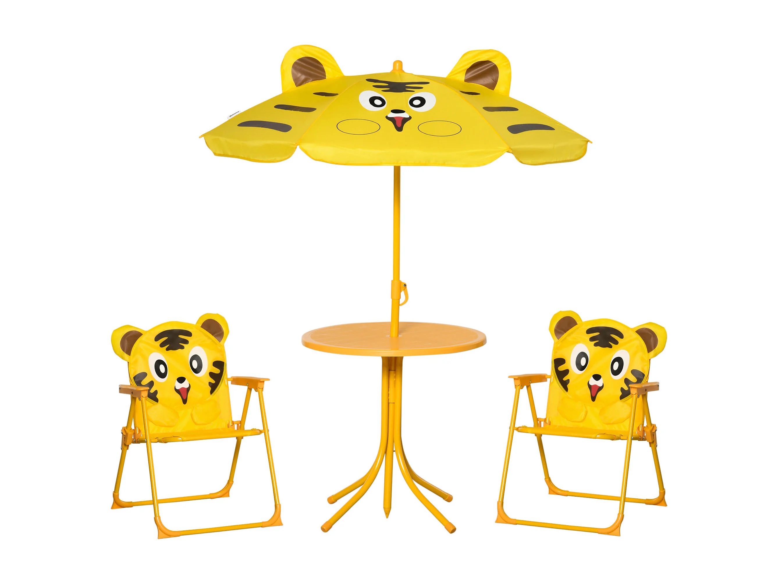 Ensemble salon de jardin enfant 4 pcs design tigre - table ronde + 2 chaises pliables + parasol - métal époxy oxford jaune