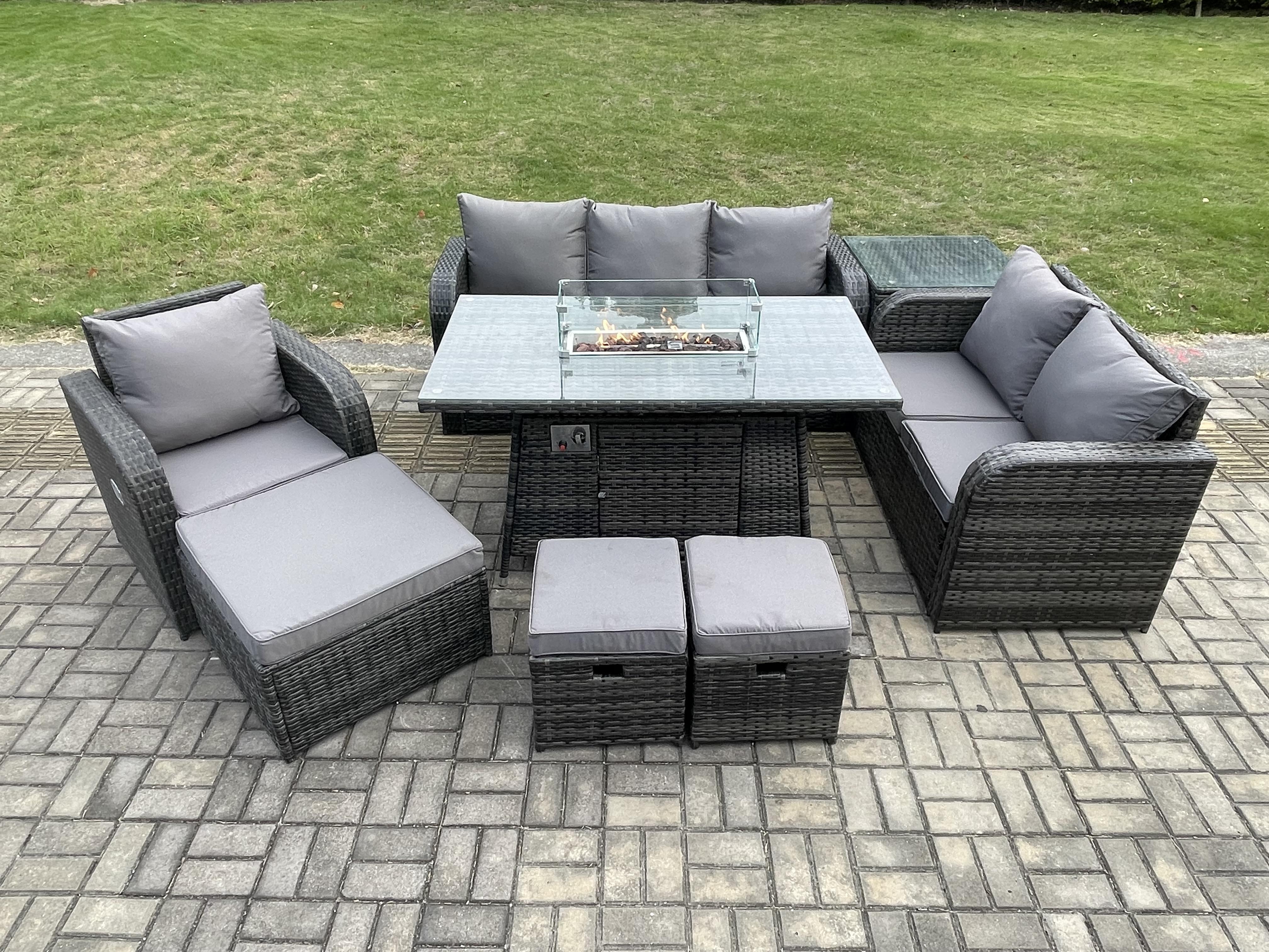 Ensemble Salon de Jardin Extérieur en polyrotin Table de foyer à gaz et Canapé Fauteuil avec Table d'appoint 3 Tabourets