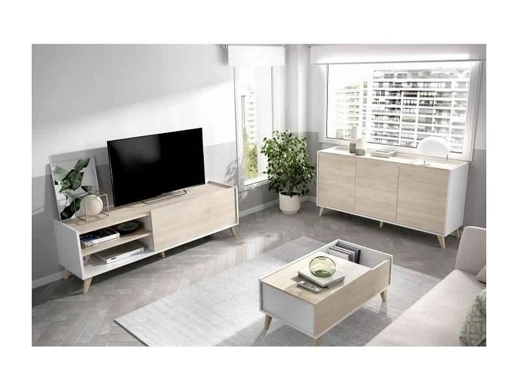 Ensemble meuble TV table basse buffet - Mélaminé - Style scandinave - chêne et blanc