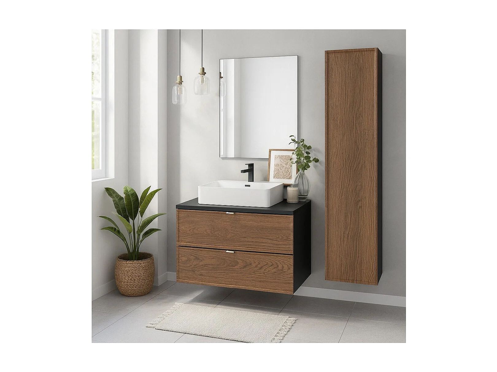 Ensemble SAVIA : meuble sous vasque 80cm + vasque blanche à poser + colonne de rangement