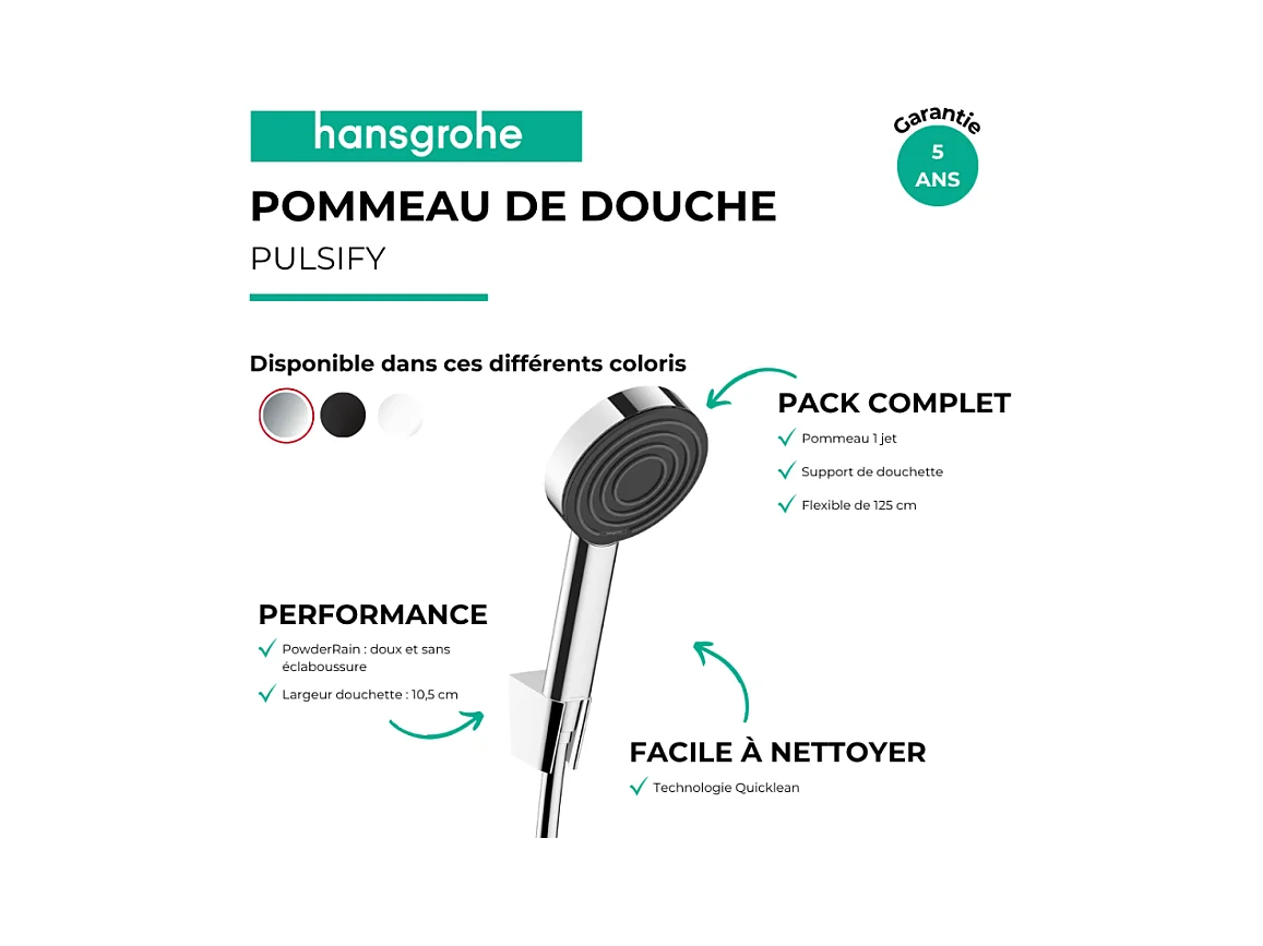 Ensemble support mural et douchette 105 1jet avec flexible 125 cm chromé Hansgrohe Pulsify