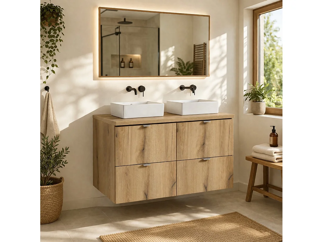 Ensemble suspendu VANO aspect chêne 100cm : meubles sous vasque à tiroirs + plan pour vasque + vasques à poser rectangulaires