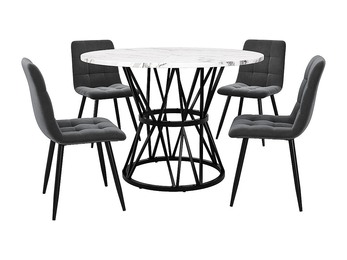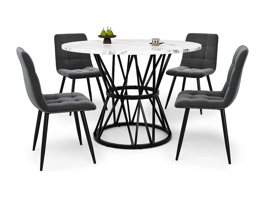 Ensemble table à manger 5 pièces 4 chaises moderne table ronde 100cm pieds noir plateau marbré chaises velours gris