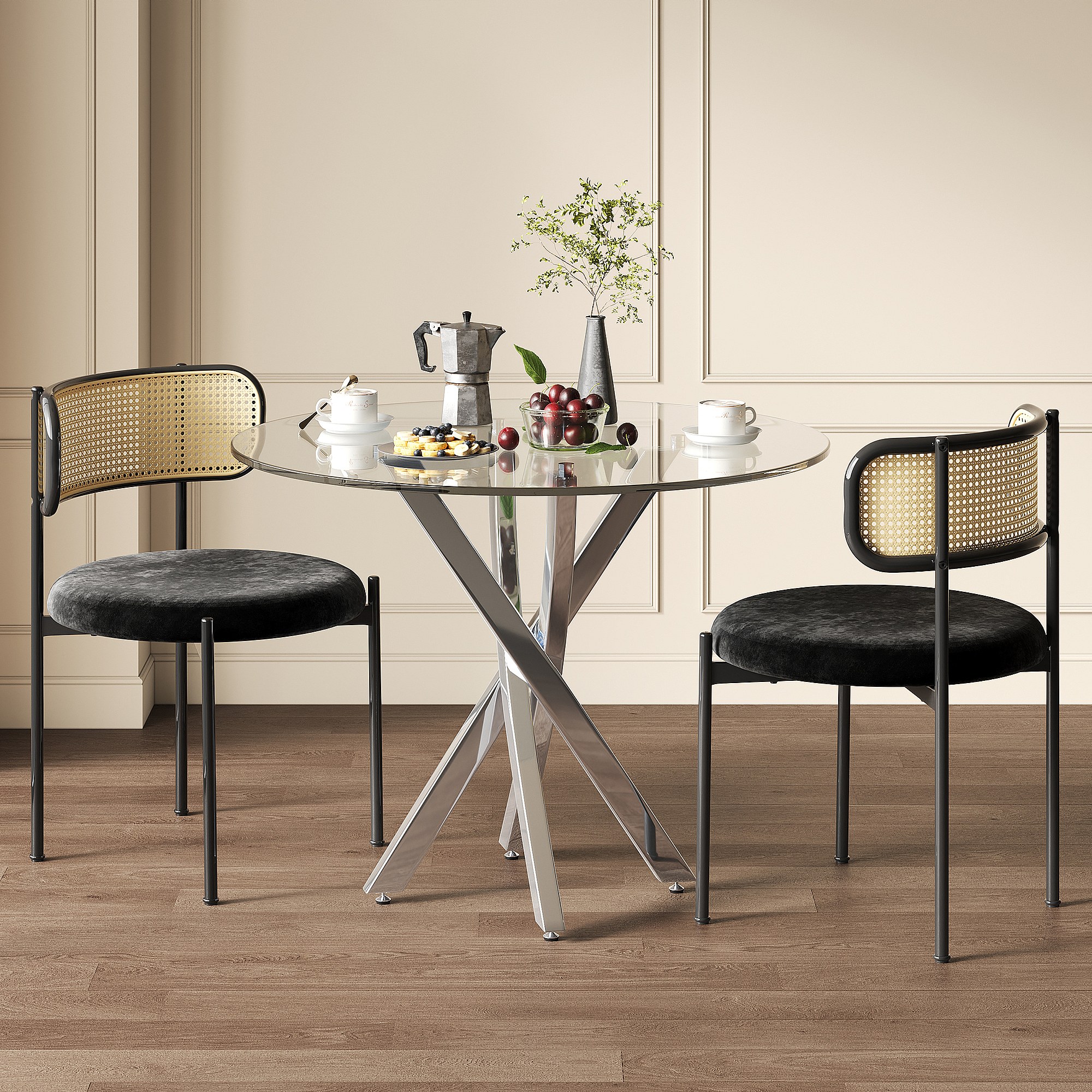 Ensemble table à manger avec 2 chaises - Table en verre transparent et chaises noir- pieds argentés