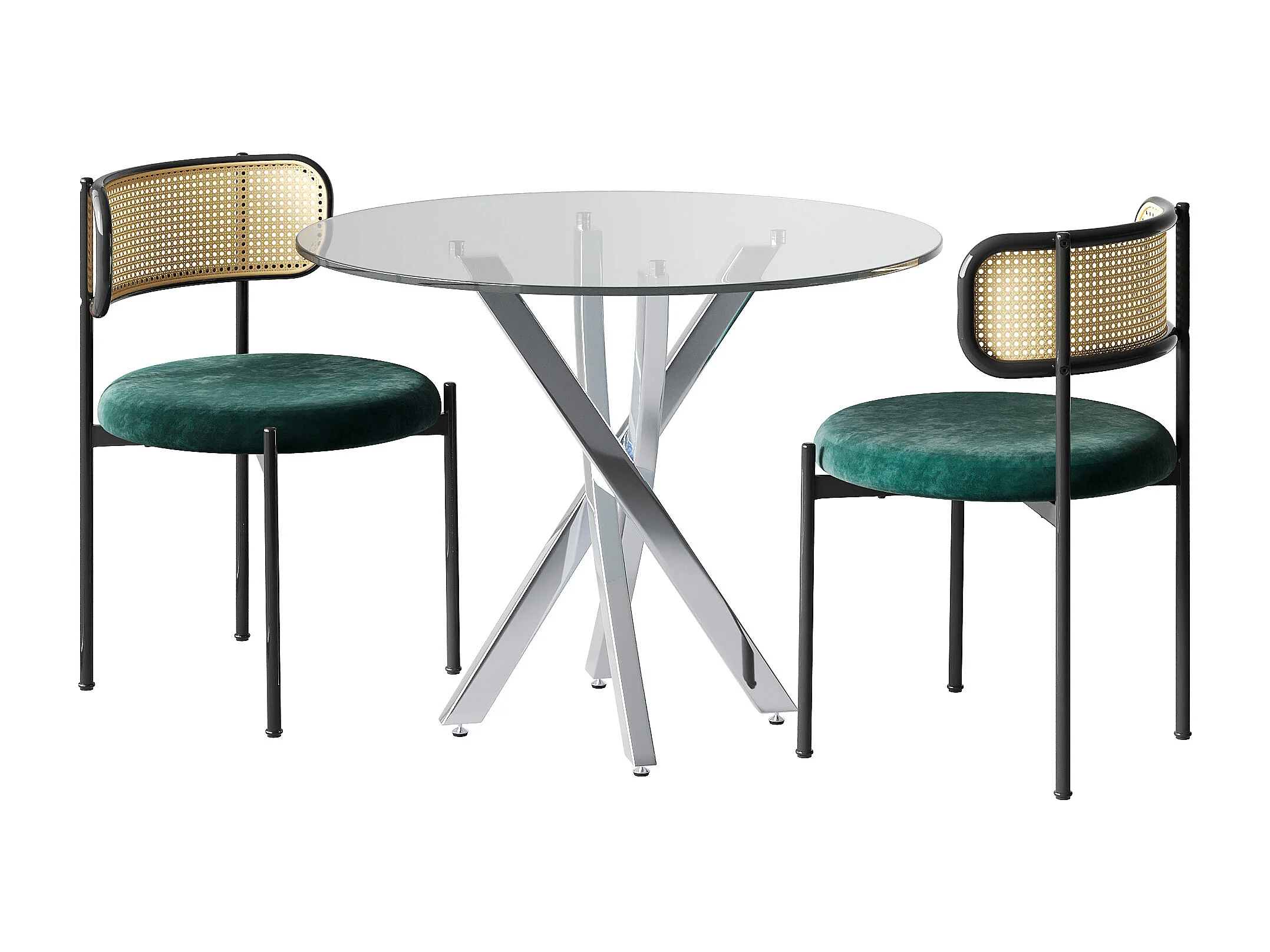 Ensemble table à manger avec 2 chaises - Table en verre transparent et chaises vert- pieds argentés