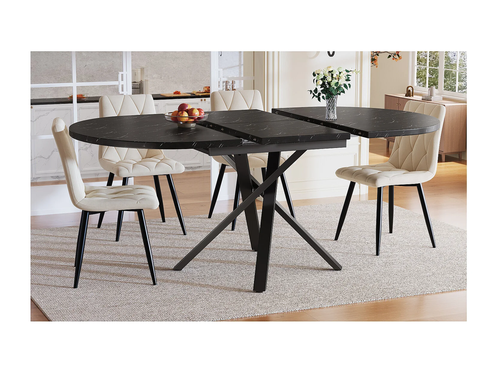Ensemble table à manger extensible 100-140 cm + 4 chaises velours beige - Plateau effet marbre