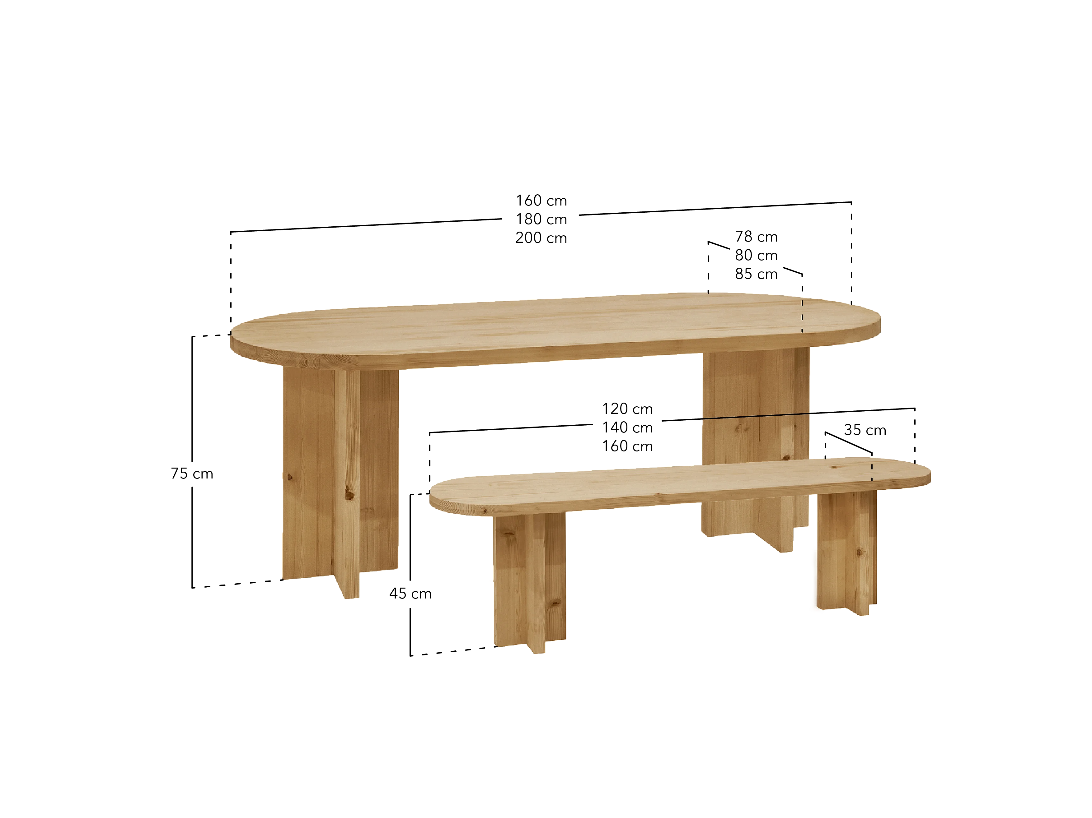 Ensemble table à manger ovale et banc en bois de sapin beige 160x75cm - TOKYO - DECOWOOD