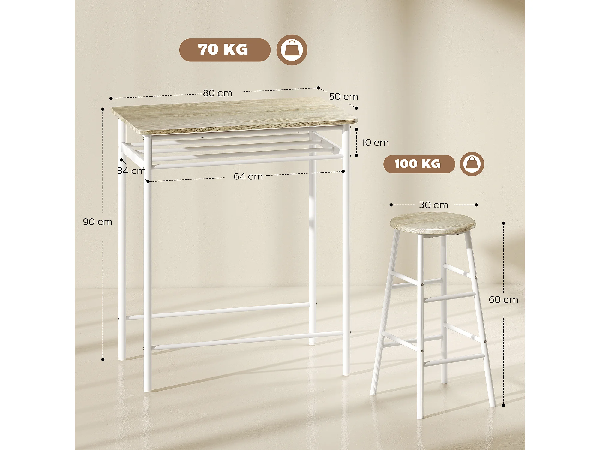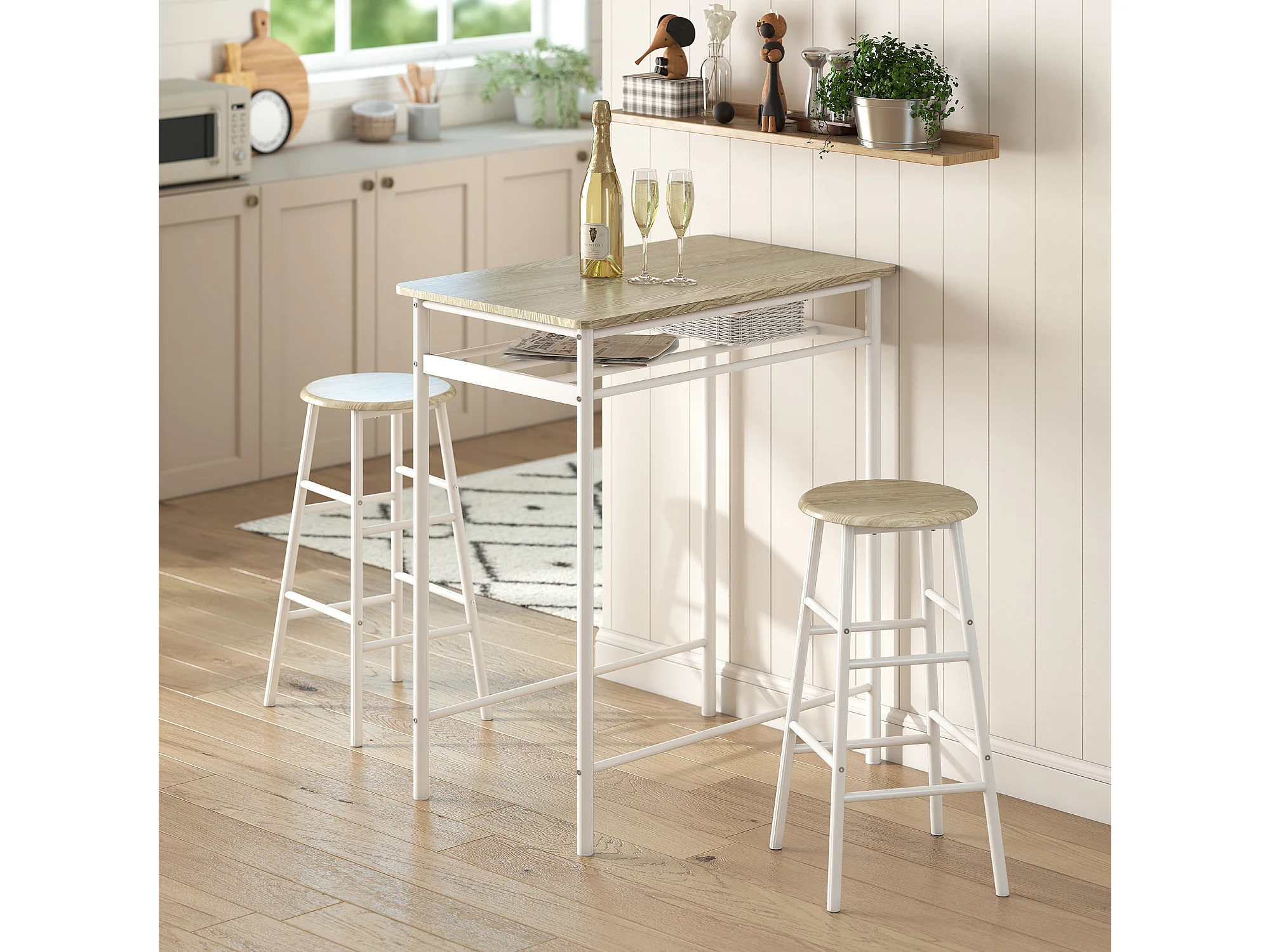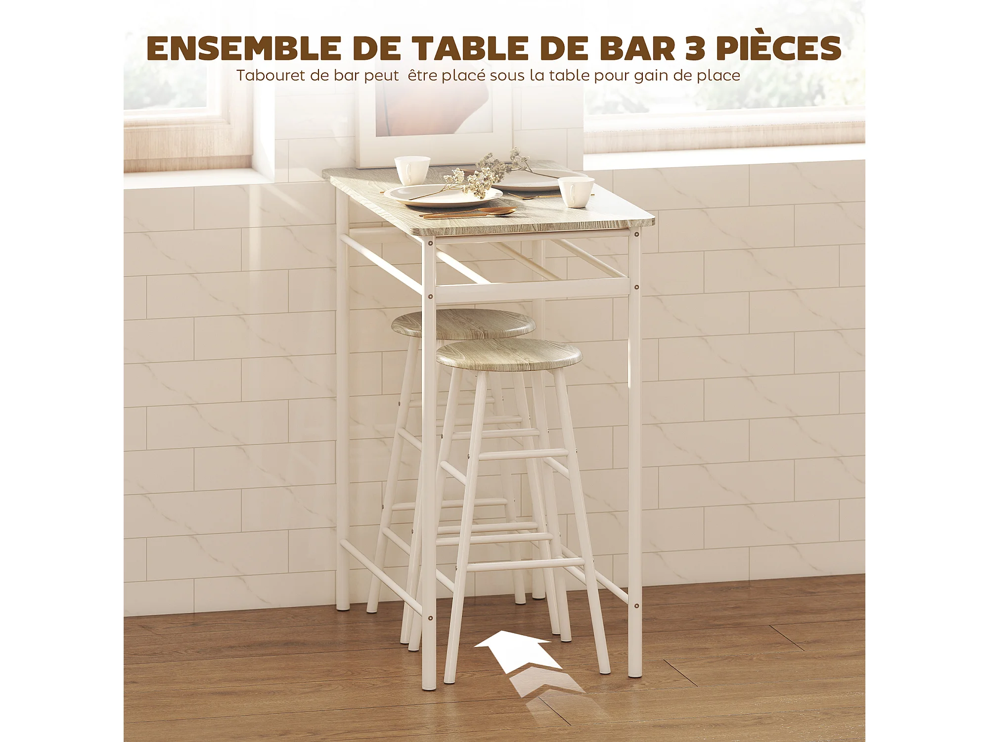 Ensemble table de bar 2 tabourets avec étagère à barreaux métal blanc effet bois clair