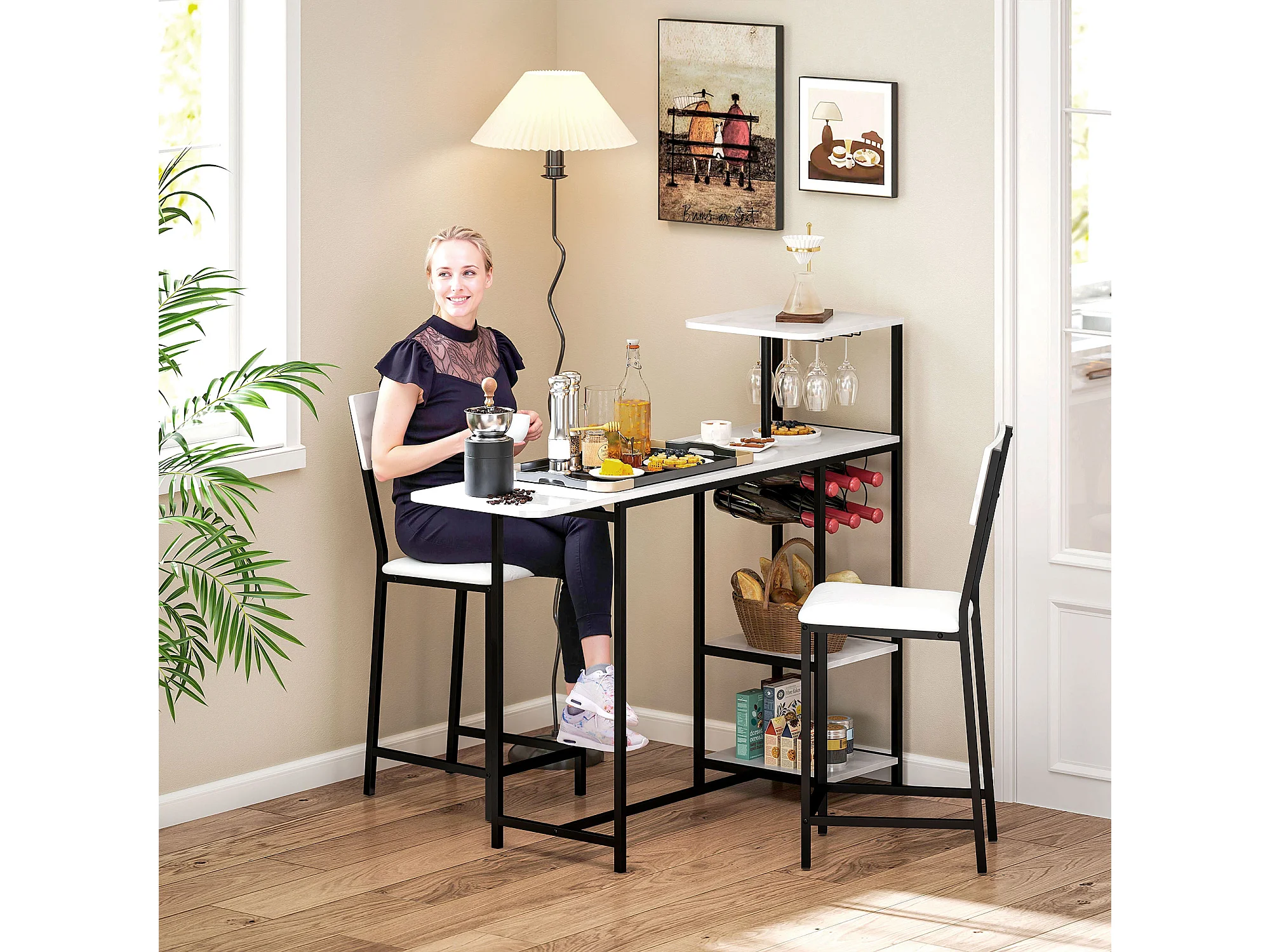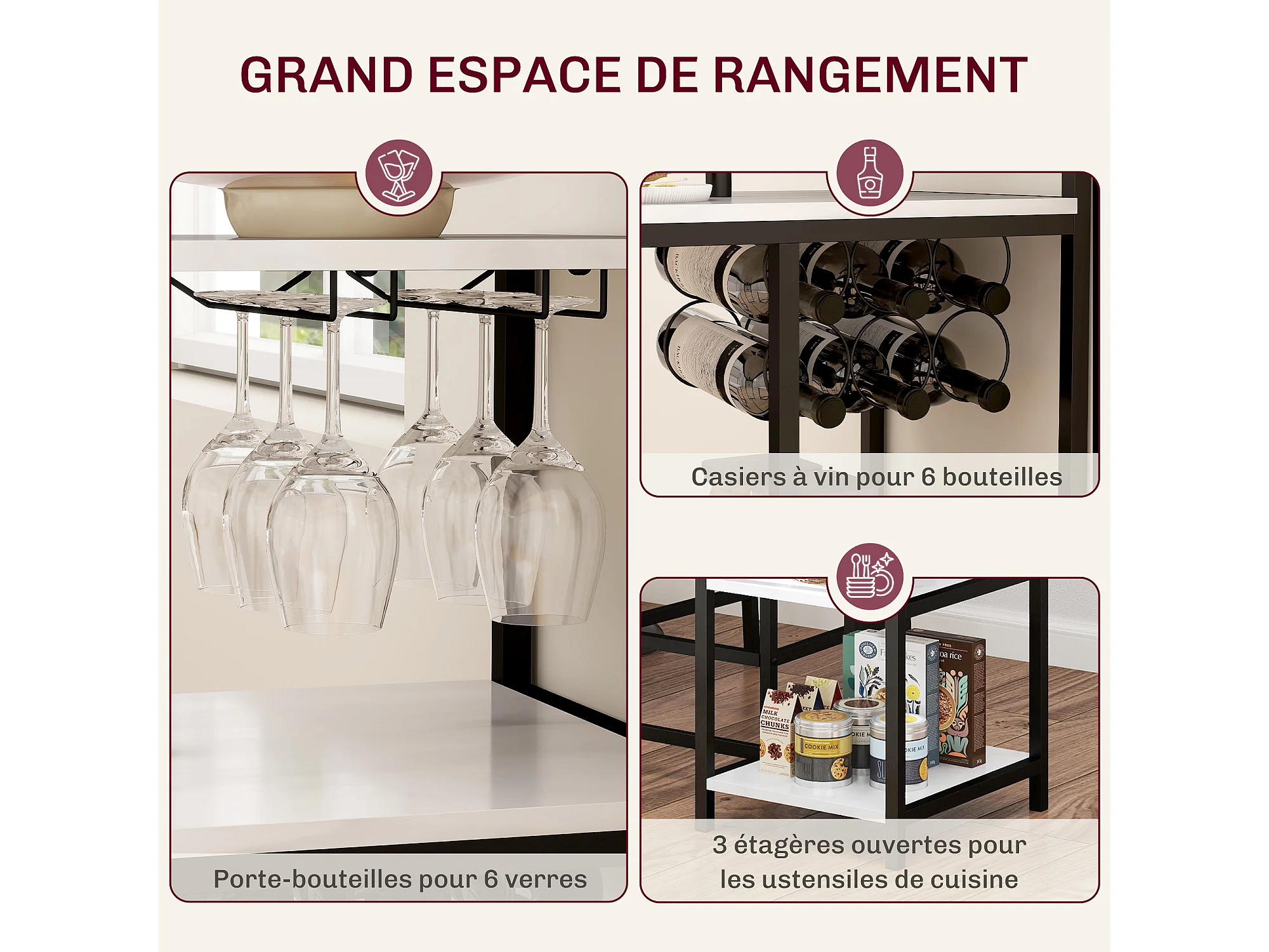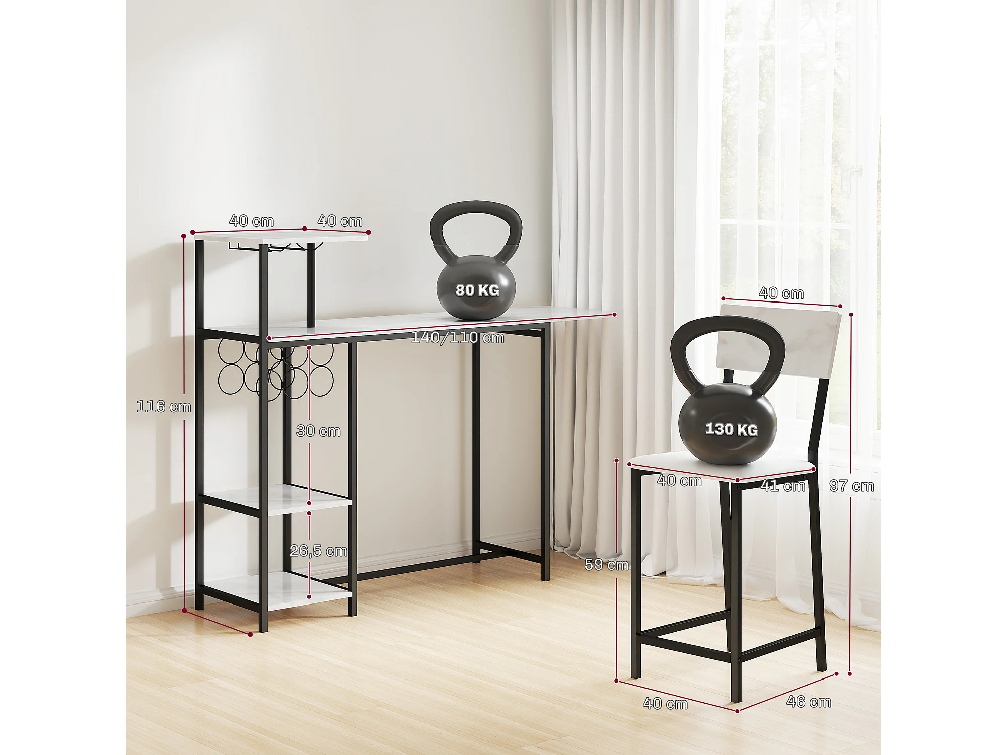 Ensemble table de bar 2 tabourets - table à rabat, casiers à vin 6 bouteilles, porte-verres, 3 étagères - acier noir effet marbre blanc