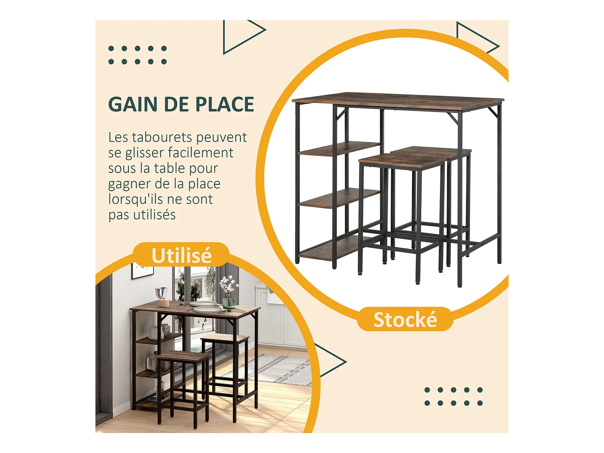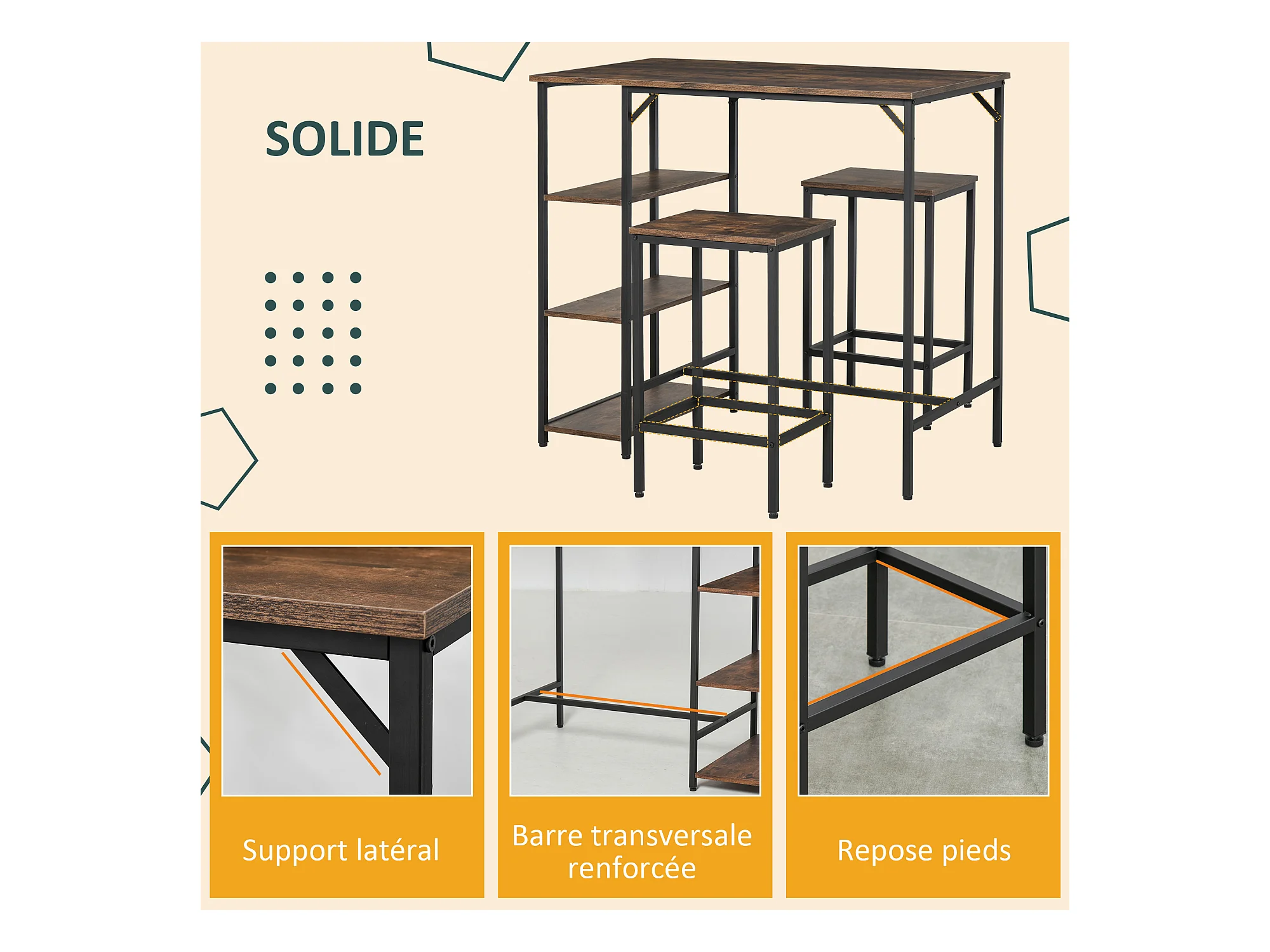 Ensemble table de bar 3 étagères 2 tabourets style industriel métal noir aspect vieux bois veinage