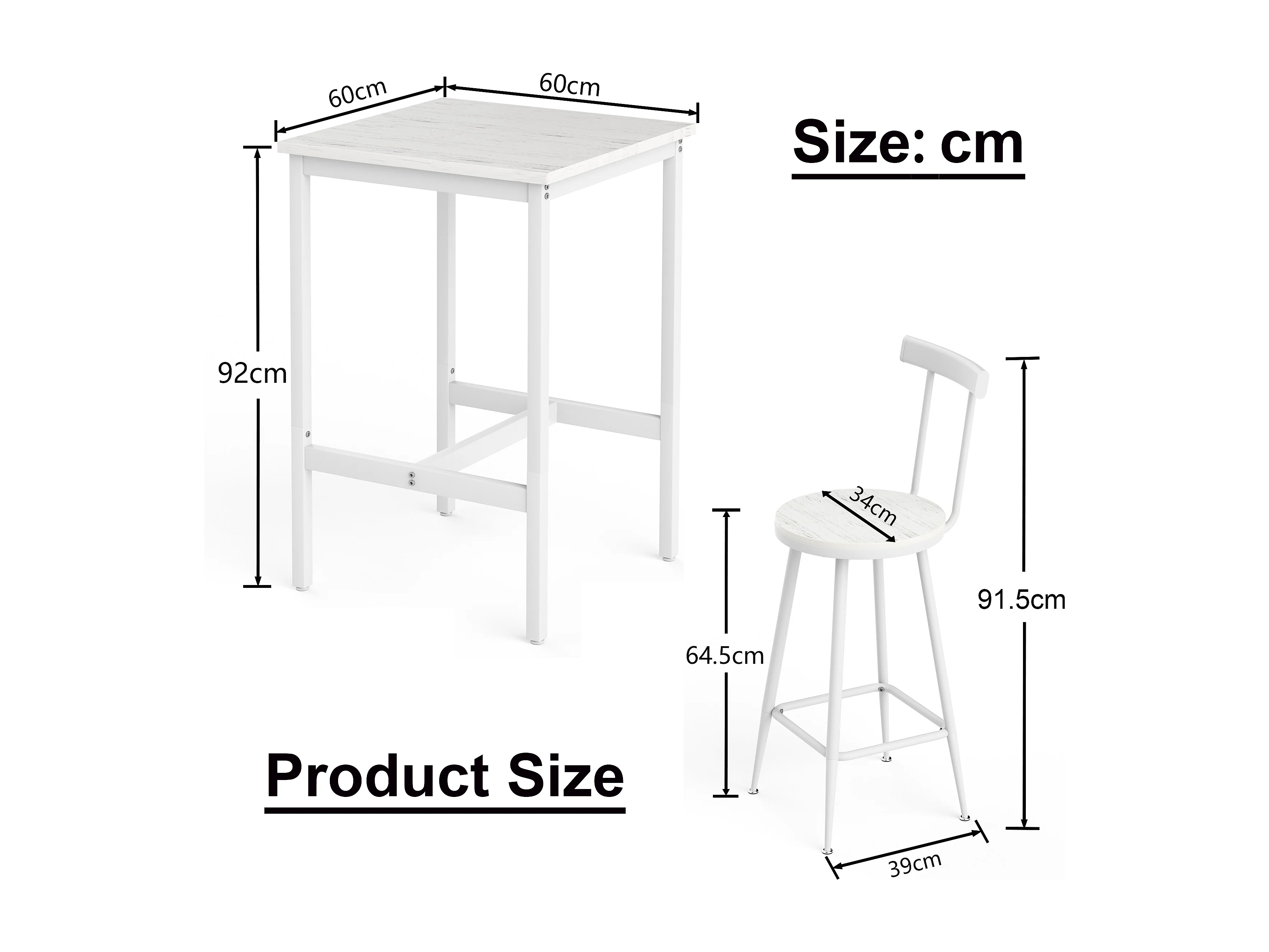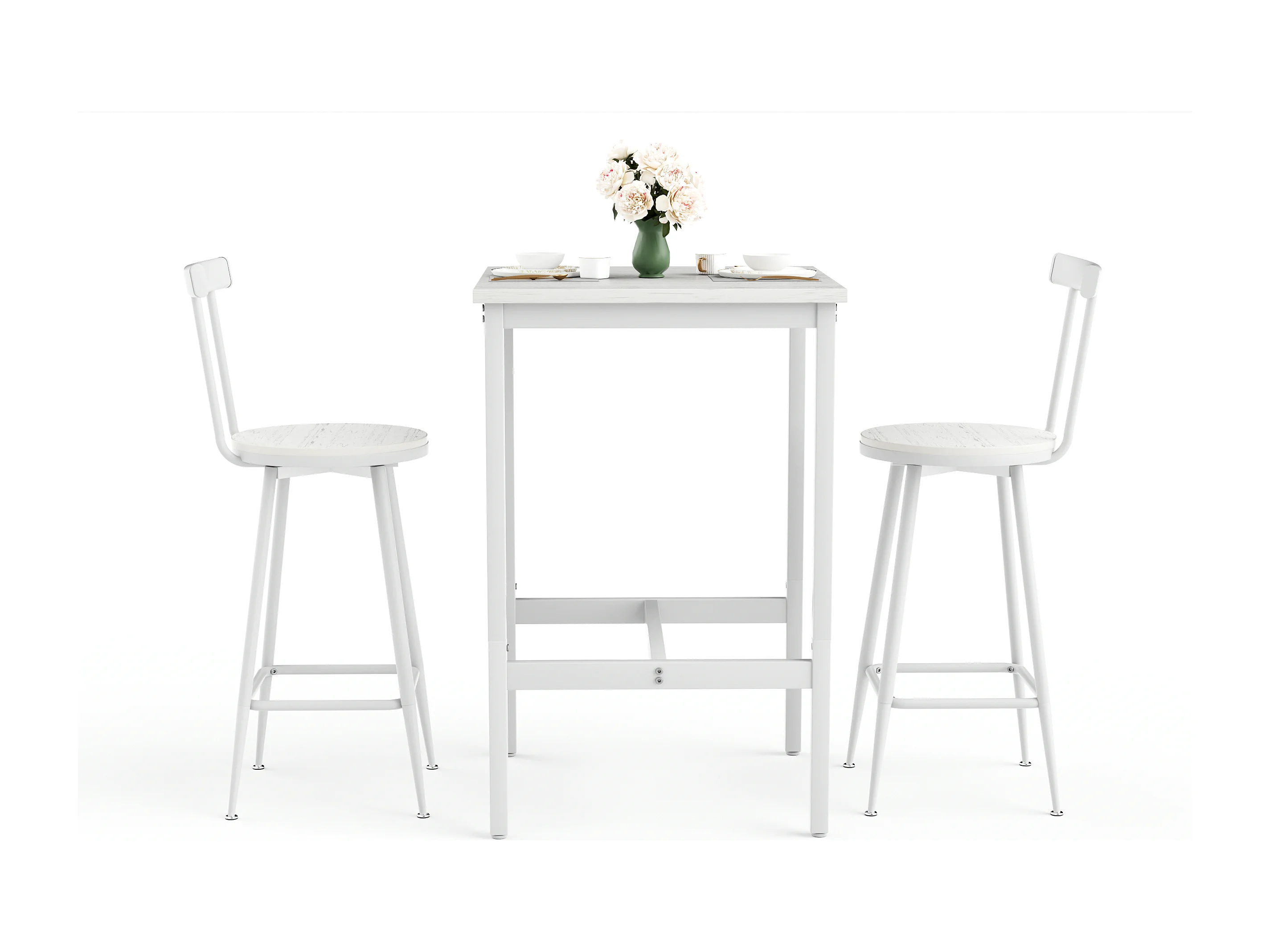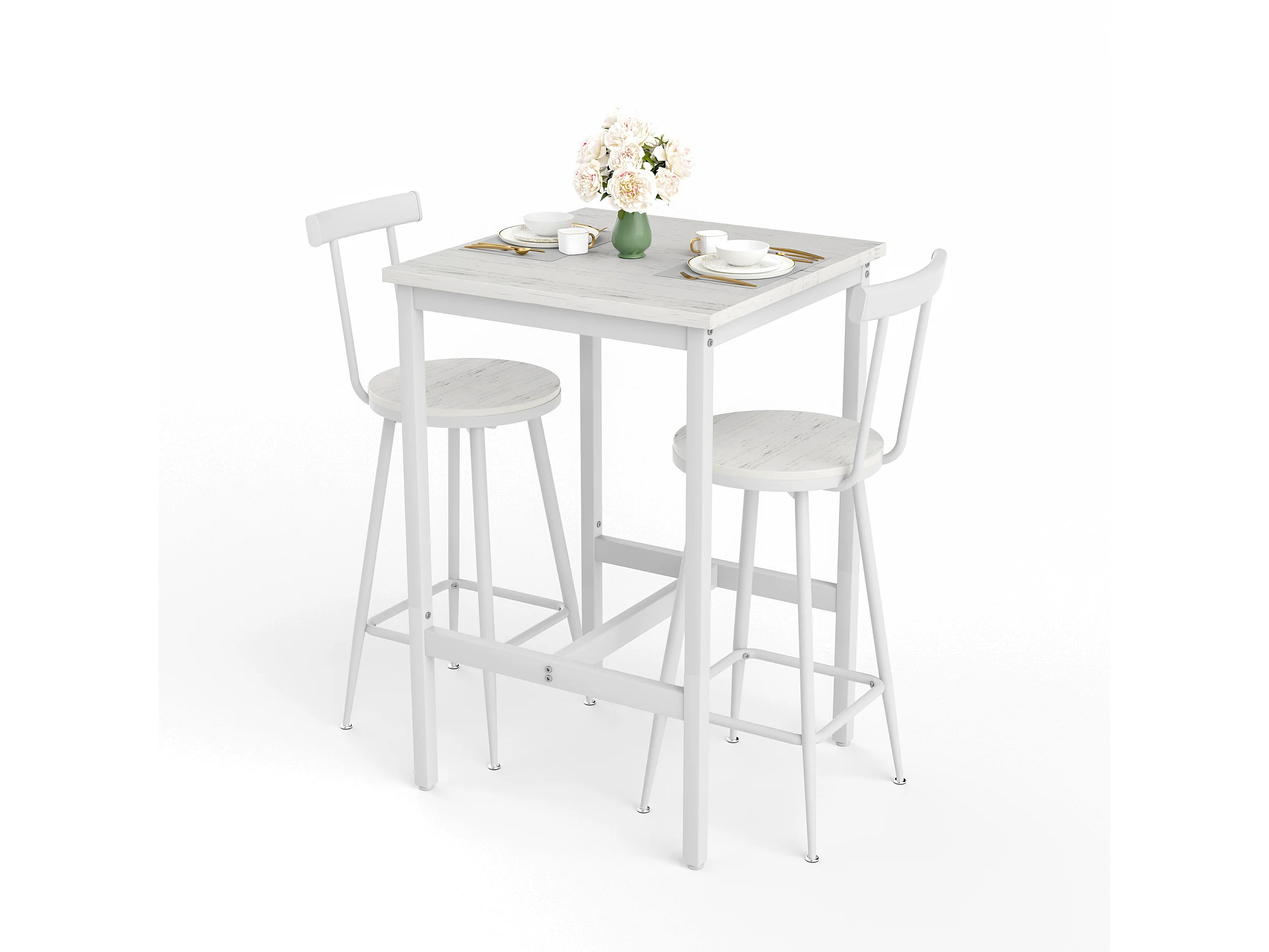Ensemble table de bar 60x60 cm avec 2 tabourets, bois et métal blanc