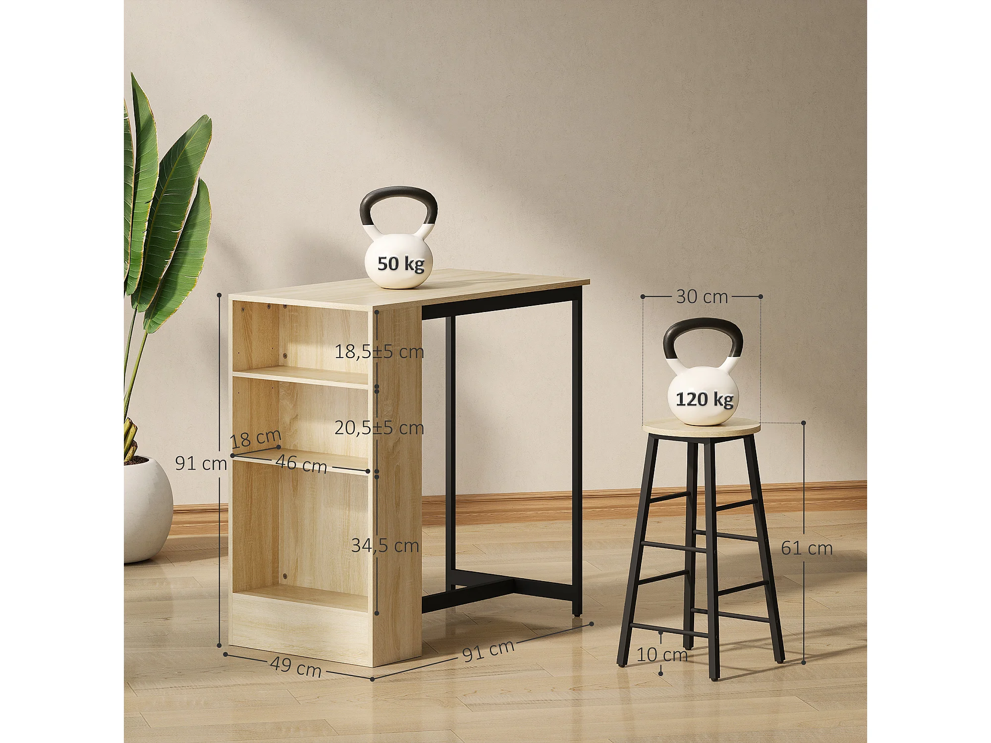 Ensemble table de bar avec 2 tabourets - 3 étagères - acier noir effet bois de chêne clair