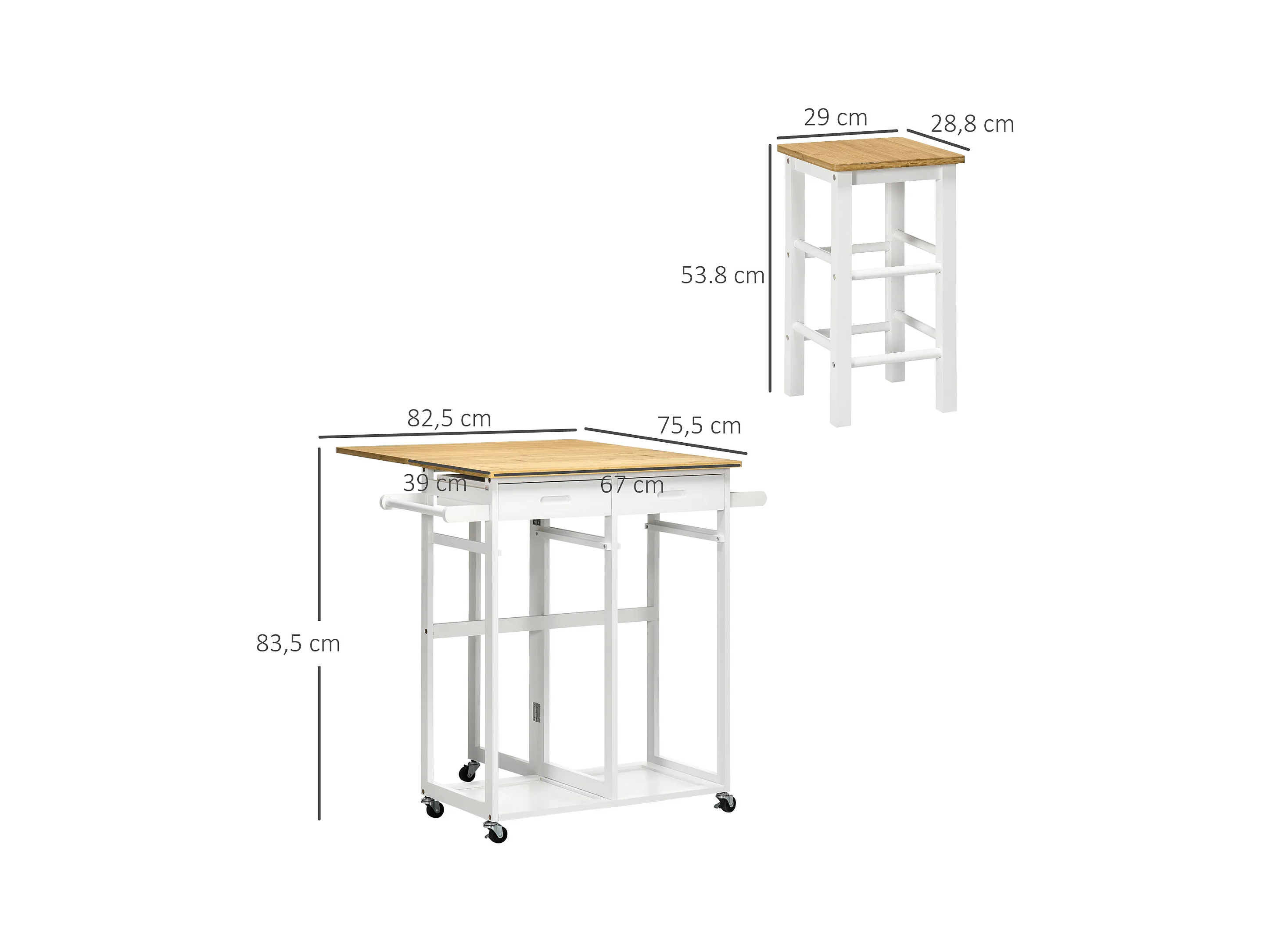 Ensemble table de bar pliable sur roulettes avec 2 tiroirs - 2 tabourets inclus - bois bambou verni et blanc