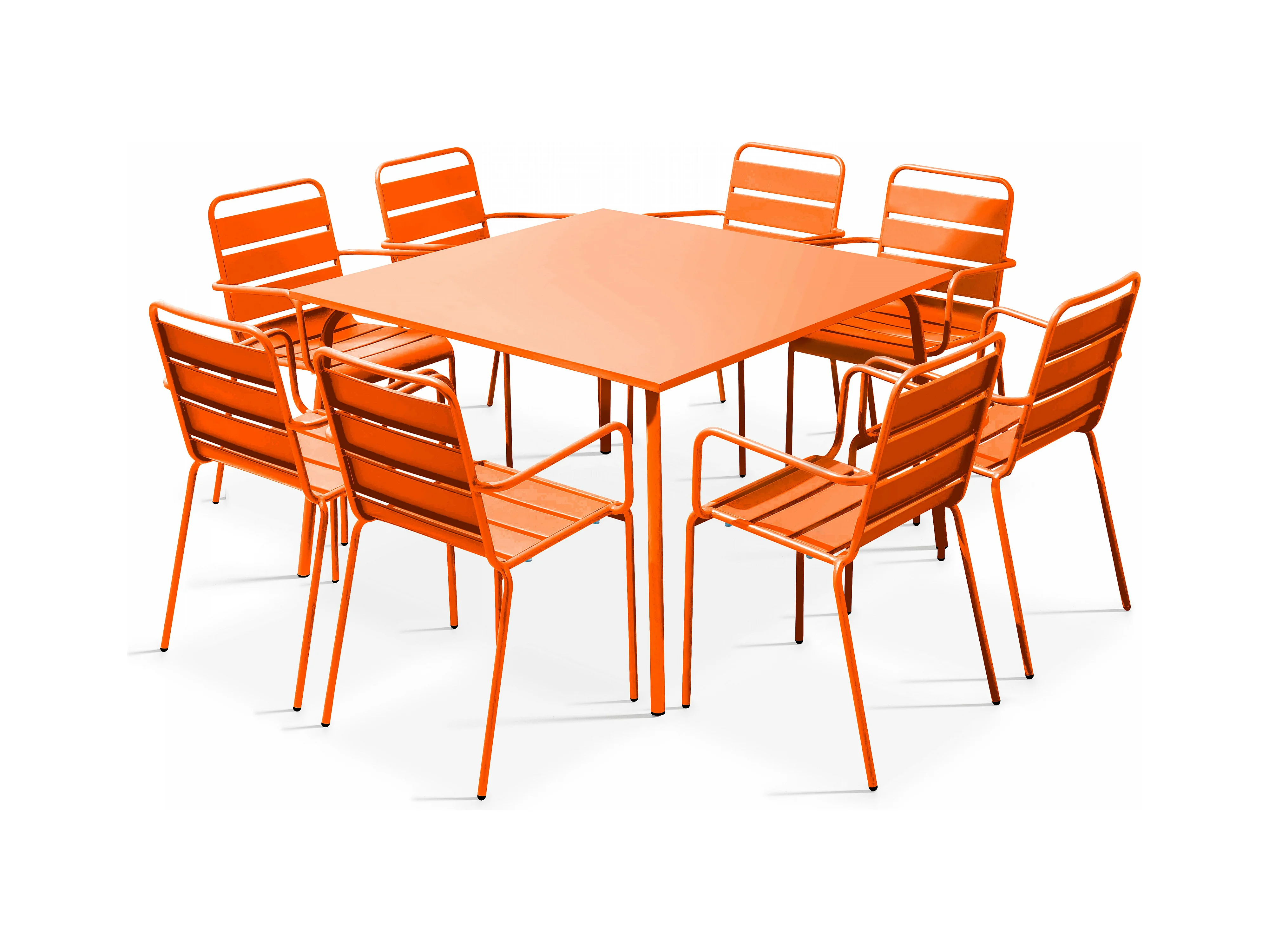Ensemble table de jardin carrée et 8 fauteuils en métal orange - Palavas
