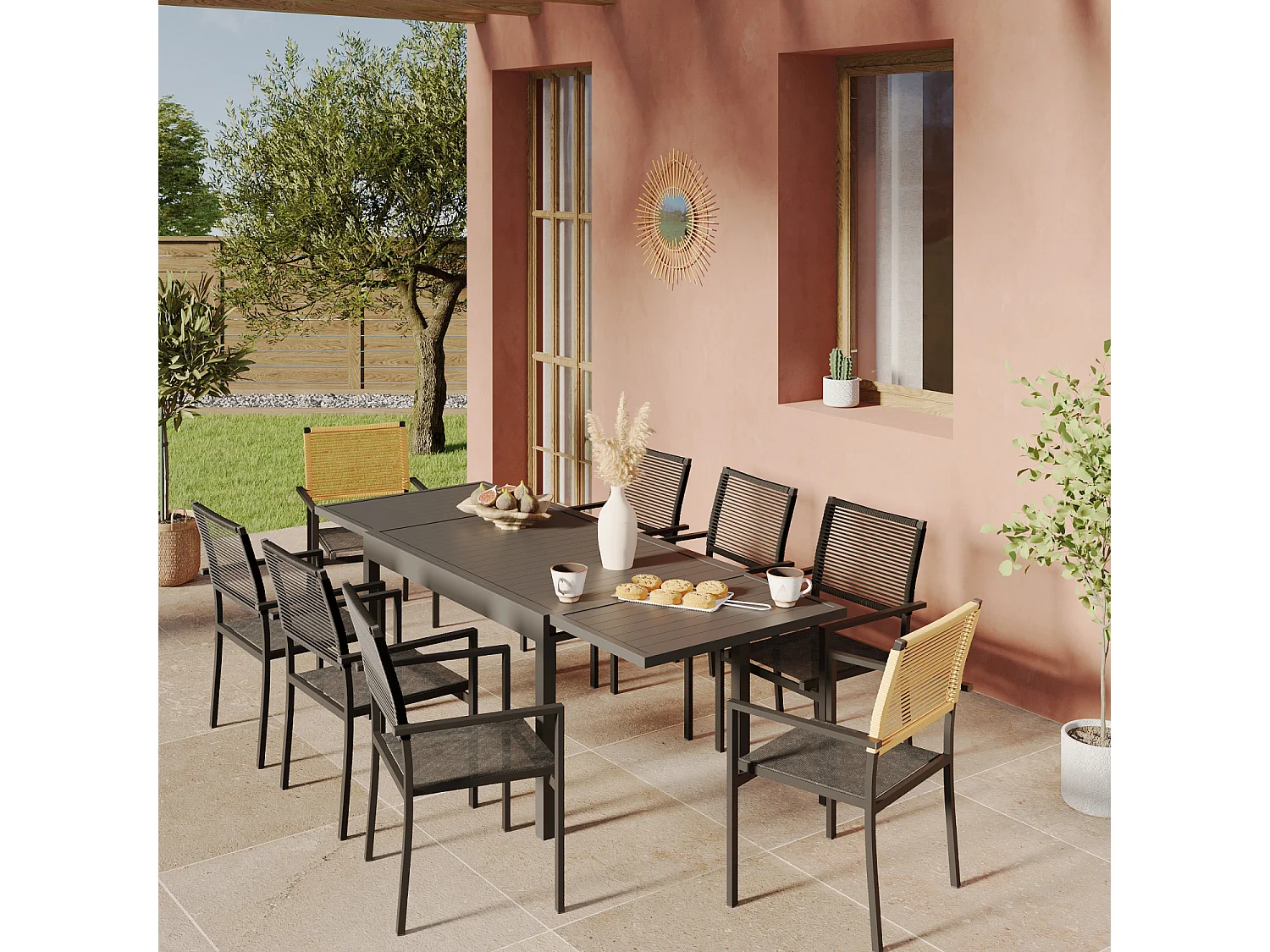 Ensemble Table de jardin extensible aluminium 135/270cm + 8 Fauteuils empilables corde Anthracite et Beige - YERAZ 8