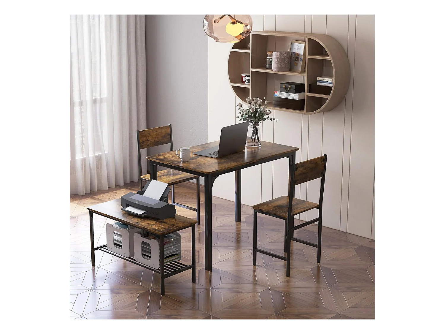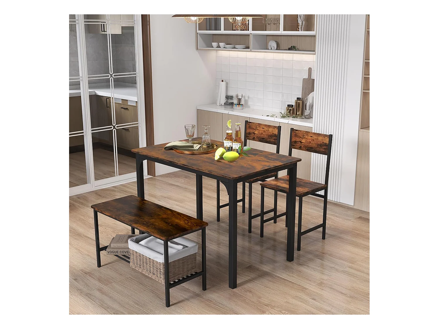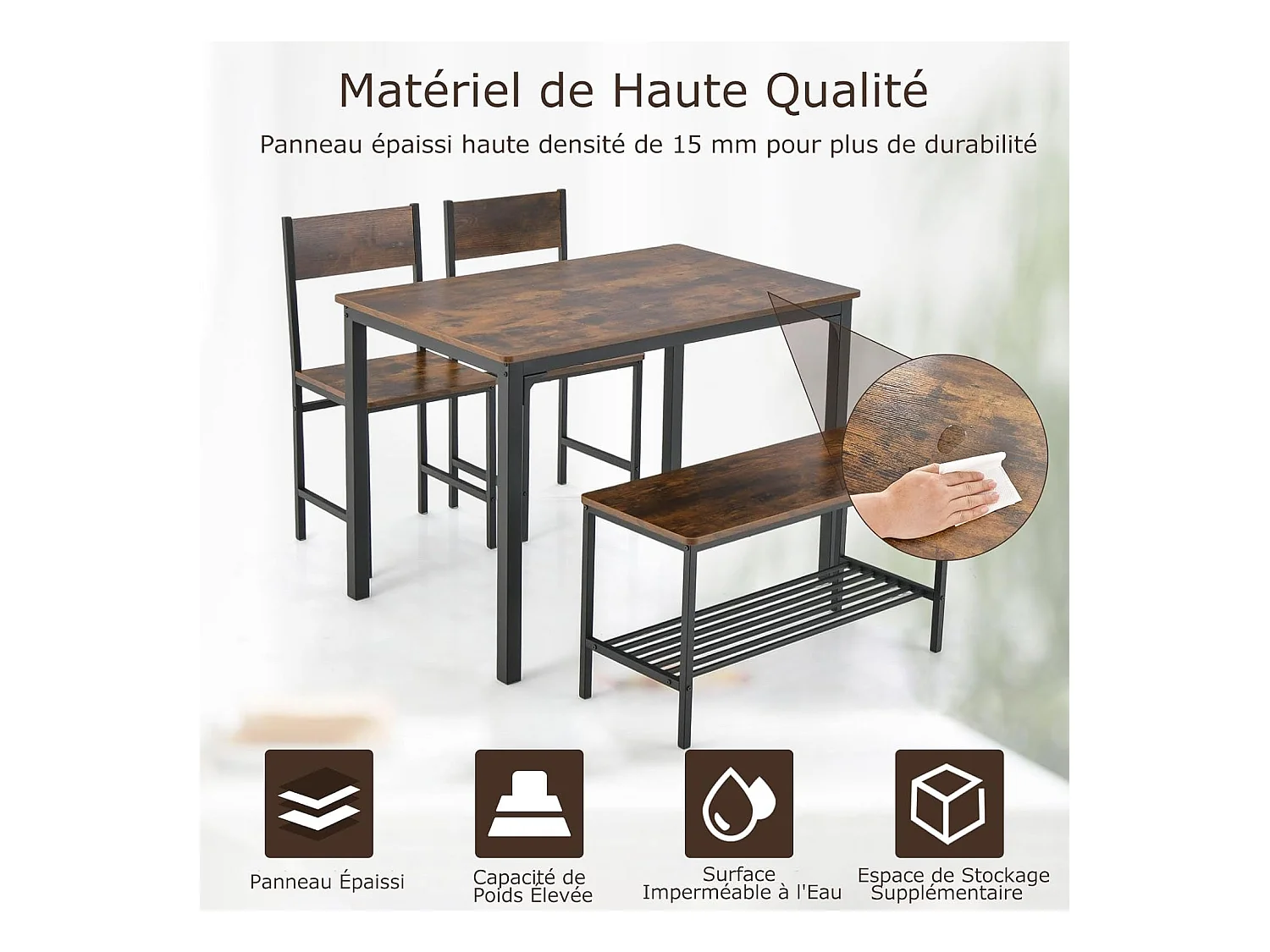 Ensemble table et 2 chaise 1 banc, cadre en métal,avec 2 chaises industrielle 110 x 70 cm