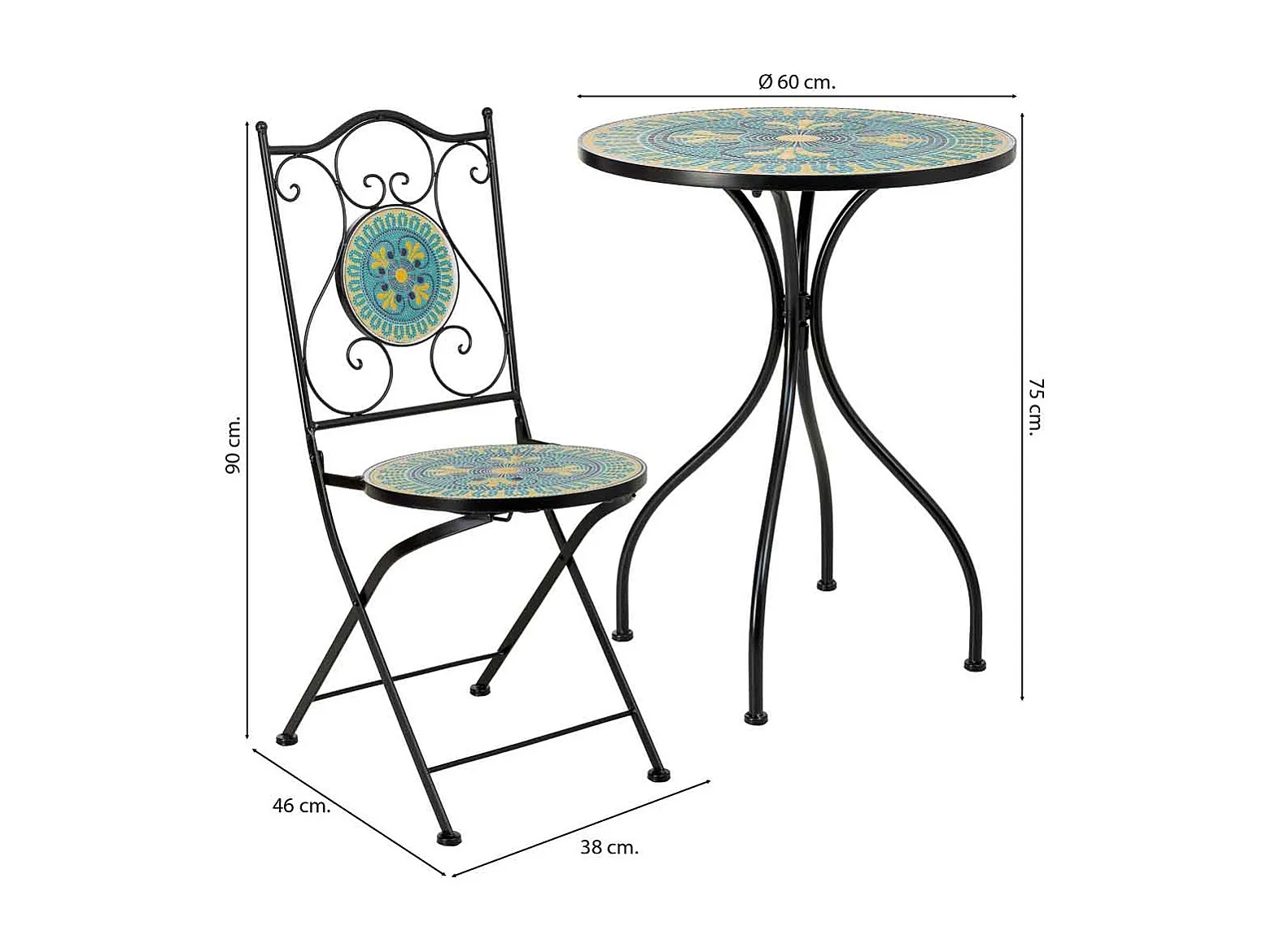Ensemble table et 2 chaises en métal multicolore, 60 x 60 x 75 cm et 38 x 46 x 90 cm