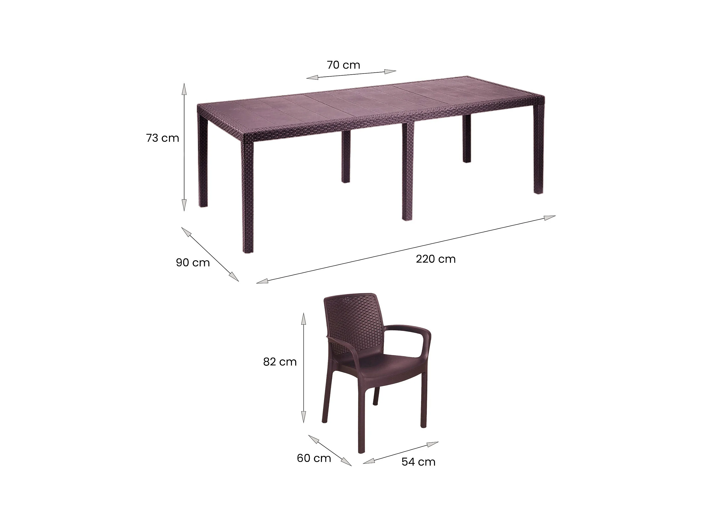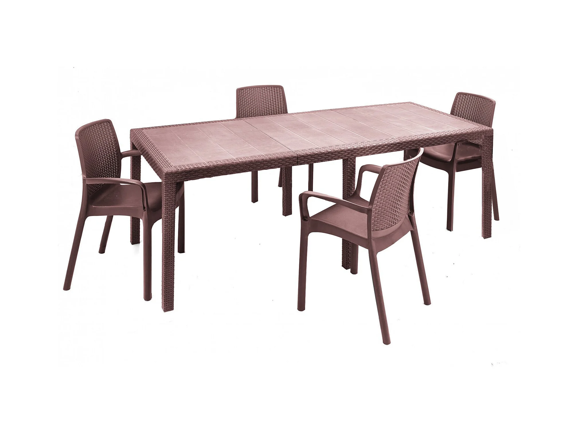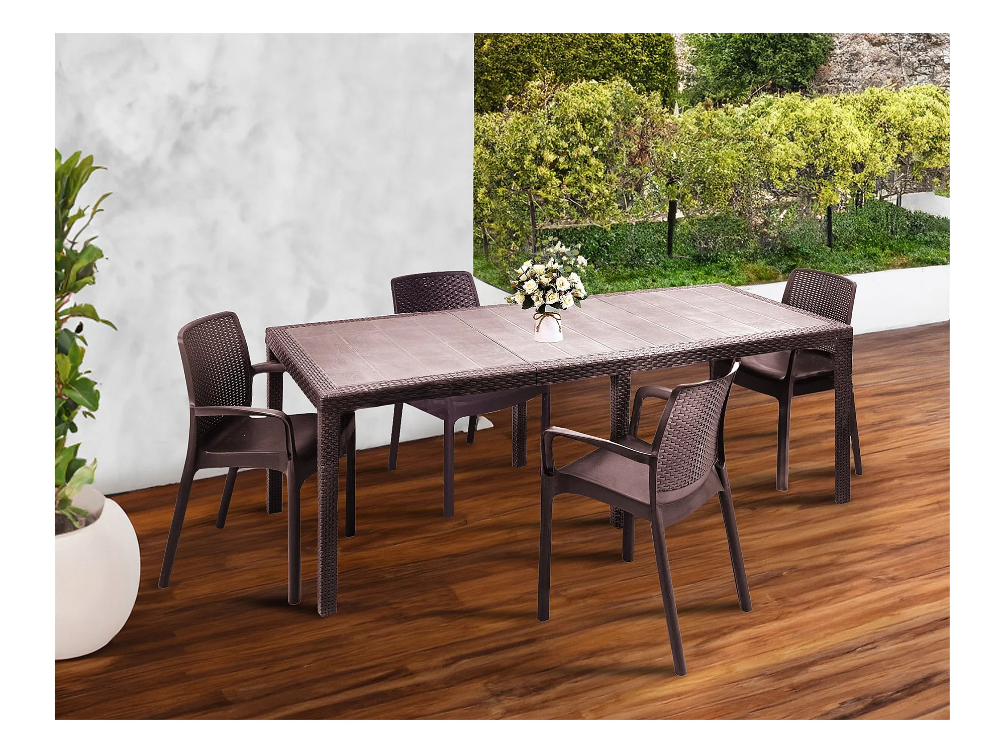 Salón de exterior Arret, Mesa extensible de exterior con 4 sillas, mesa y asientos de jardín efecto ratán, 100% Made in Italy, Marrón