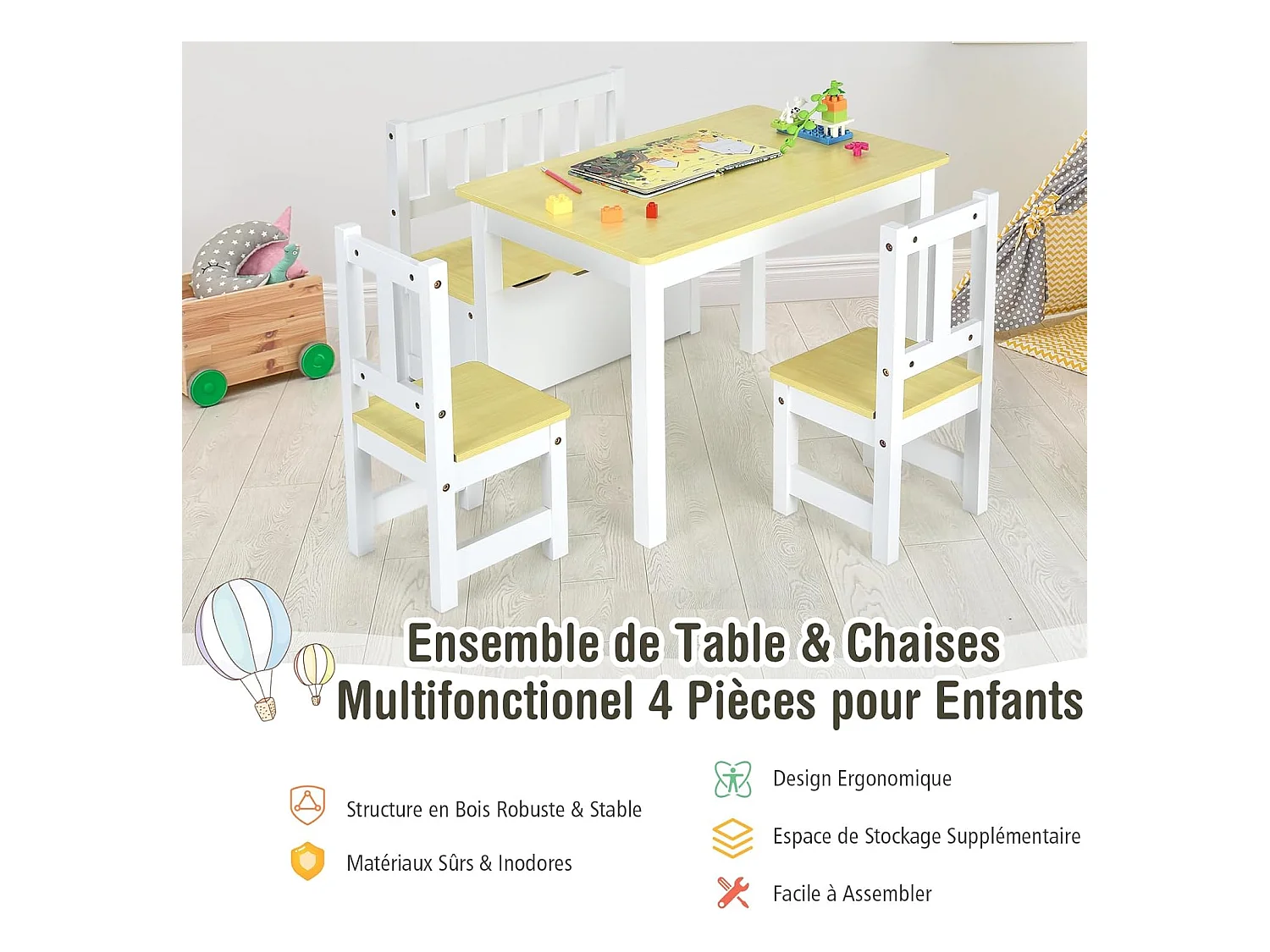 Ensemble table et chaises pour enfants, table et 2 chaises et 1 banc (naturel)
