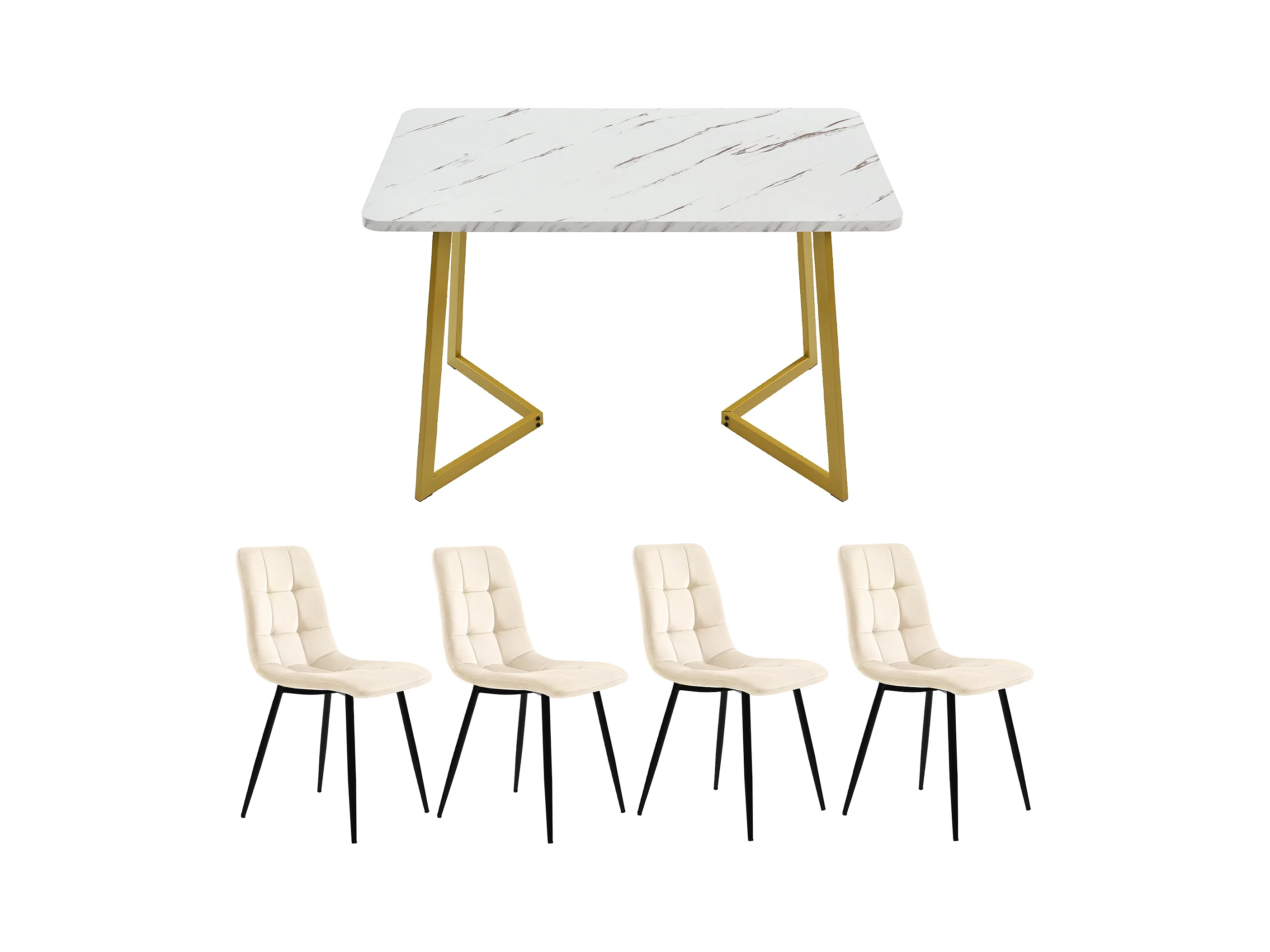 Ensemble Table et Chaises Table de salle à manger 117x68x75 cm Blanc avec pieds Dorés + 4 chaises en Velours Beige