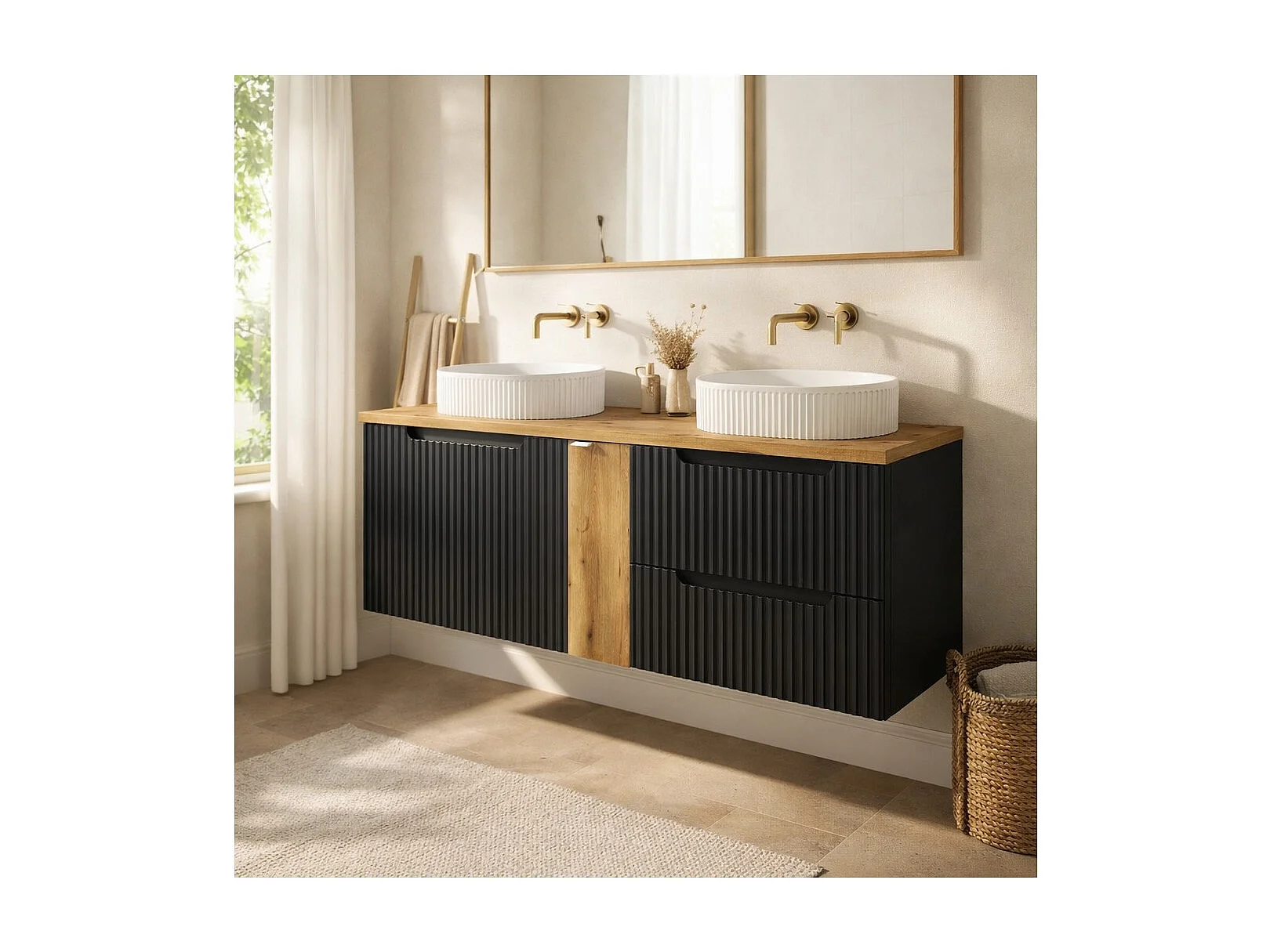 Ensemble VANO 140cm : meubles sous vasque avec niches à tiroirs et placards + deux vasques à poser rainurées