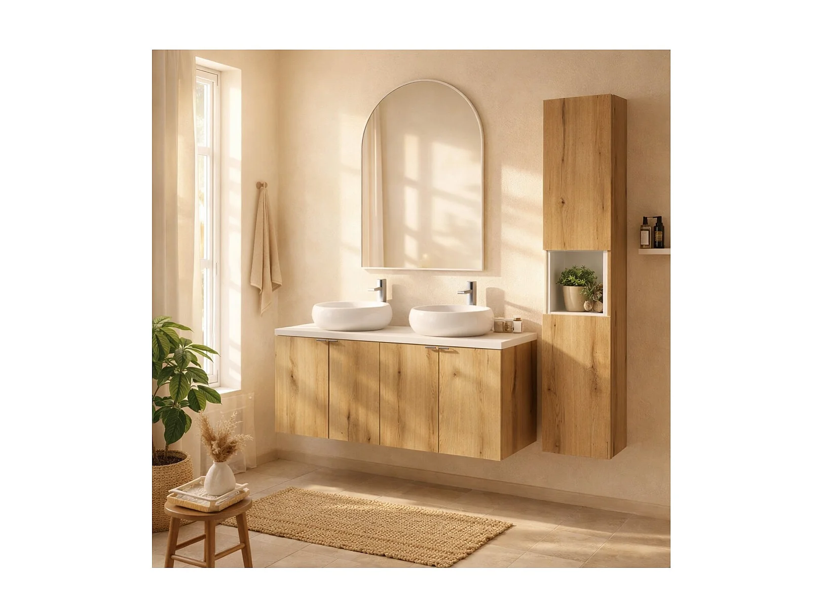 Ensemble VANO aspect chêne et blanc 150cm : meubles sous vasque à placards + plan pour vasque + vasques à poser ronde + colonne
