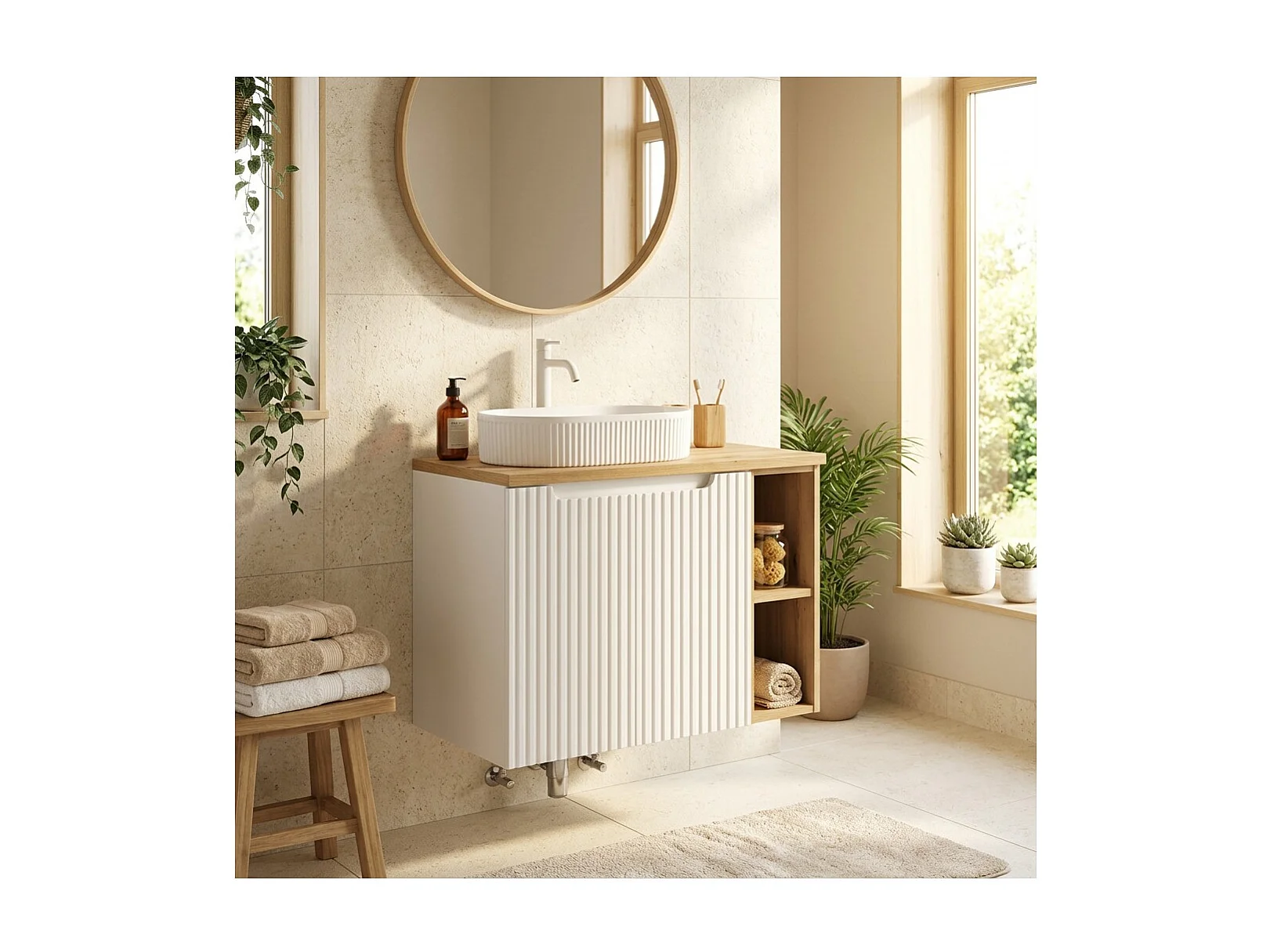 Ensemble VANO blanc 80cm : meubles sous vasque à placards avec niches visibles + plan pour vasque + vasque à poser rainurées