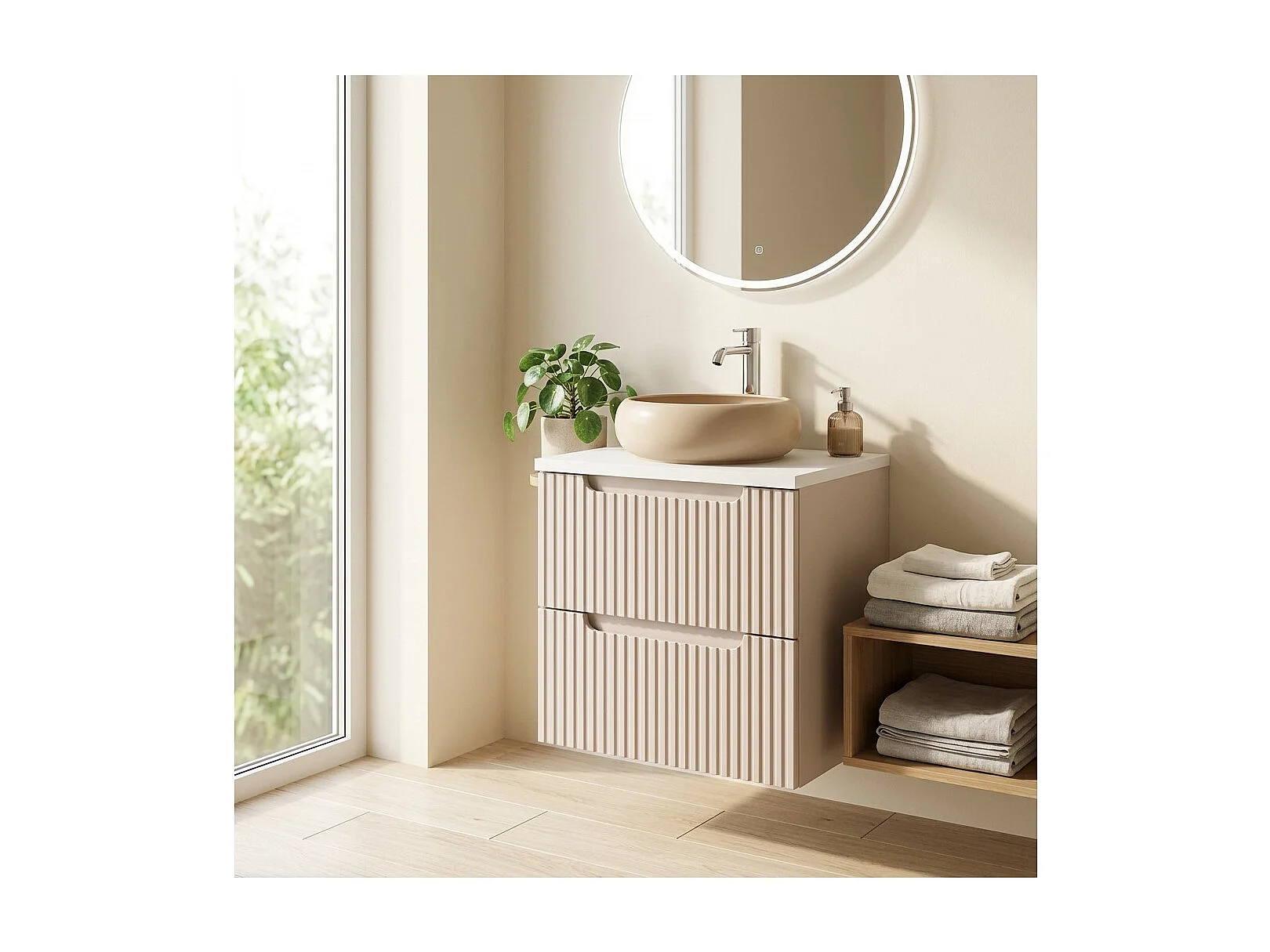 Ensemble VANO cachemire et blanc 50cm : meuble sous vasque à tiroirs + plan pour vasque + vasque ronde cappuccino à poser