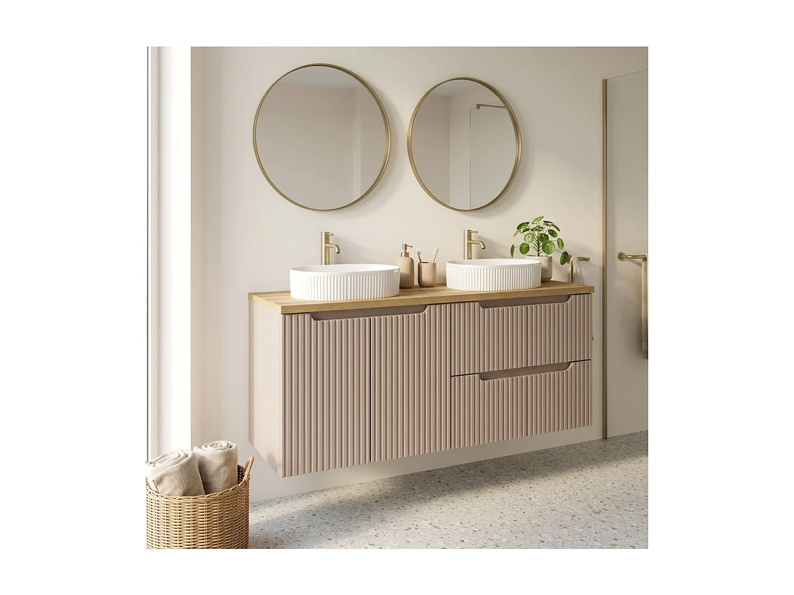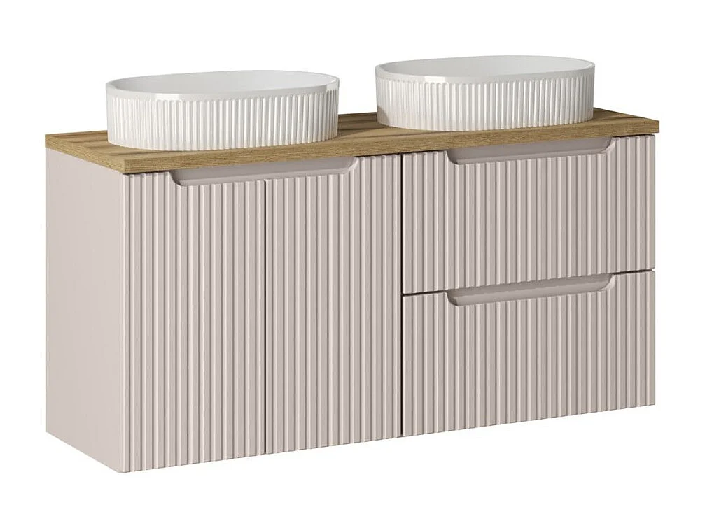 Ensemble VANO cachemire et chêne 120cm : meubles sous vasque à tiroirs et placards + vasques à poser rainurées blanches