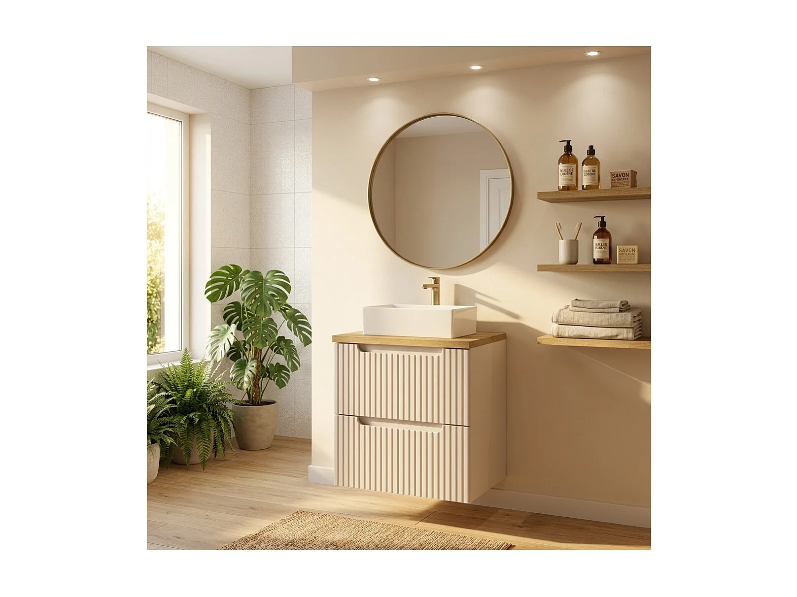 Ensemble VANO cachemire et chêne 50cm : meuble sous vasque à tiroirs + plan pour vasque + vasque à poser rectangulaire