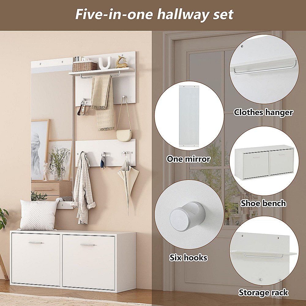 Ensemble vestiaire 4 pièces miroir 2 étagères armoire chaussures brillante 8 crochets blanc compact entrée