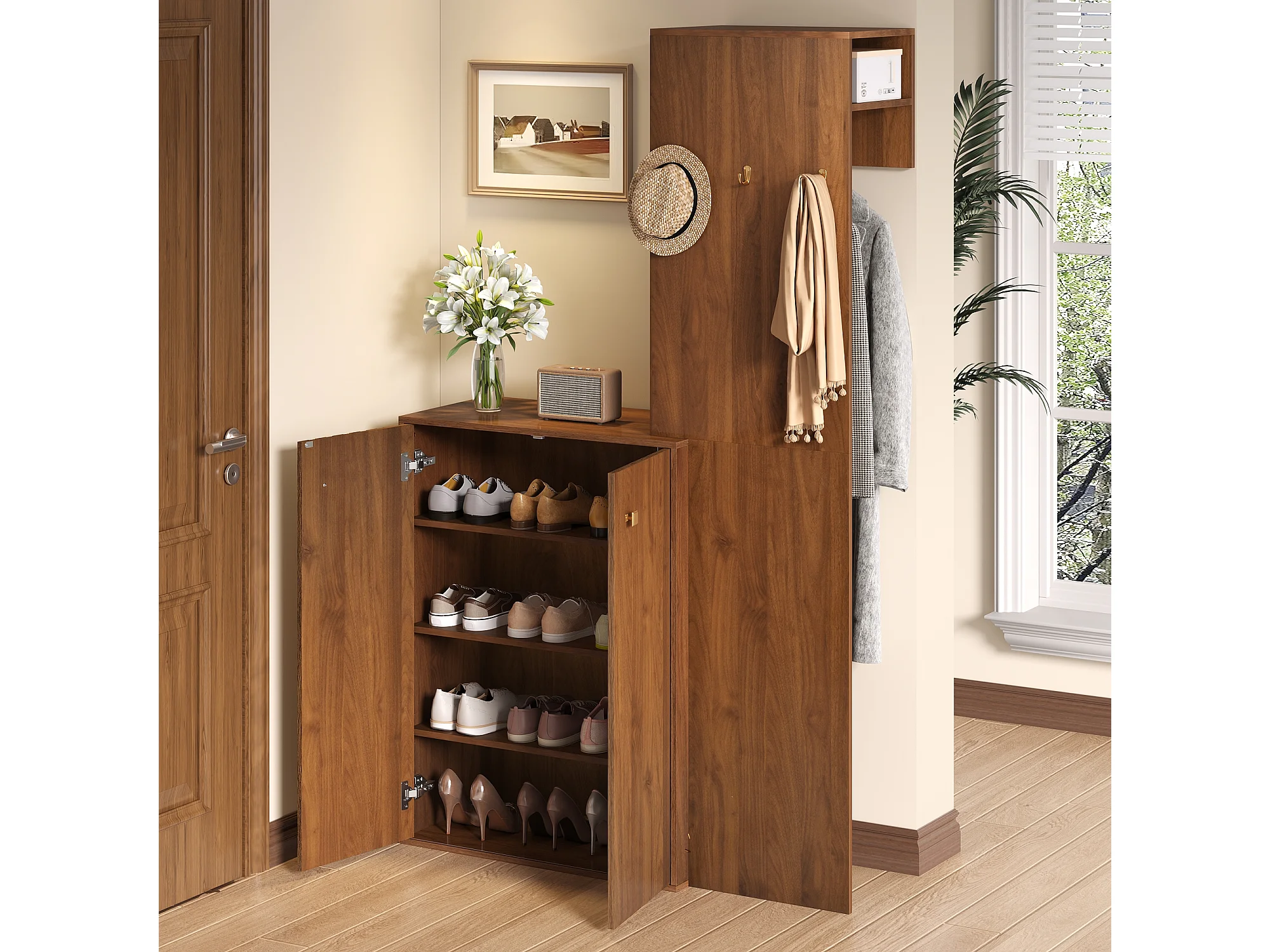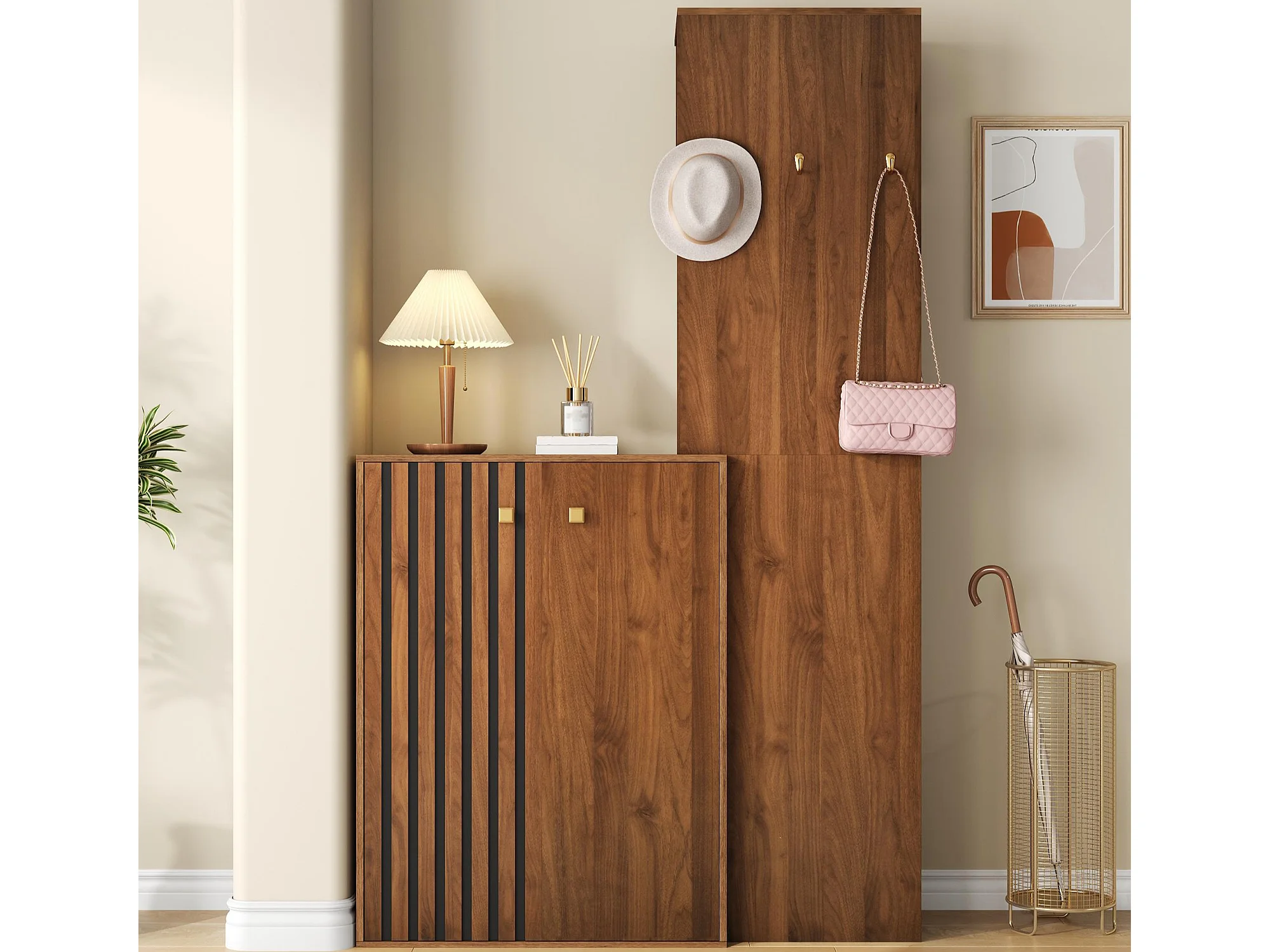 Ensemble vestiaire d'entrée moderne - Meuble à chaussures + Porte-manteau - Avec tringle et crochets - MDF - Couleur noyer (Perçage requis)