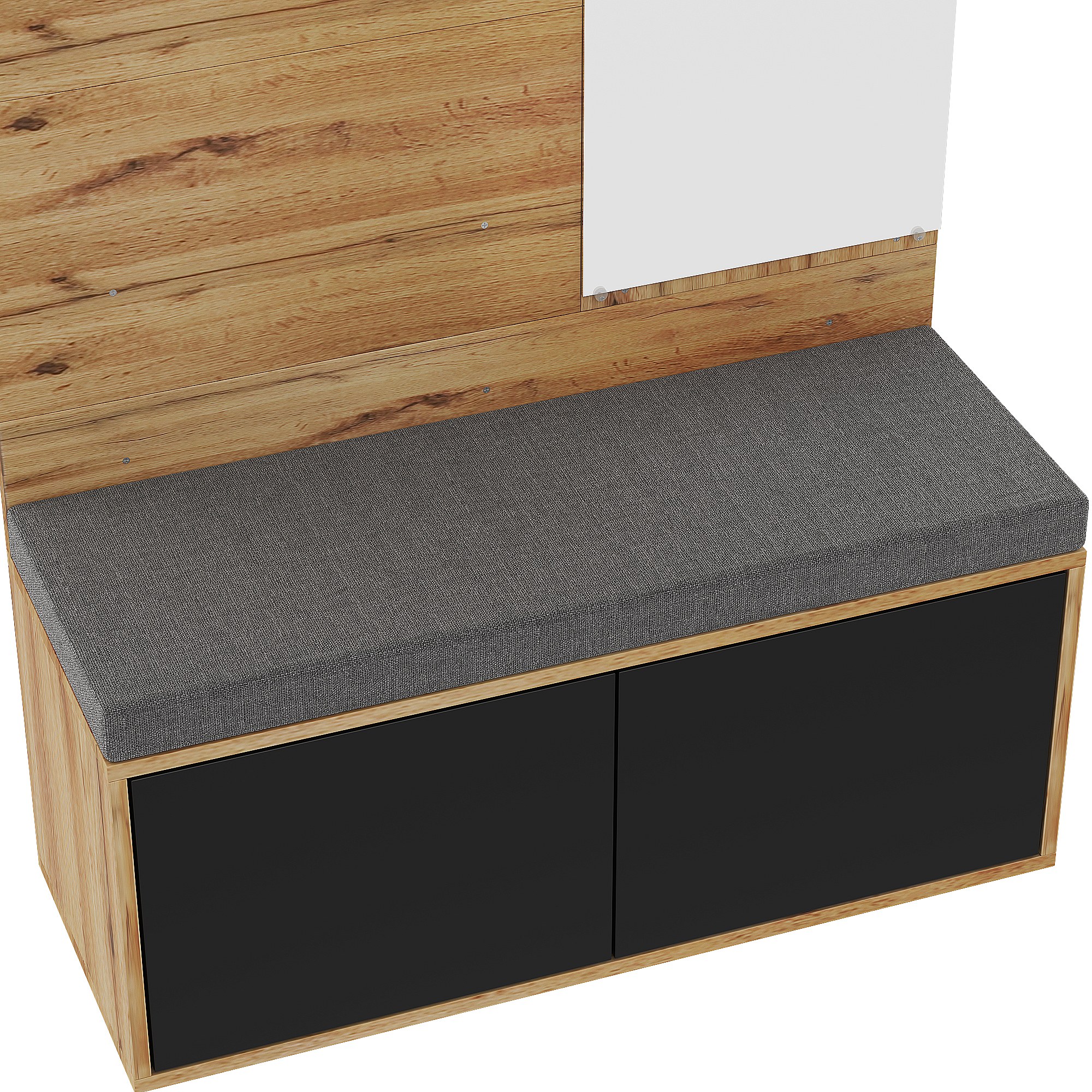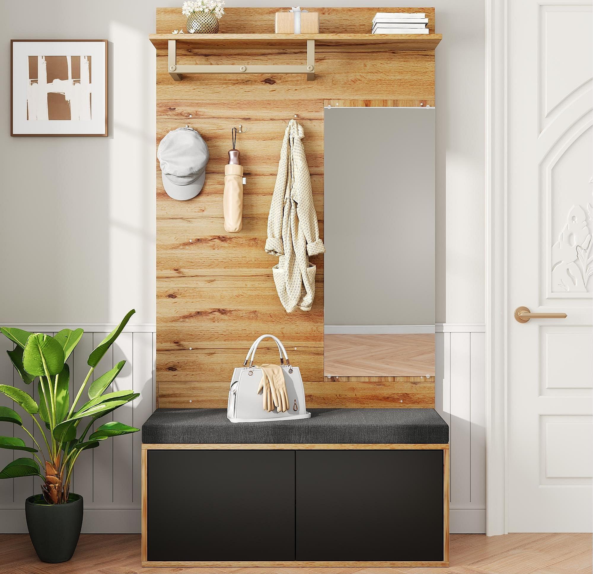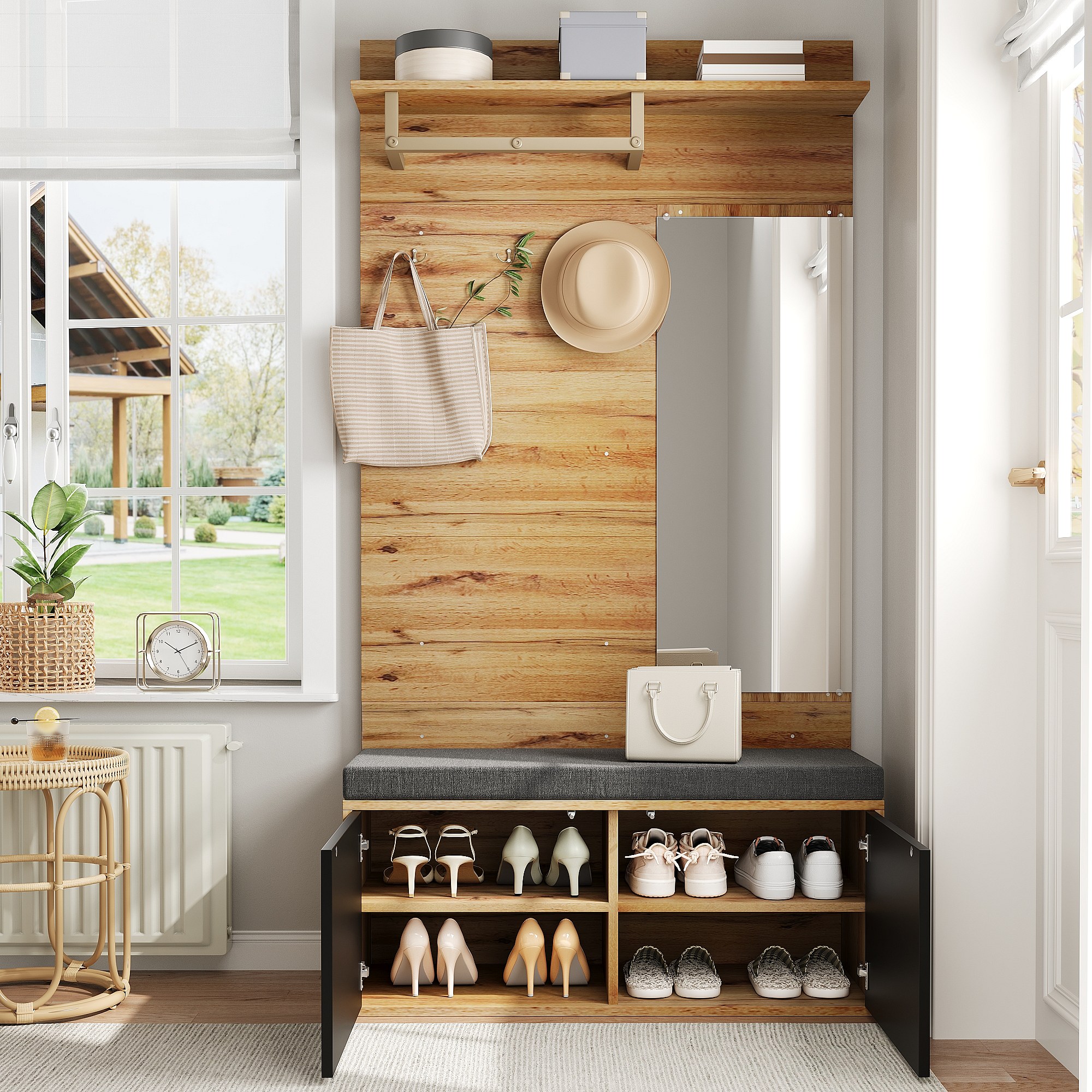 Ensemble vestiaire d'entrée 100x38x190 cm - avec miroir et patères - Avec meuble à chaussures et banc à chaussures - Naturel+noir