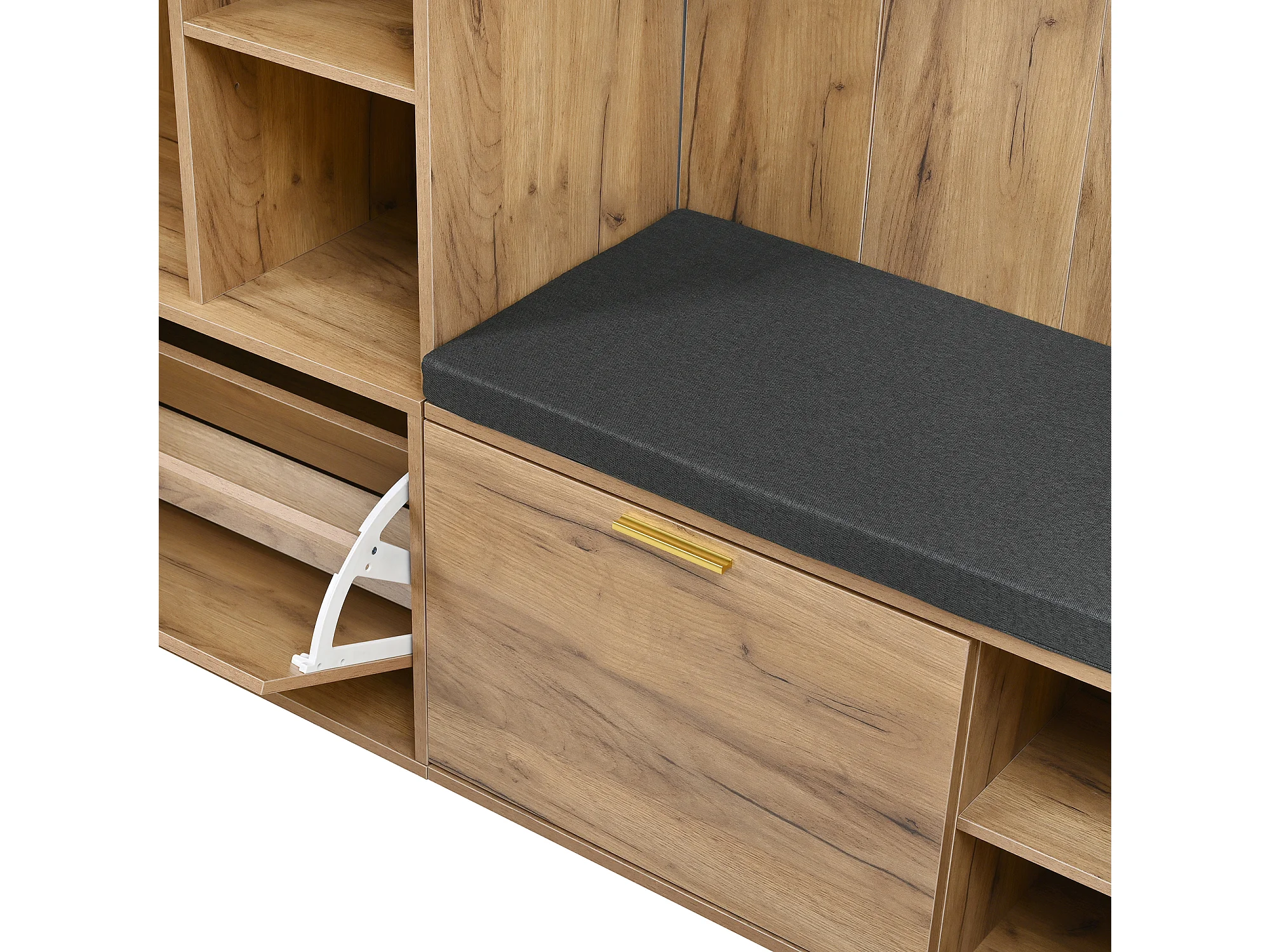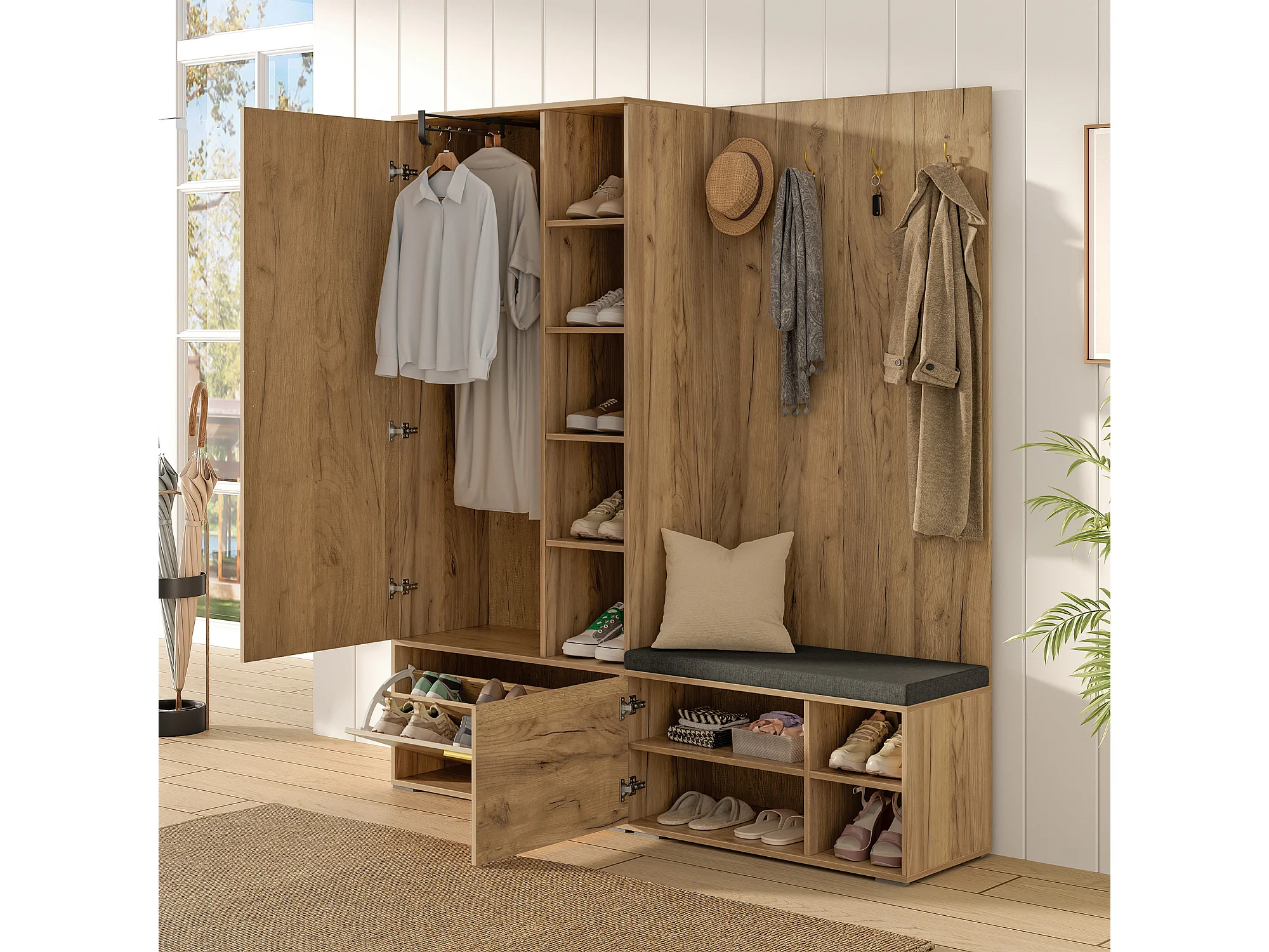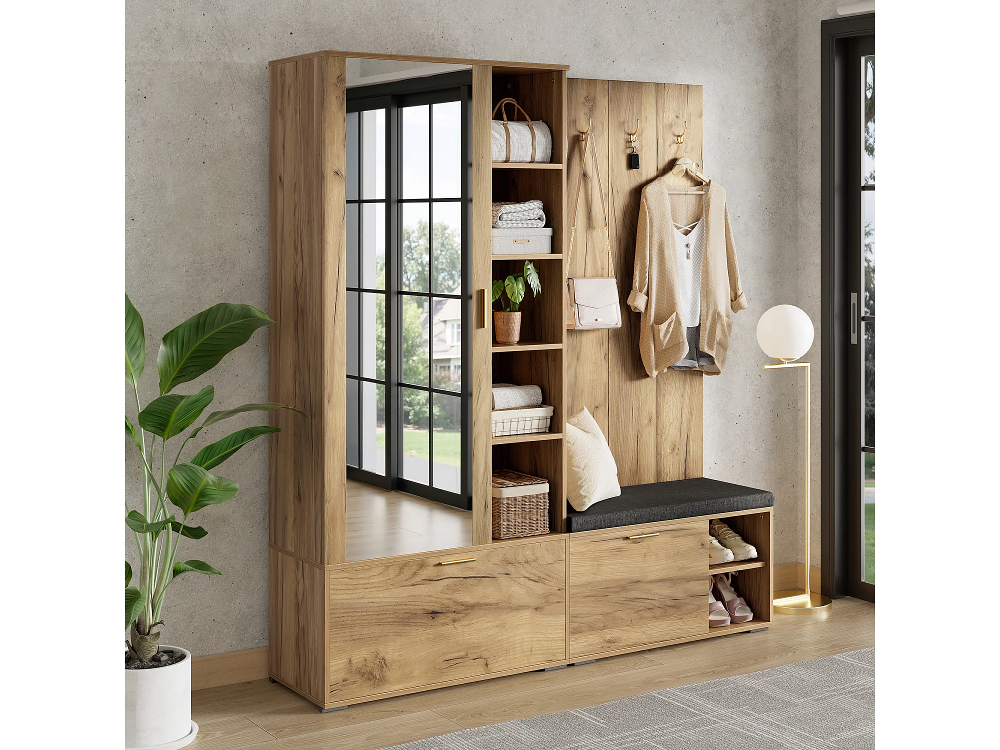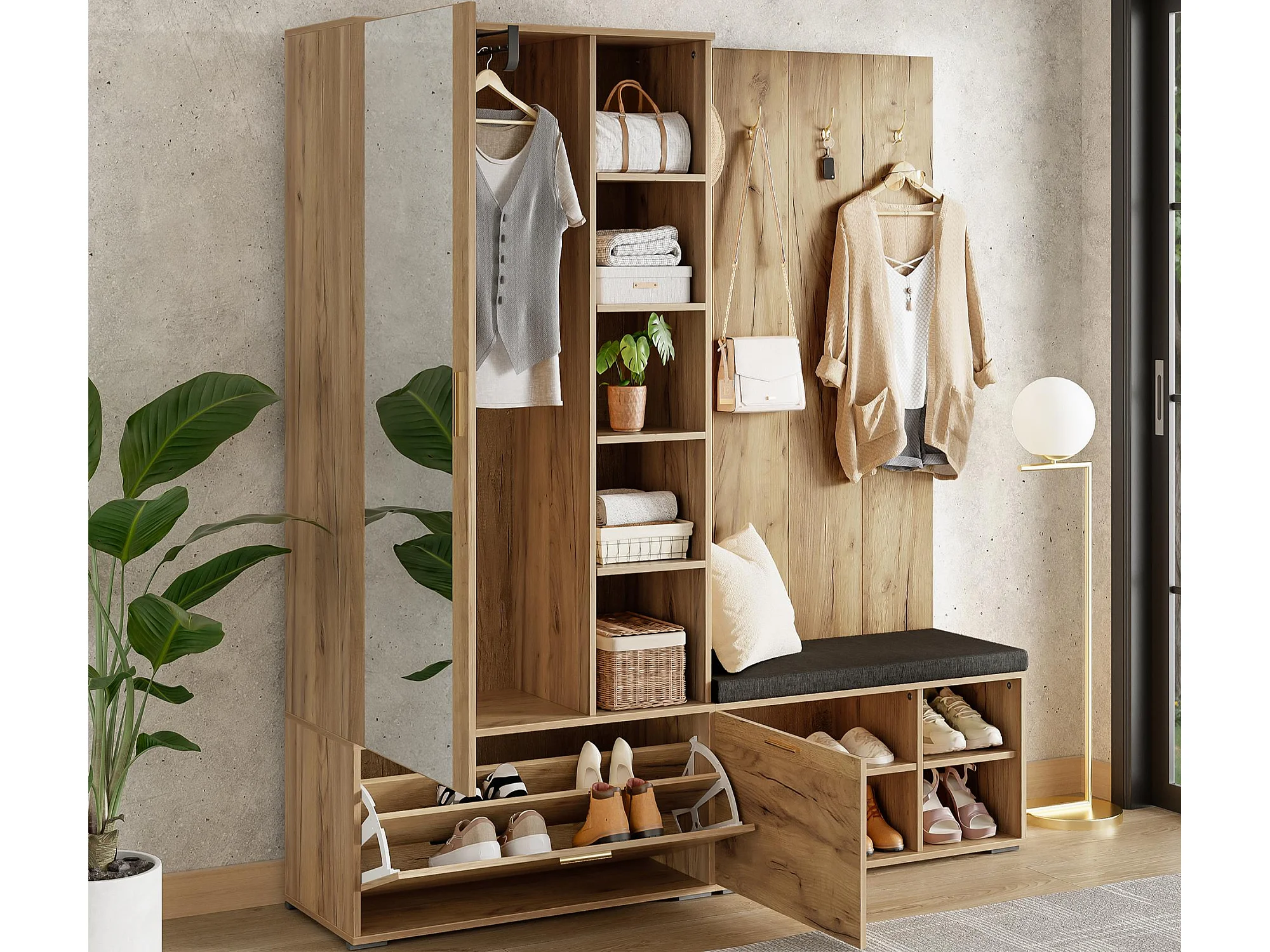 Ensemble vestiaire d'entrée 160x38x180cm - avec 3 portes et compartiments de rangement - avec miroir et meuble à chaussures - avec crochet - Naturel