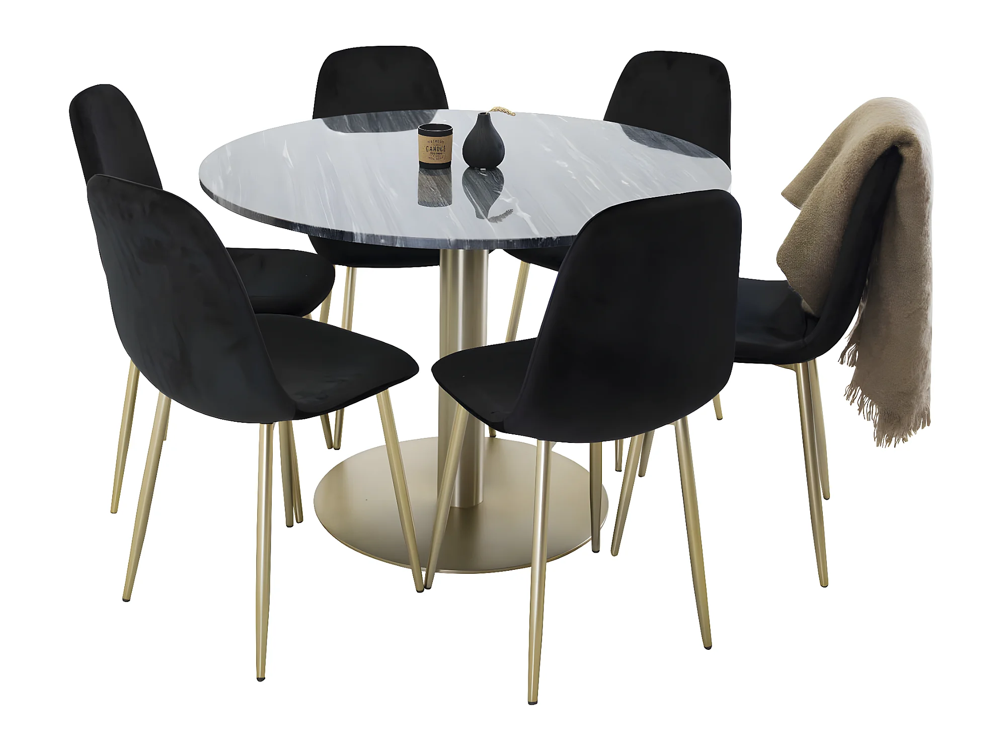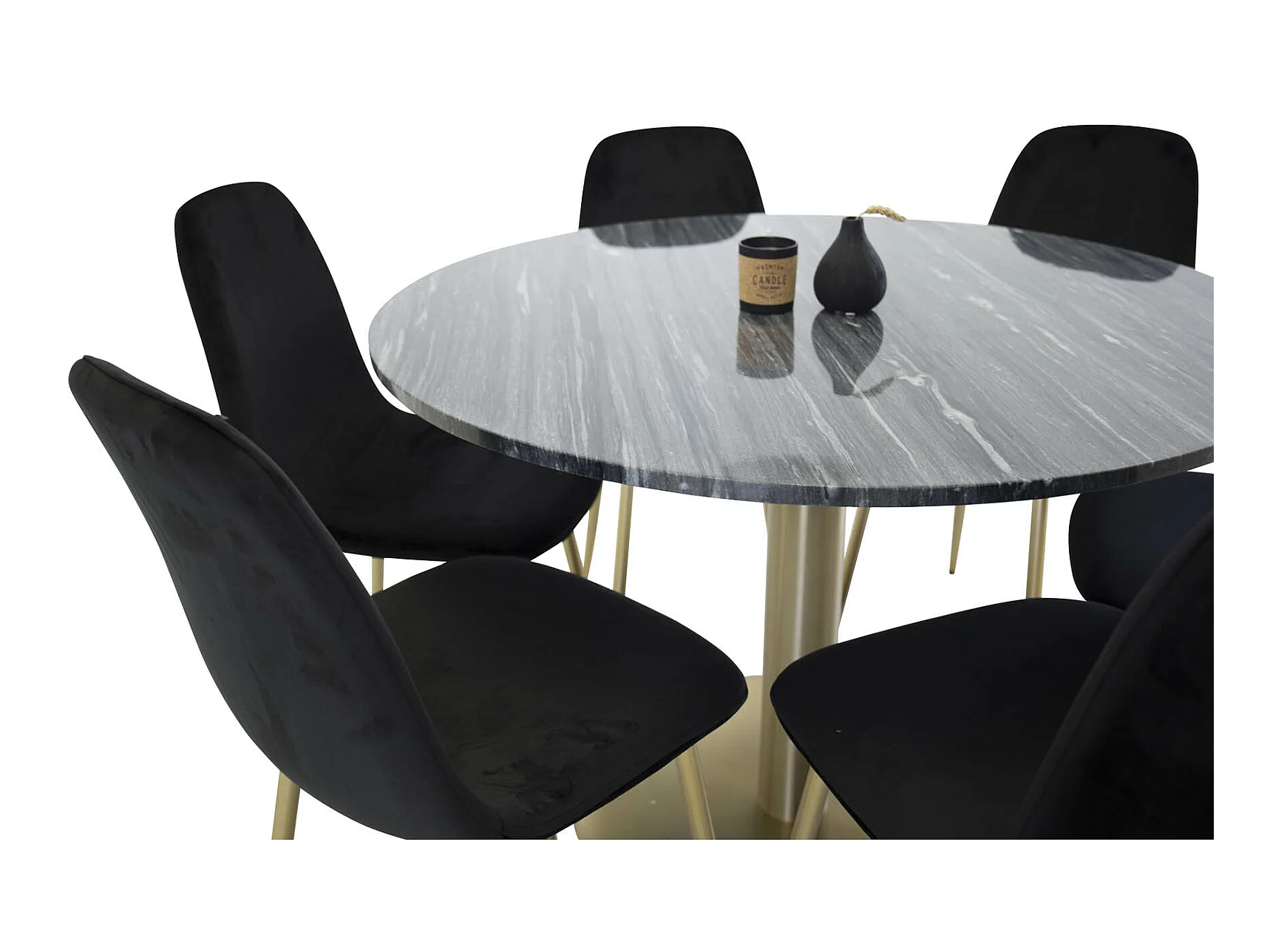 EstelleØ106BLBR ensemble table, table noir, marbre et 6 Polar chaises Velours noir, laiton décor.