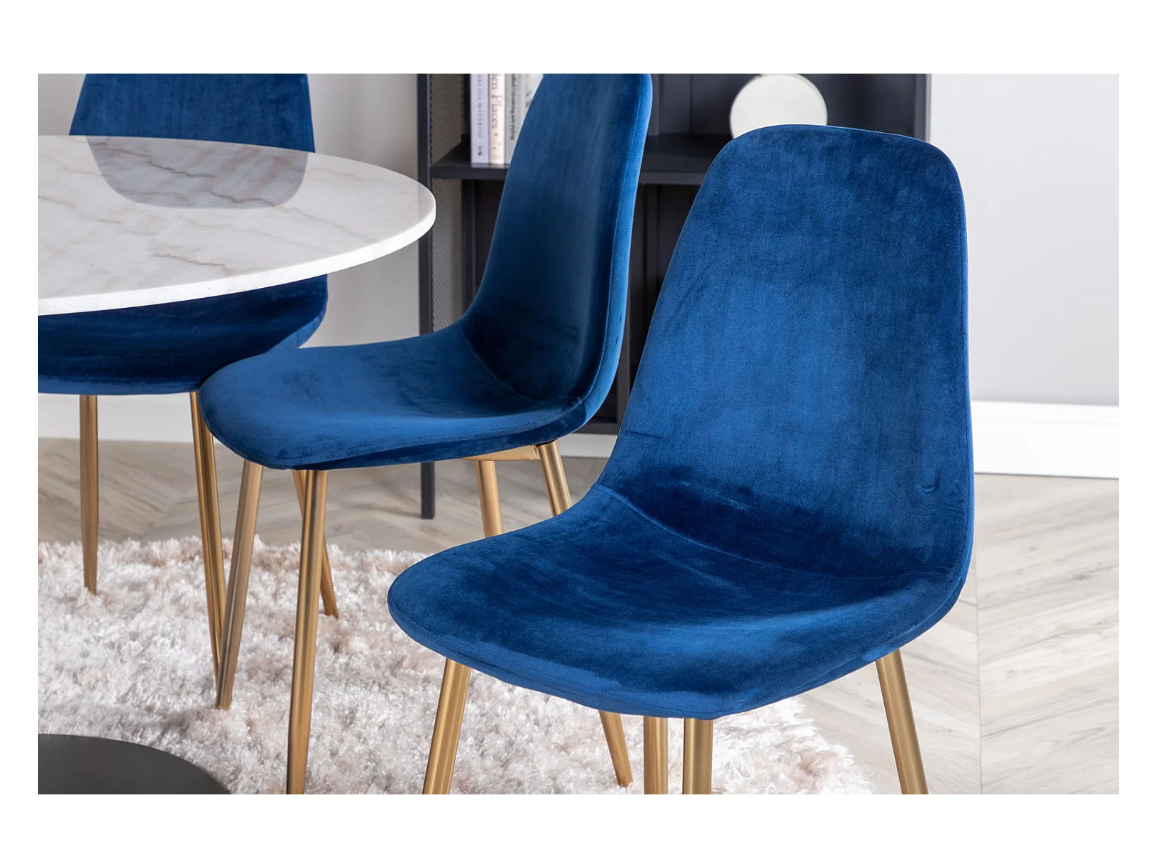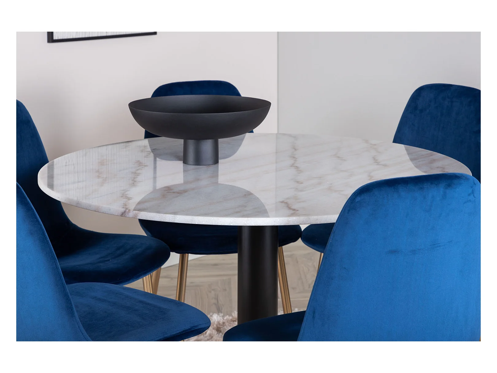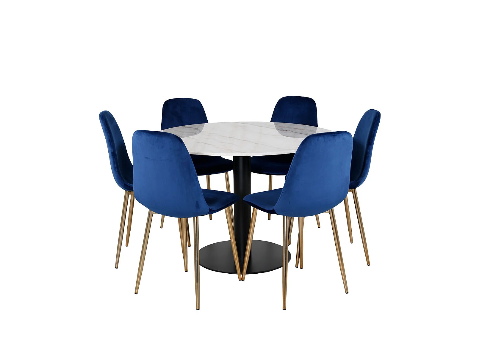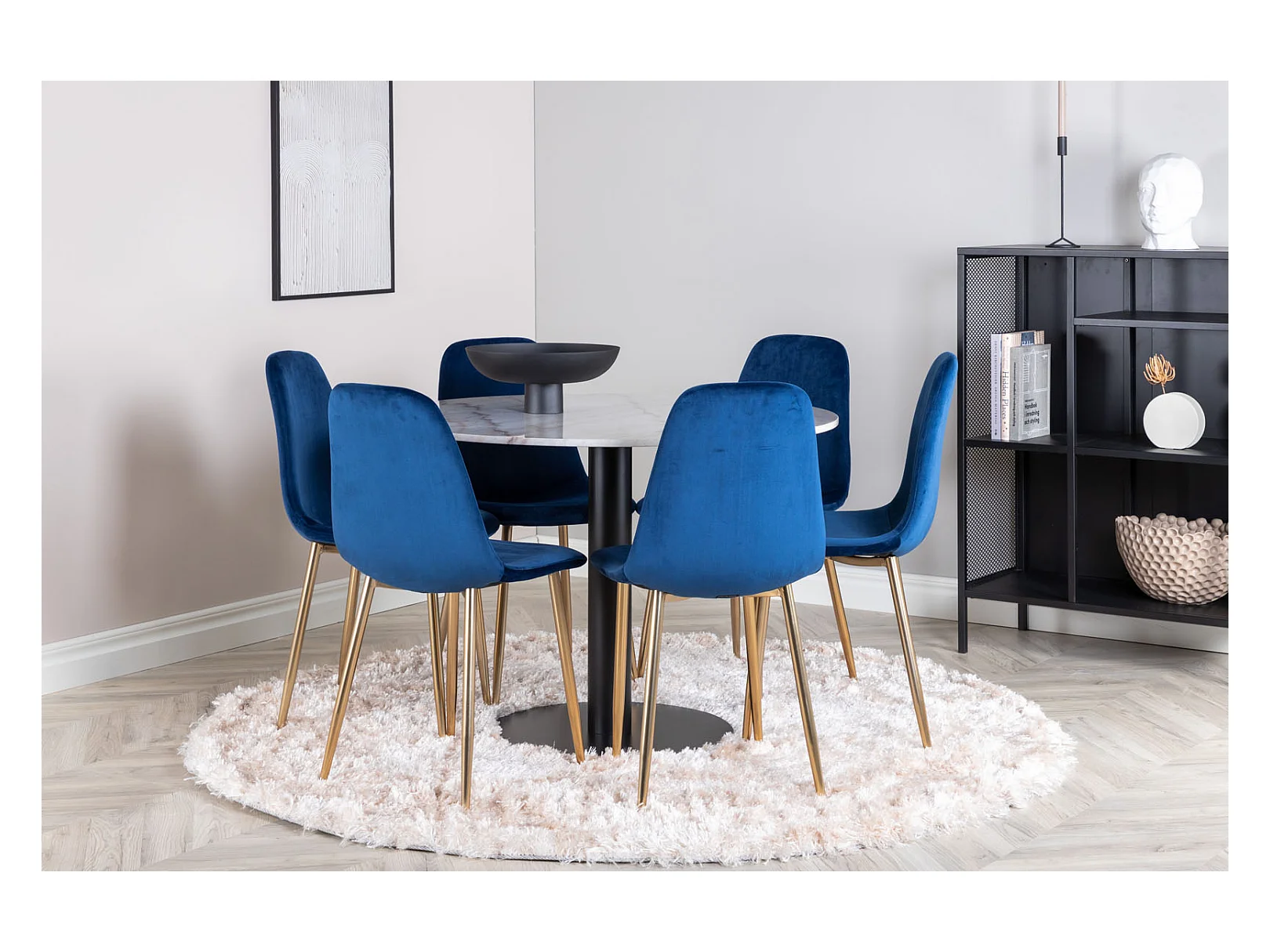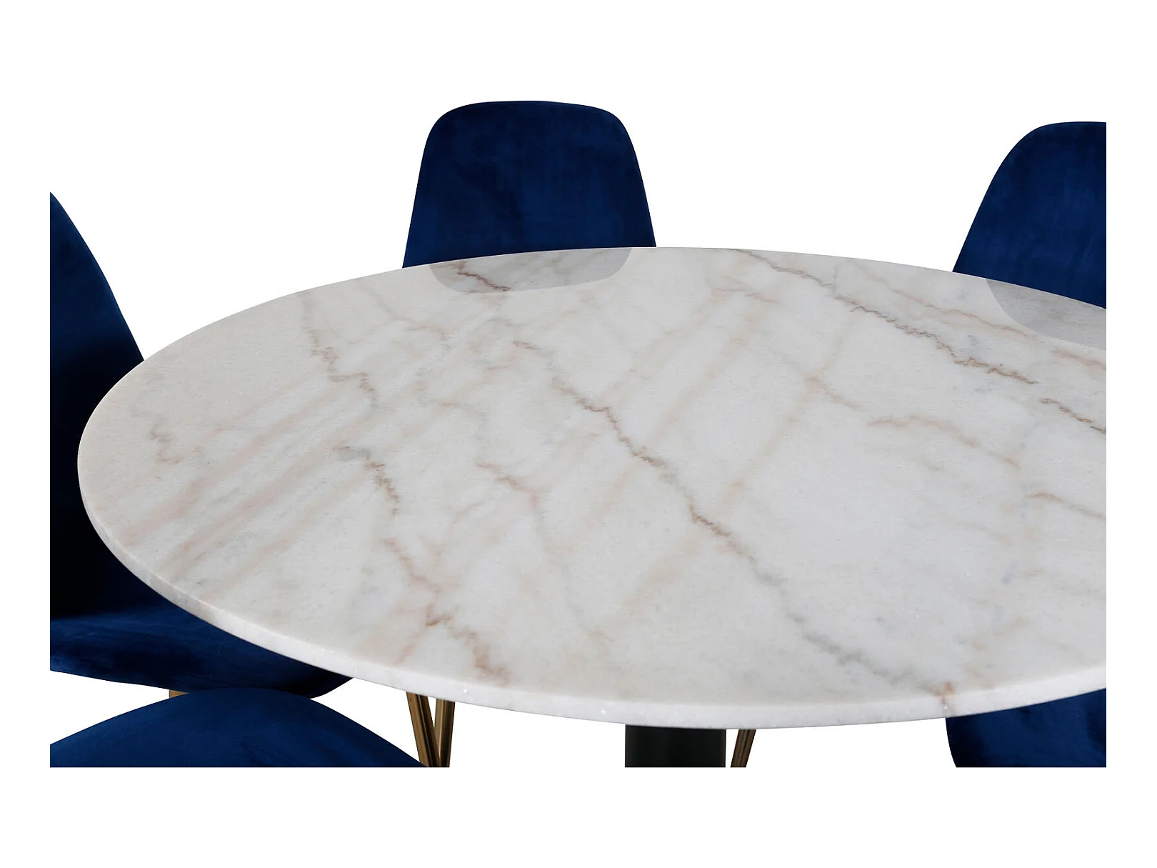 EstelleØ106WHBL ensemble table, table blanc, marbre et 6 Polar chaises Velours bleu, laiton décor.