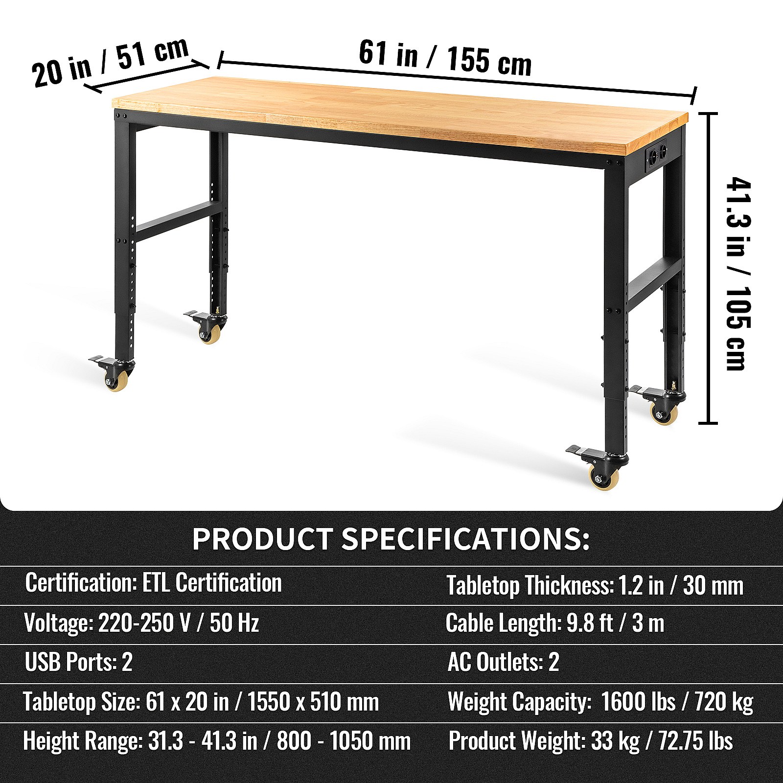 Établi Réglable SucceBuy, 155x51x105 cm, Hauteur Réglable 80-105 cm, avec 4 Roulettes pour Réparation Bricolage
