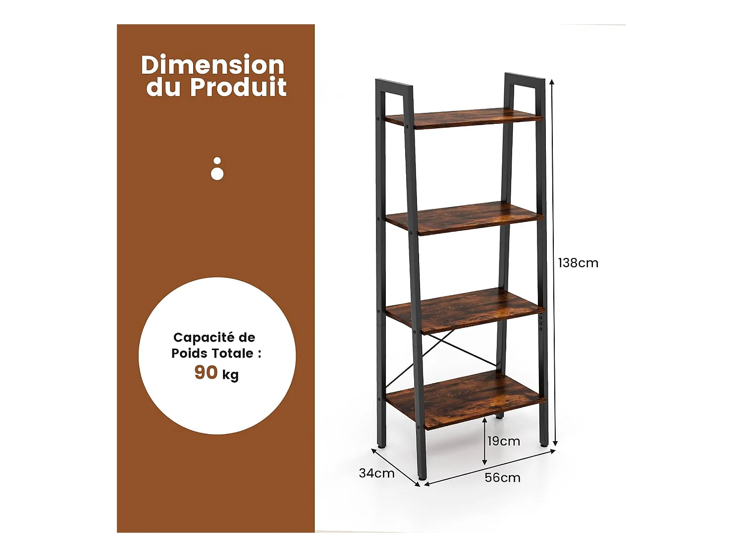Étagère à 4 niveaux, cadre en métal, style industriel, 56 x 34 x 138 cm (brun rustique)