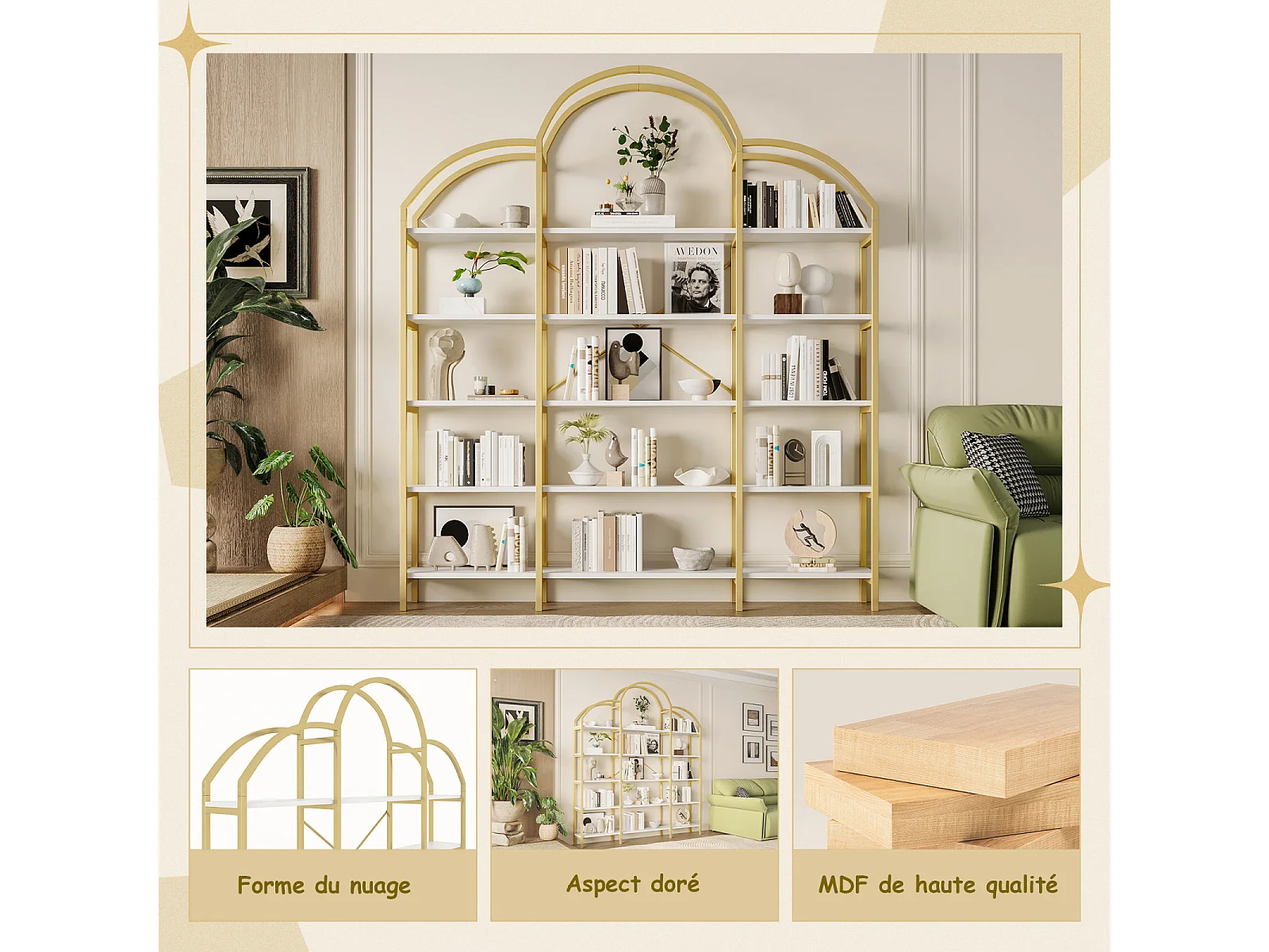Étagère à 5 niveaux - design nuage unique - 170 x 26 x 190 cm - or