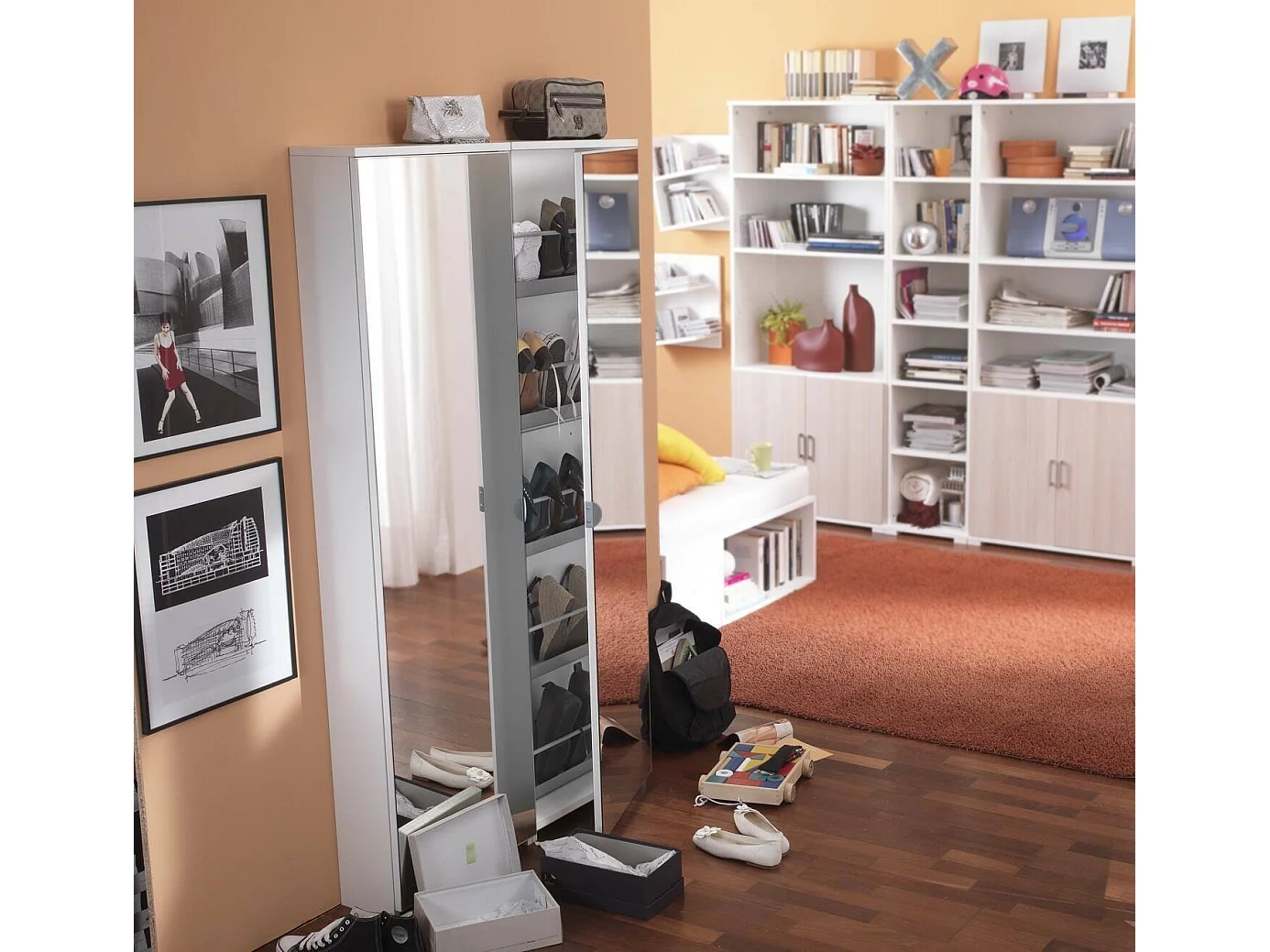 Étagère à chaussures Dabarre, Meuble d'entrée polyvalent avec porte miroir, Meuble à chaussures moderne avec 5 étagères, 100% Made in Italy, 50x18h178 cm, Blanc