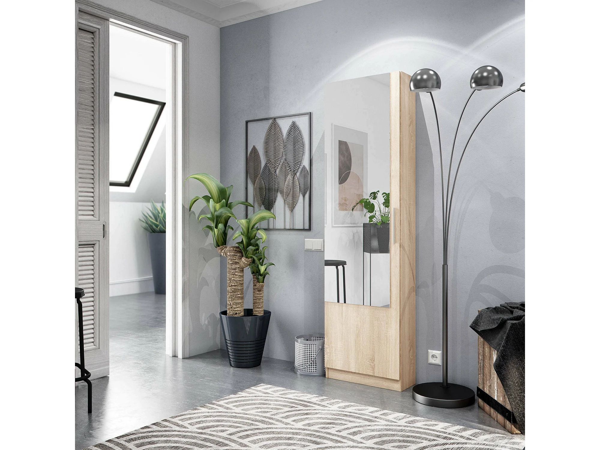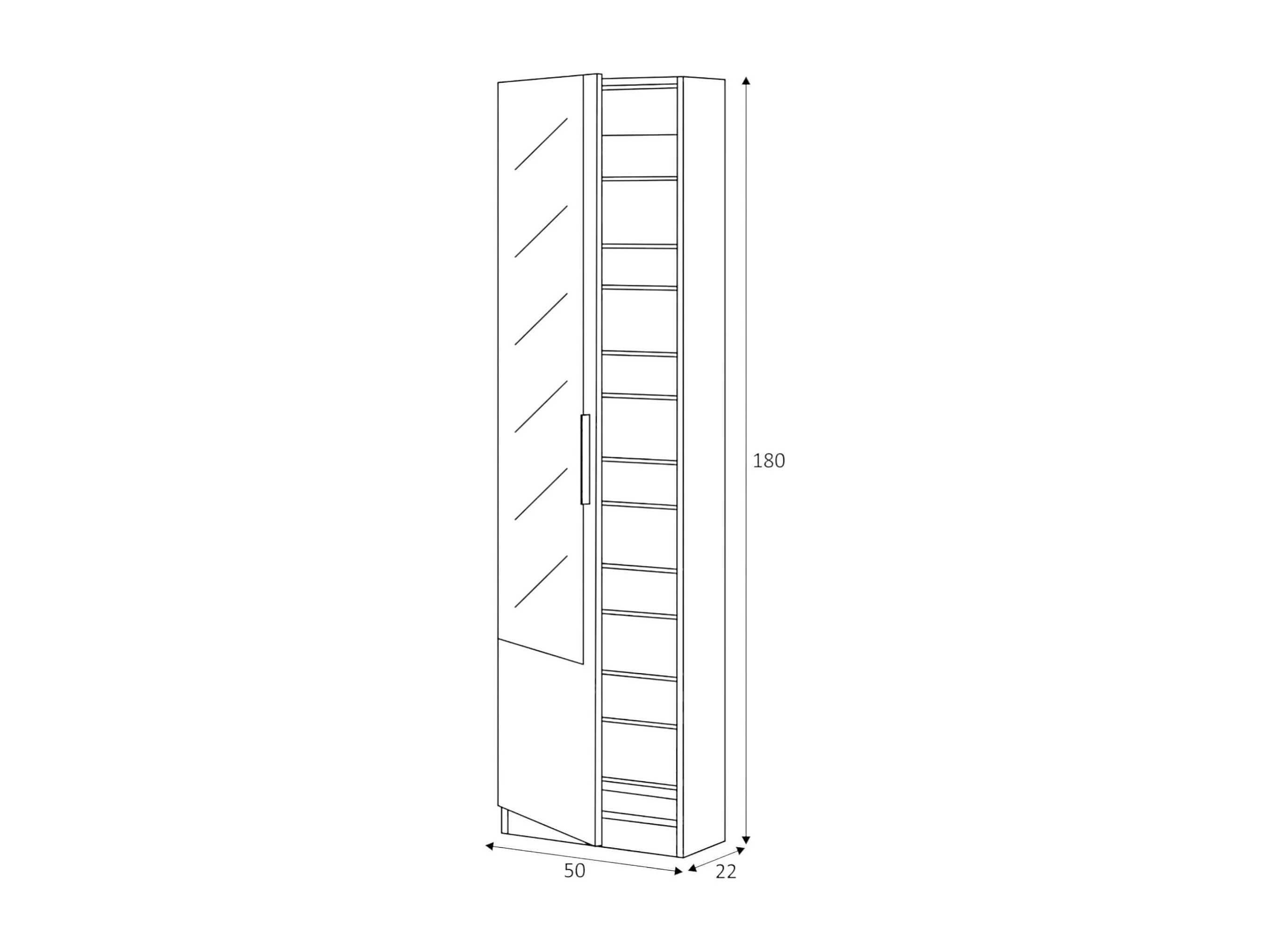 Étagère à chaussures Eugene, Armoire à chaussures haute avec 1 porte, Armoire à chaussures moderne, Armoire d'entrée avec miroir, 50x22h180 cm, Chêne