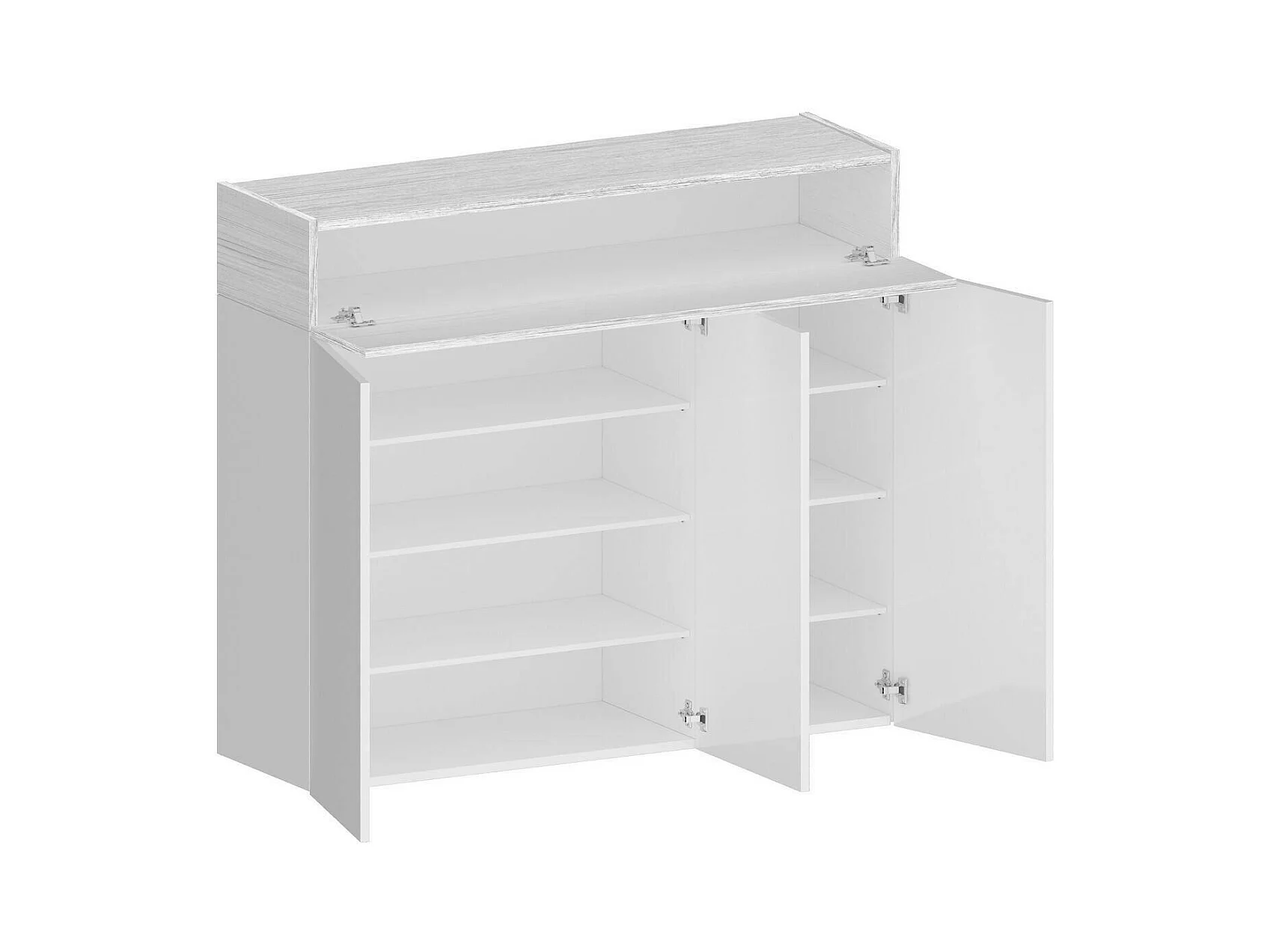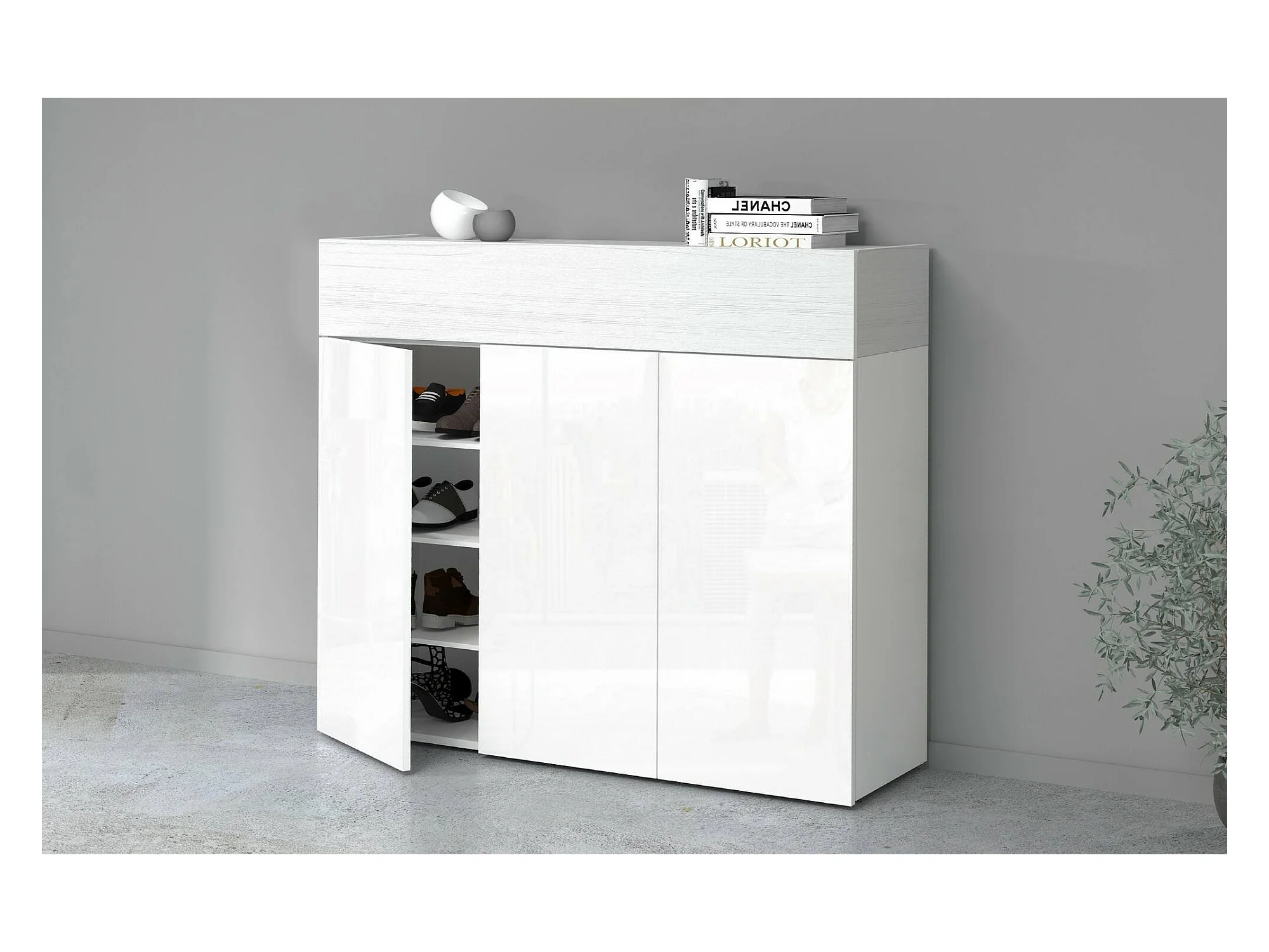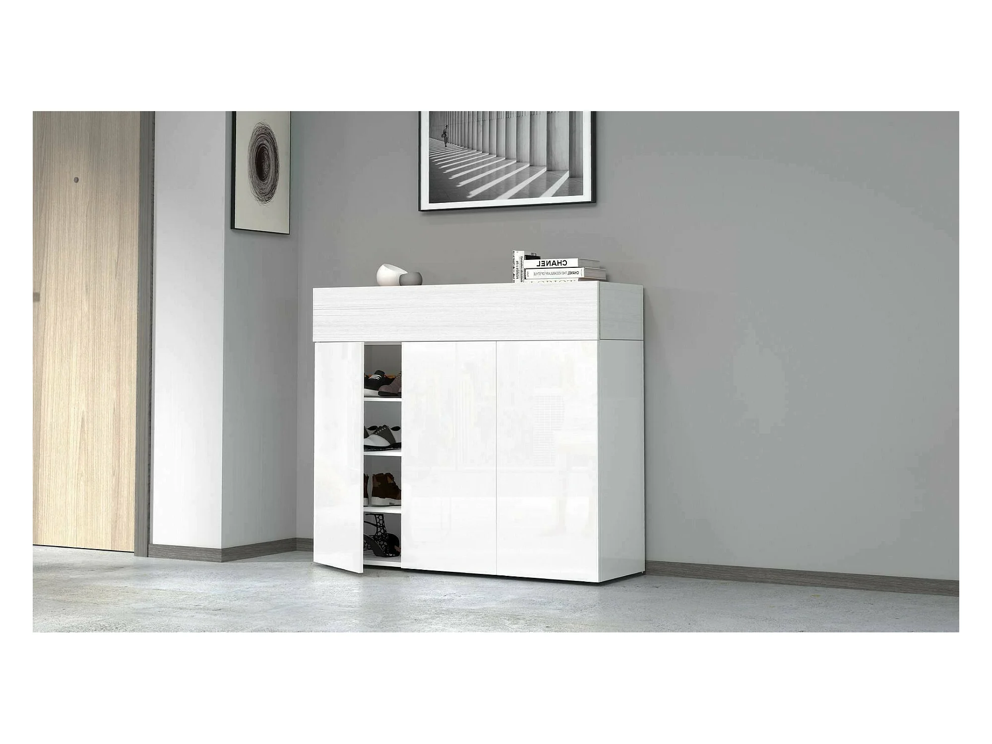 Étagère à chaussures Nick, meuble à chaussures peu encombrant à 4 portes, armoire d'entrée multifonctionnelle, 114x38h100 cm, effet mélèze blanc