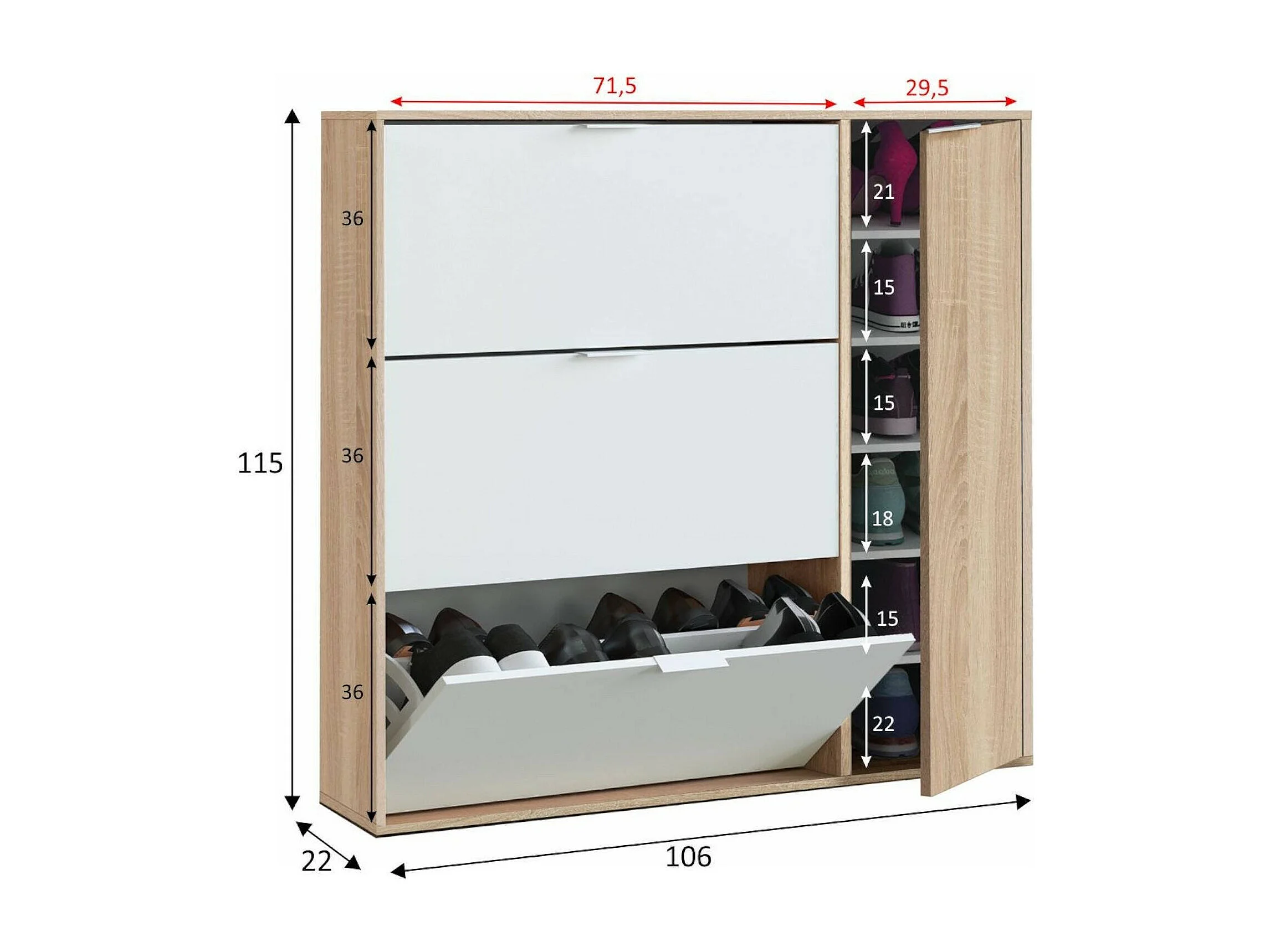Étagère à chaussures Provo, armoire à chaussures 4 portes, armoire basse polyvalente avec 5 étagères, étagère à chaussures moderne, 106x22h115 cm, chêne et blanc