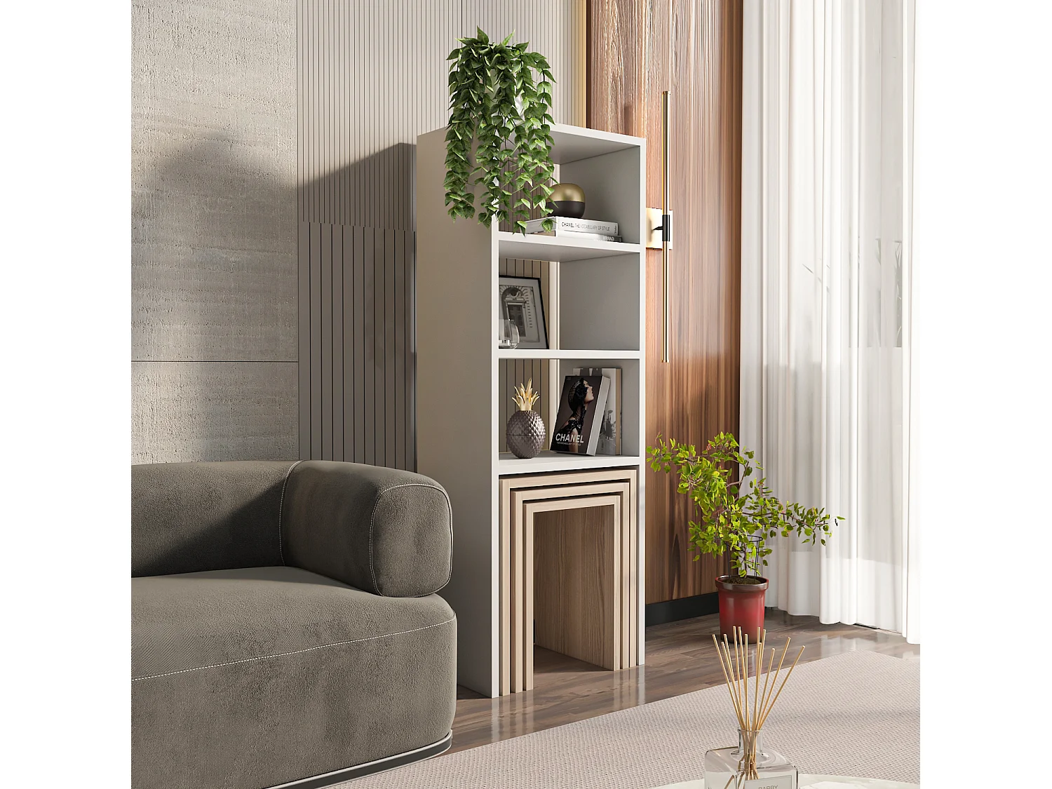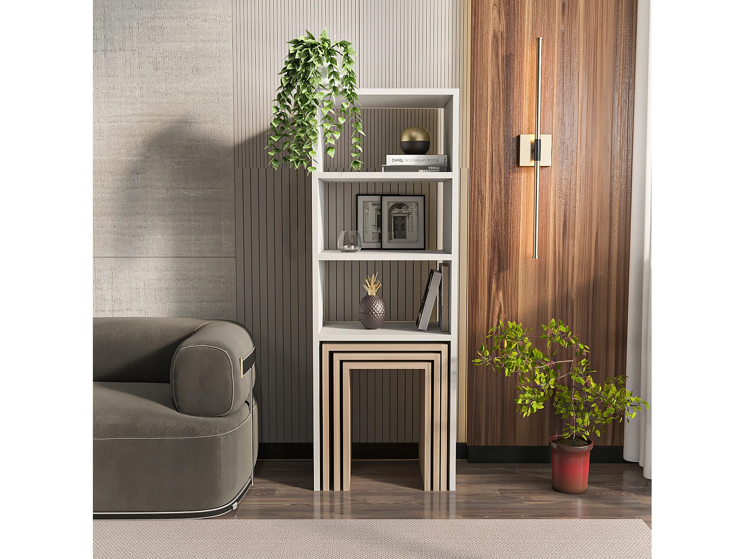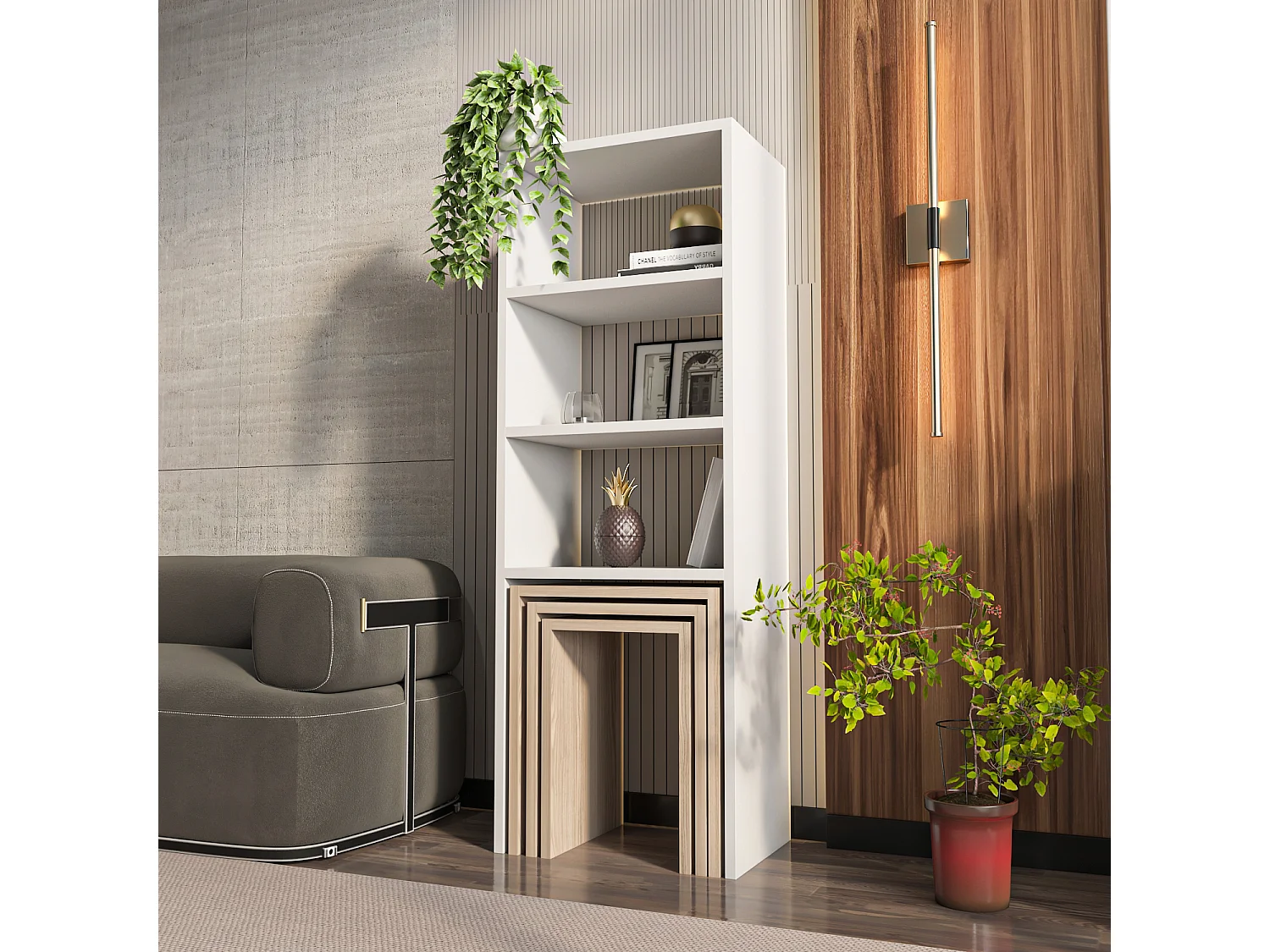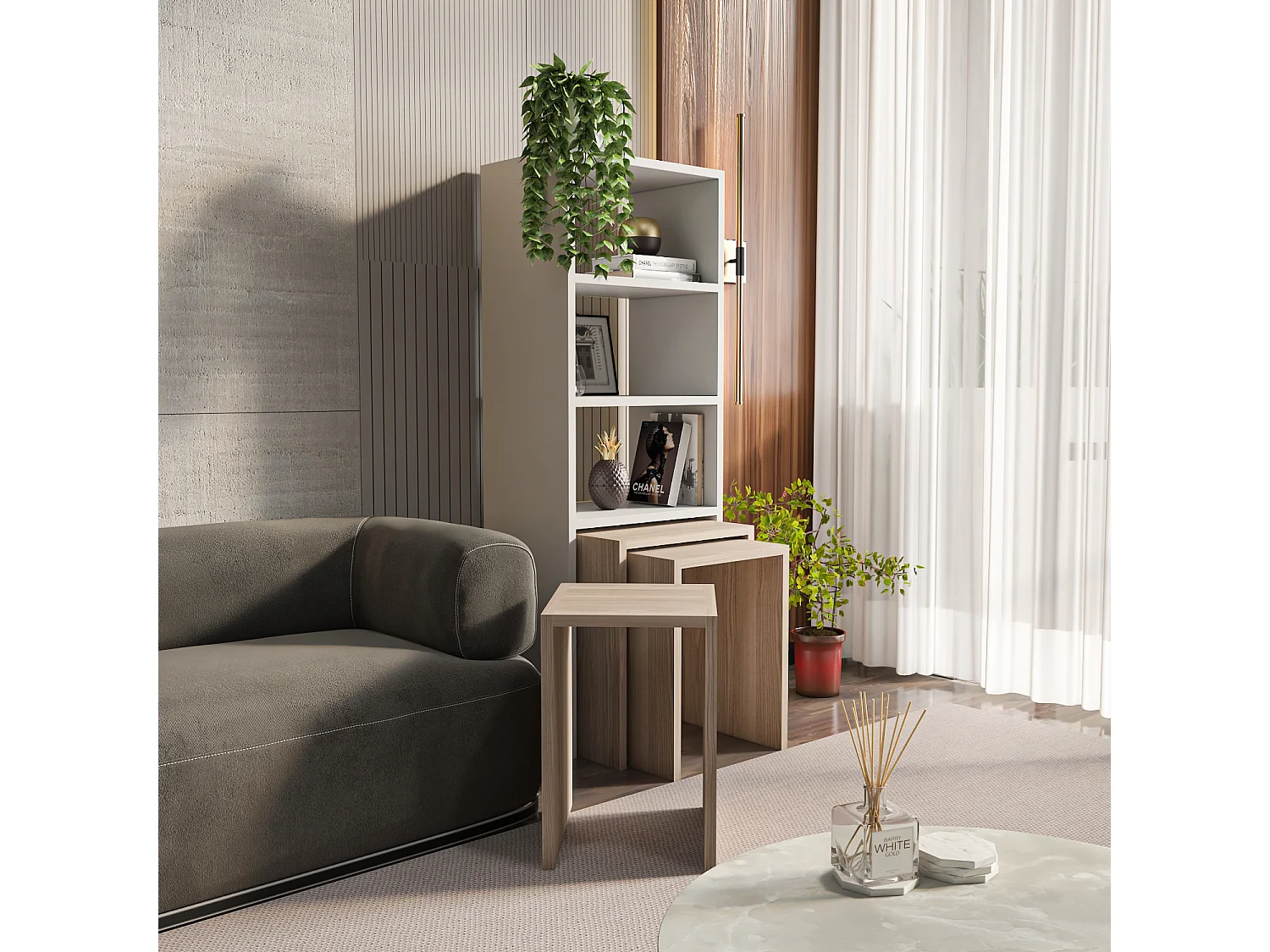 Étagère bibliothèque Melo à 3 étagères avec tables gigognes incluses (Blanc et Cordoba)