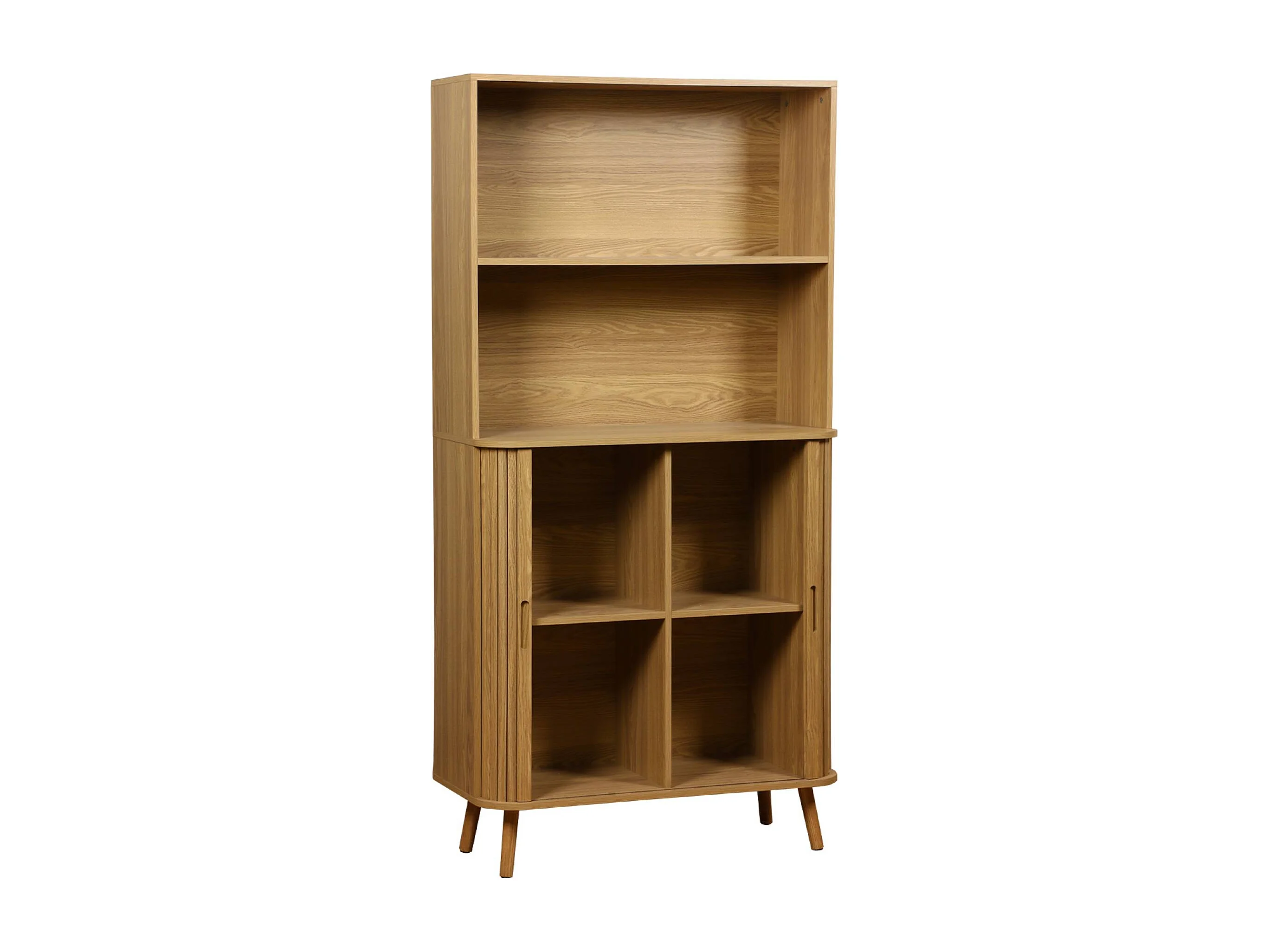 Etagère bibliothèque scandinave. 2 portes coulissantes. 4 niveaux. effet bois rainuré. L 80 x P 45 x H 180cm