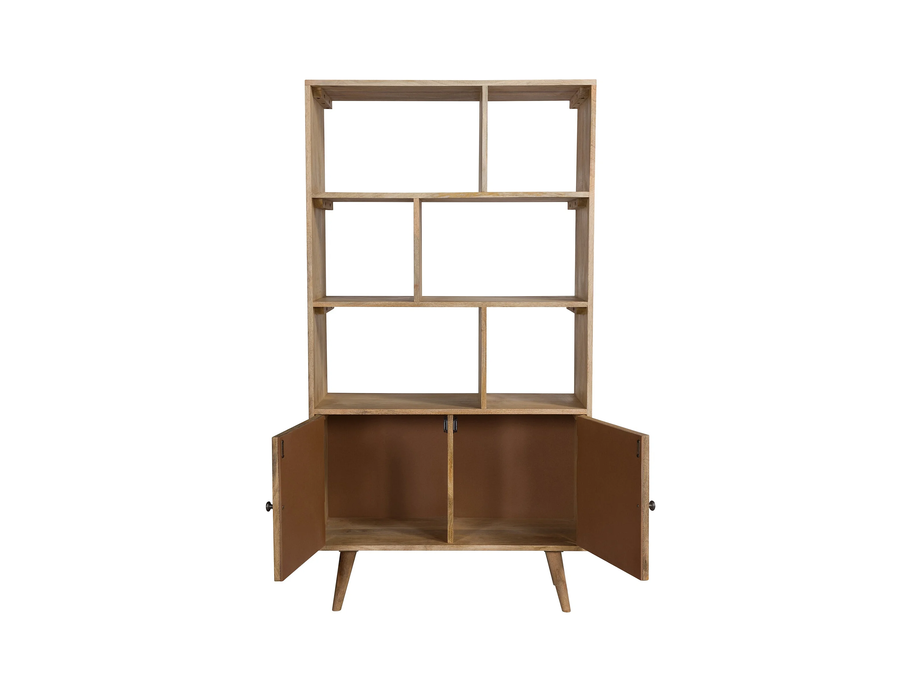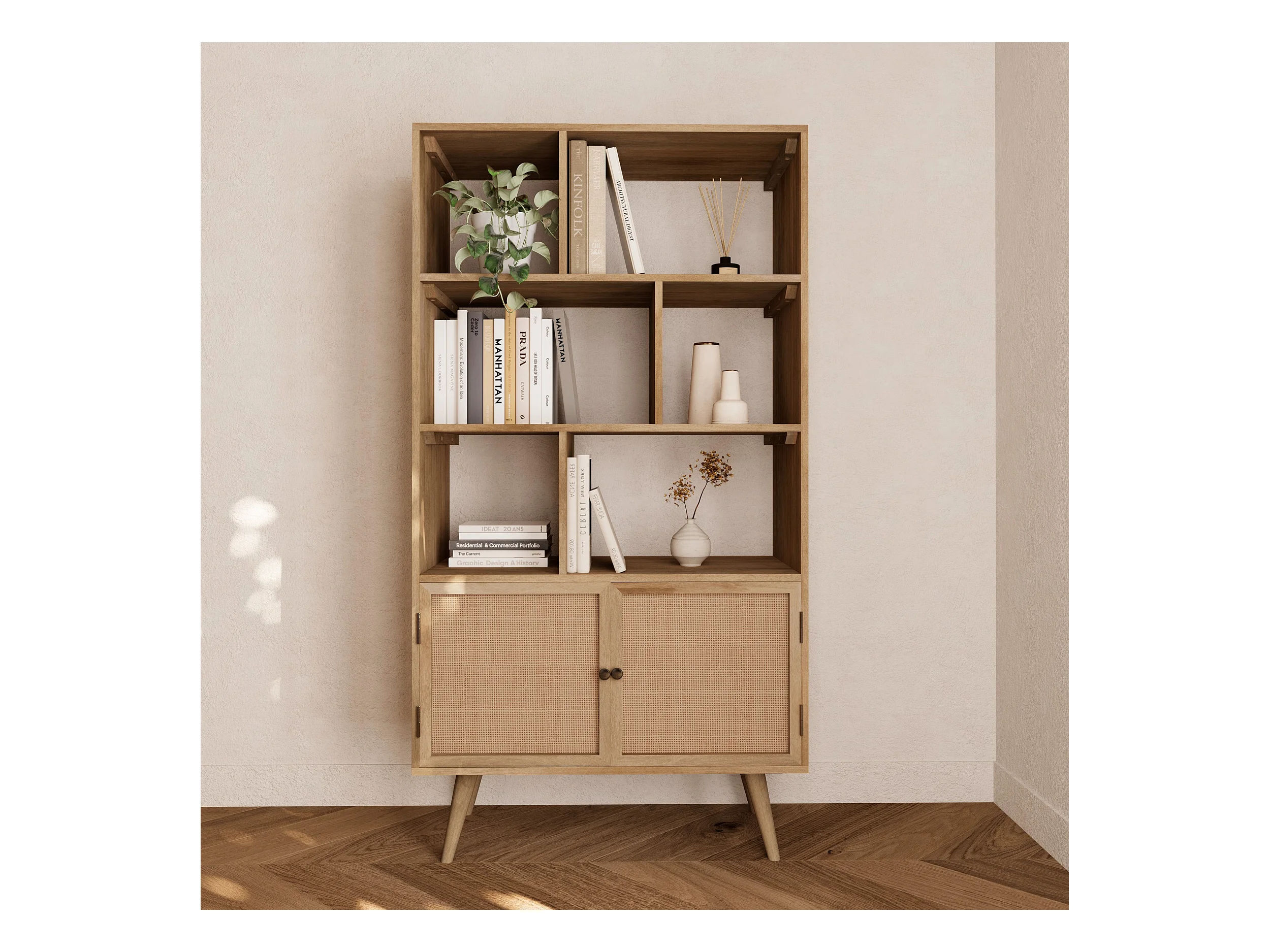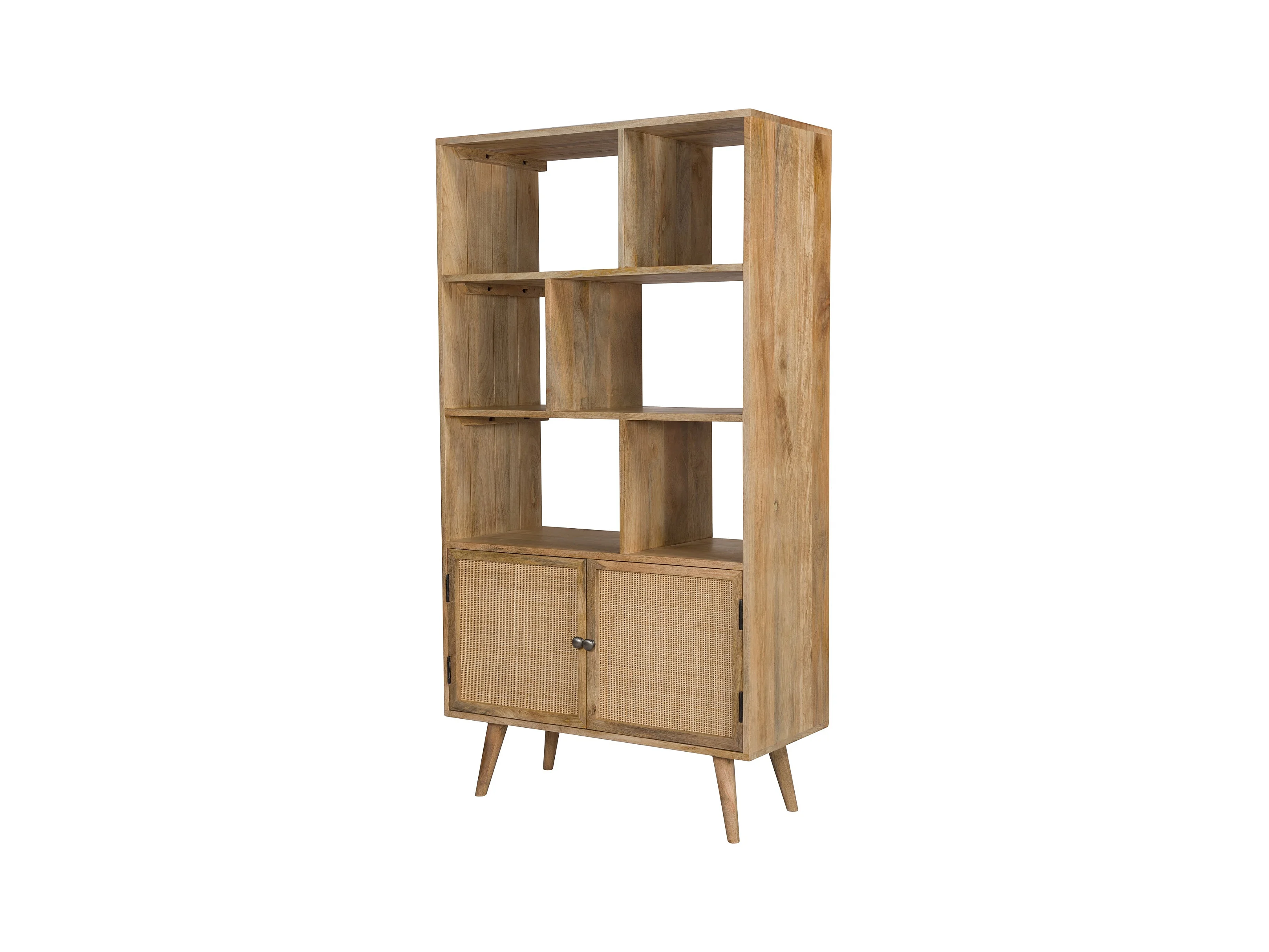 Etagère 6 niches 2 portes en cannage et bois de manguier - Cody