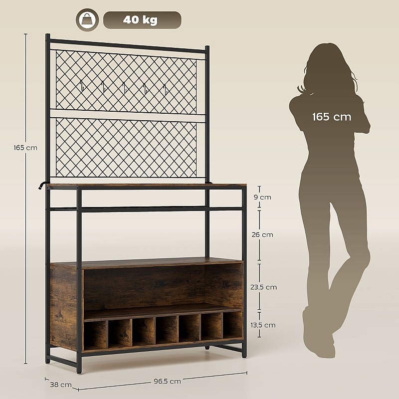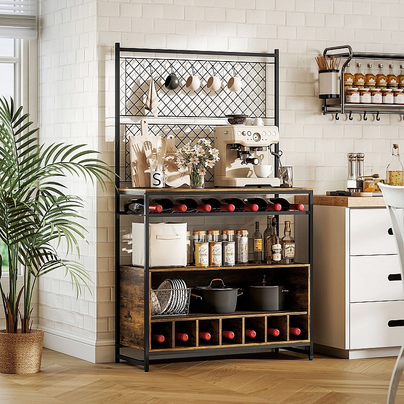 Étagère de cuisine avec plan de travail, Panneaux en métal, 5 crochets – Meuble de rangement pour épices, casseroles et poêles,Marron