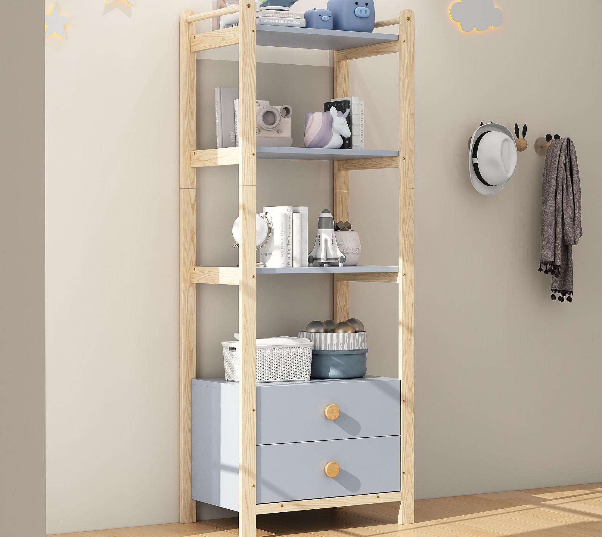 Étagère de rangement 70x44x180 cm - 2 tiroirs - poignées en bois massif - structure en pin - bleu+naturel