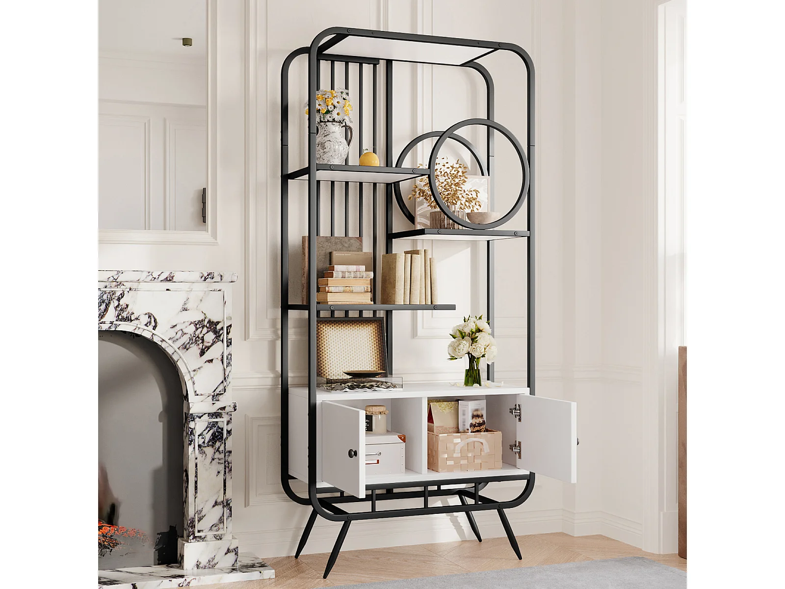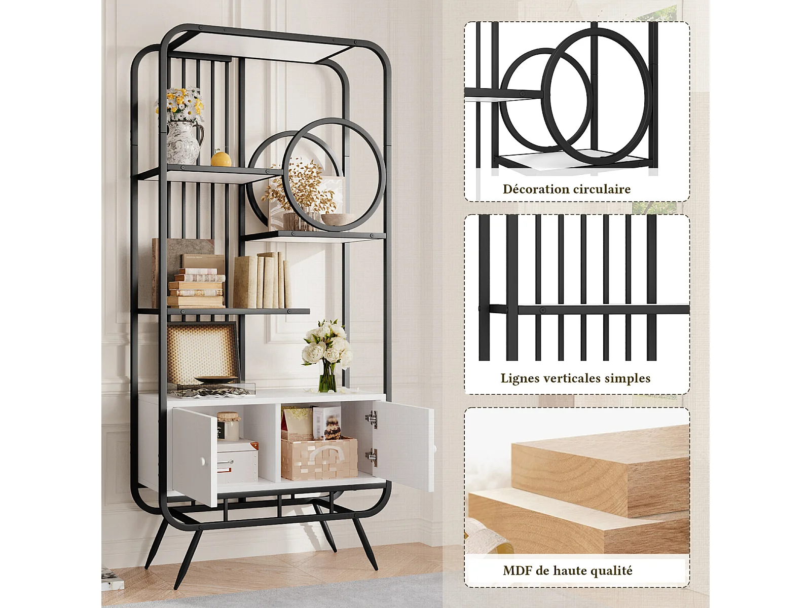 Étagère à 6 niveaux - structure géométrique, décor circulaire - 80 x 30 x 180 cm - noir et blanc