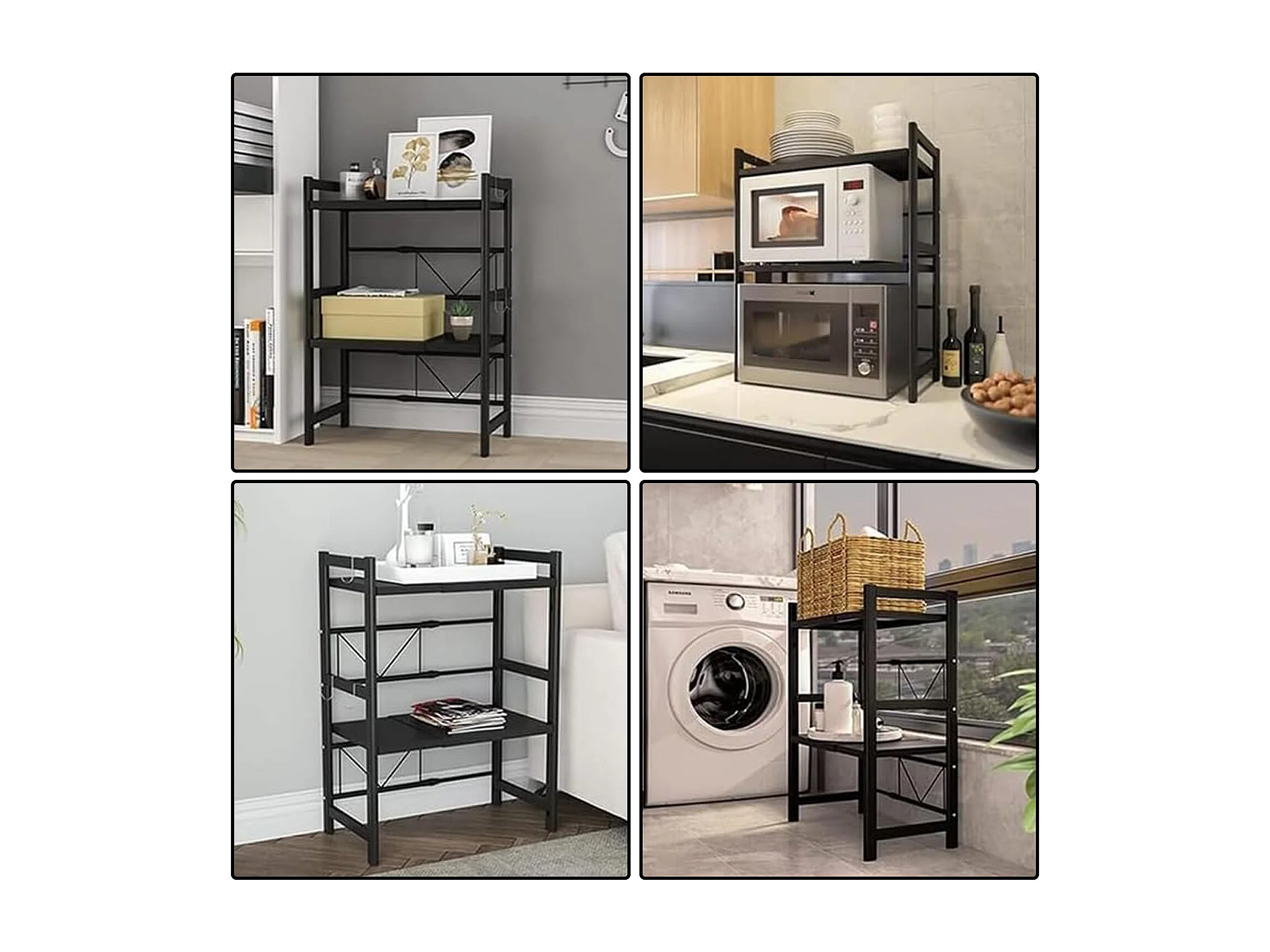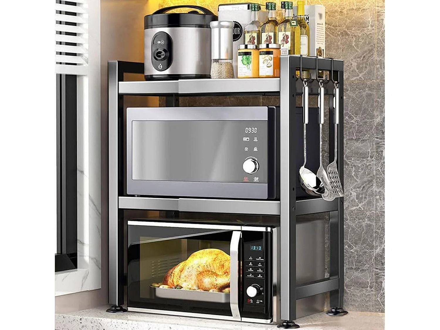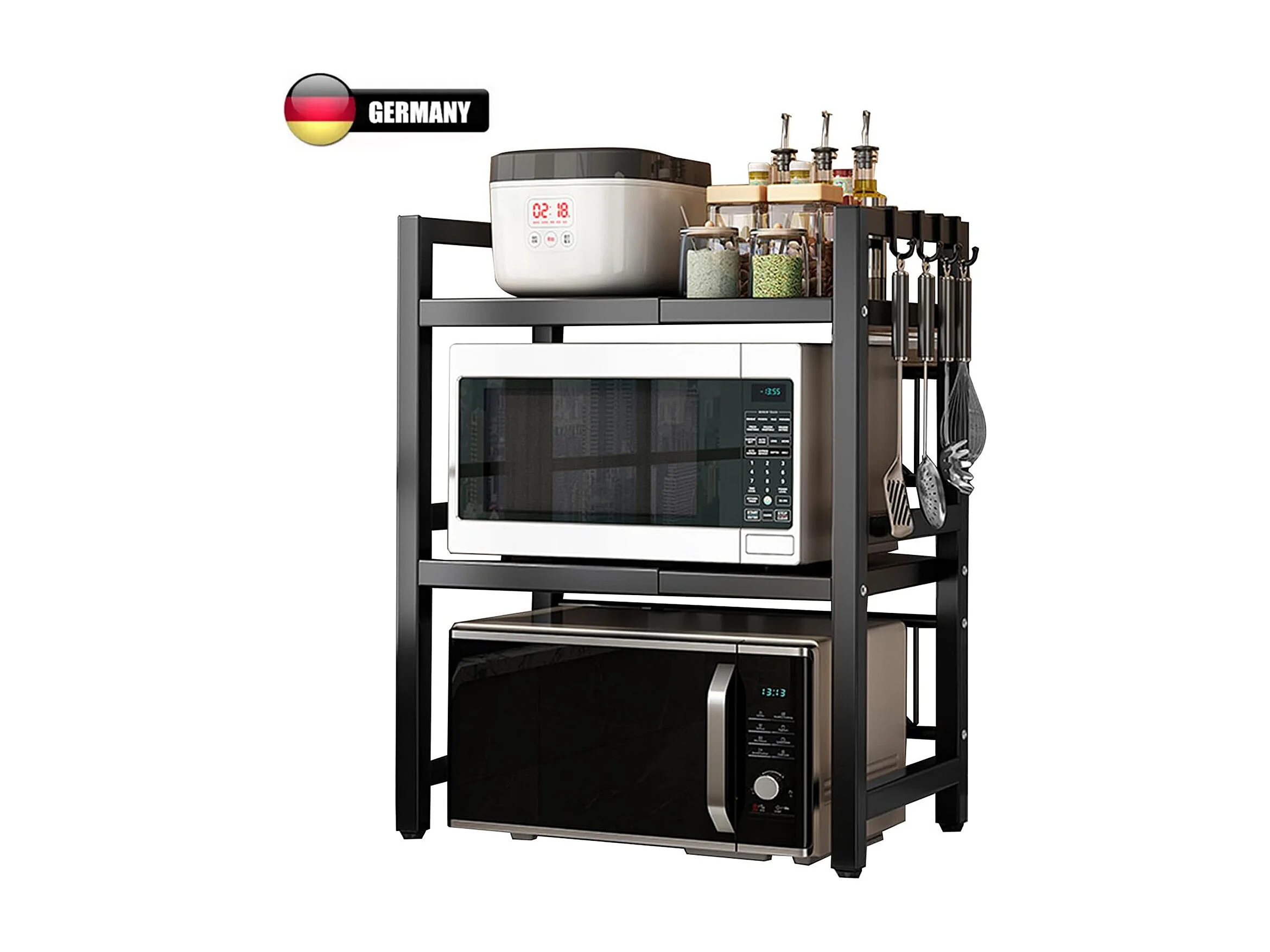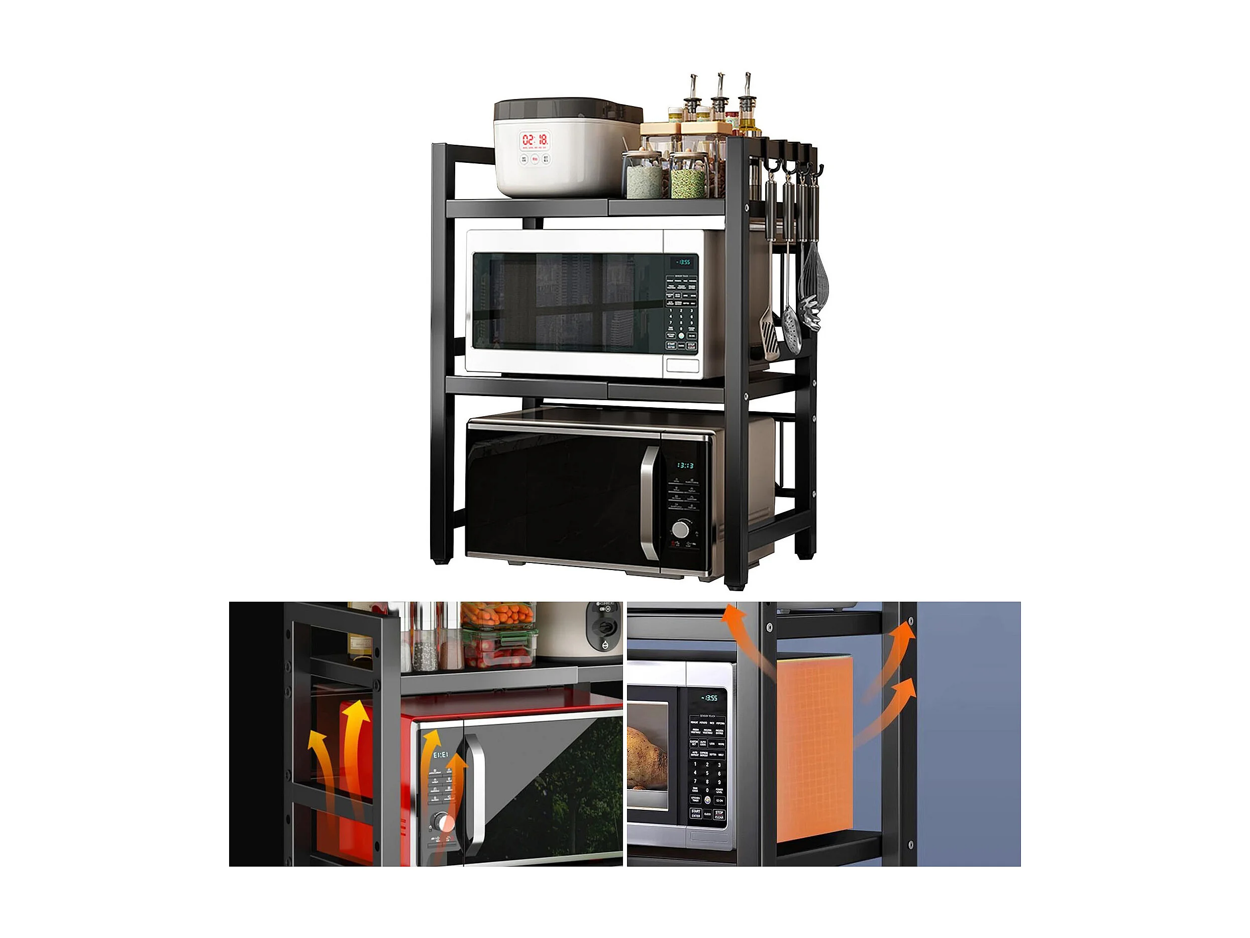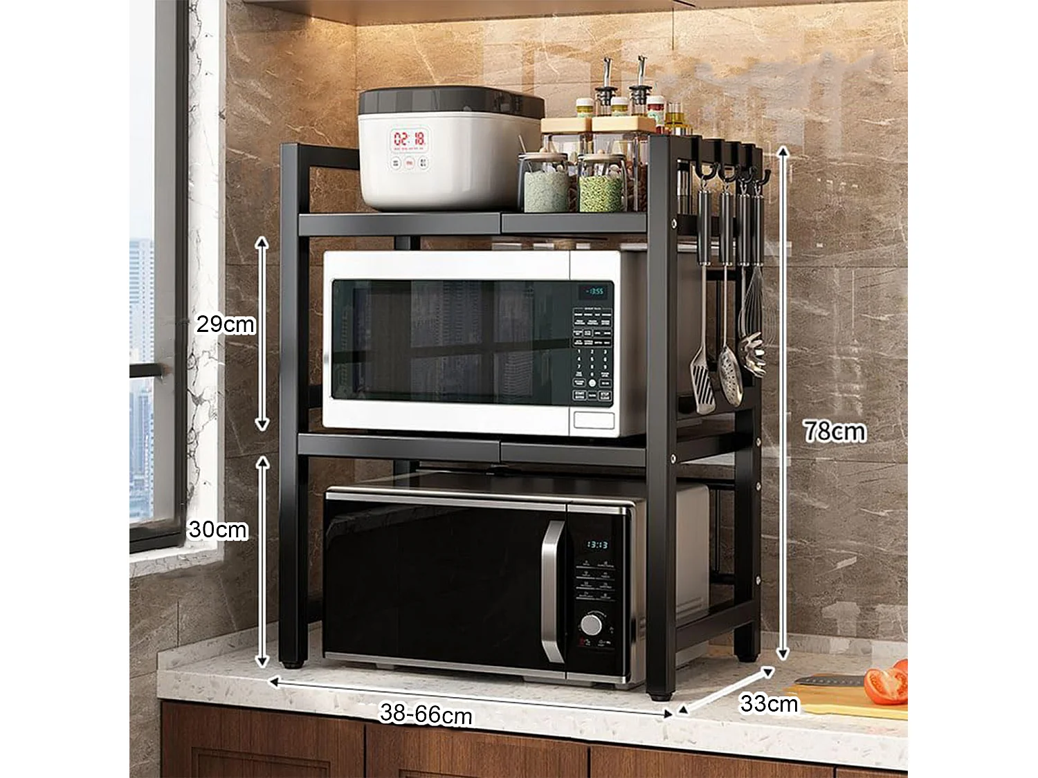 Étagère de rangement de cuisine en métal noir - double niveau extensible + 6 crochets